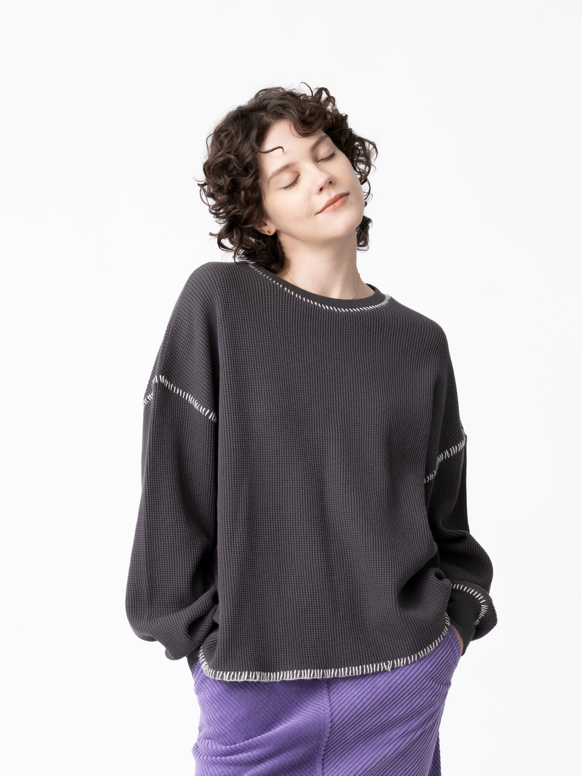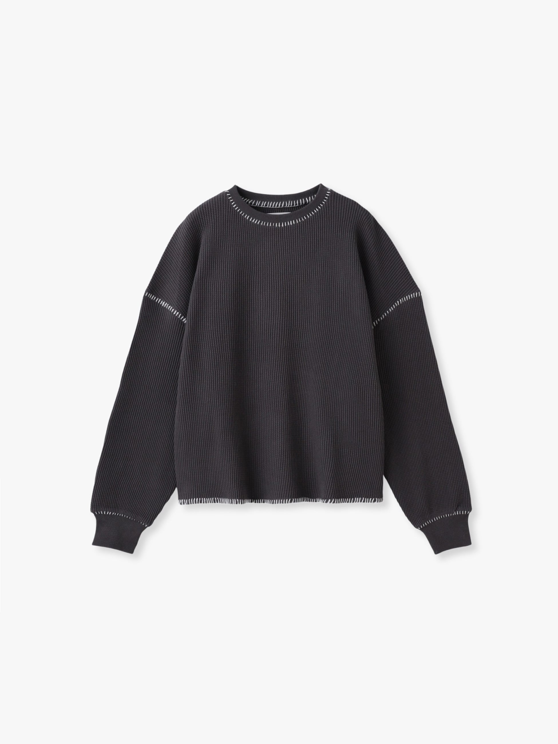 - さらっとしたドライな肌触りと、ふっくらとした風合いが特徴のオープンエンド糸を使用したワッフル素材のプルオーバーは、ラフなシルエットでストレスフリーな着心地です。季節の変わり目にも活躍し、存在感のあるブランケットステッチが、スタイリングにアクセントを添える一枚です。