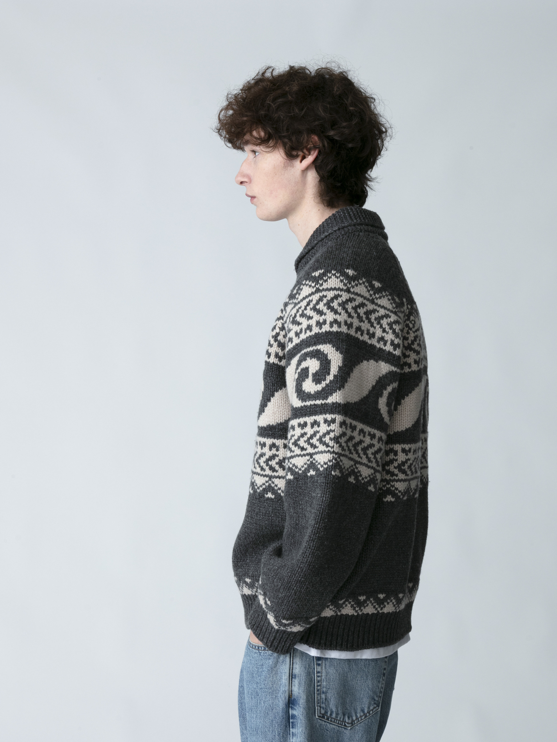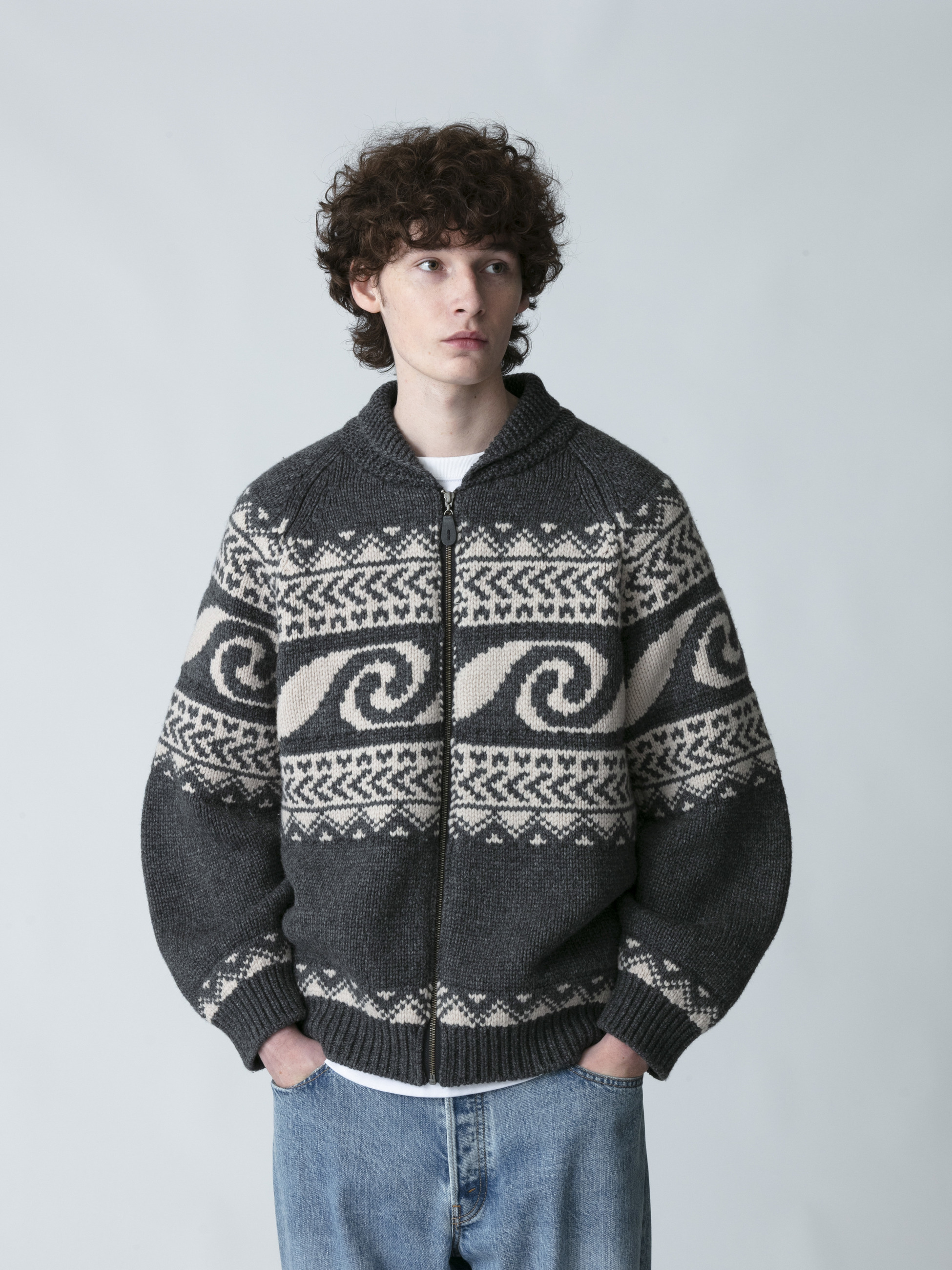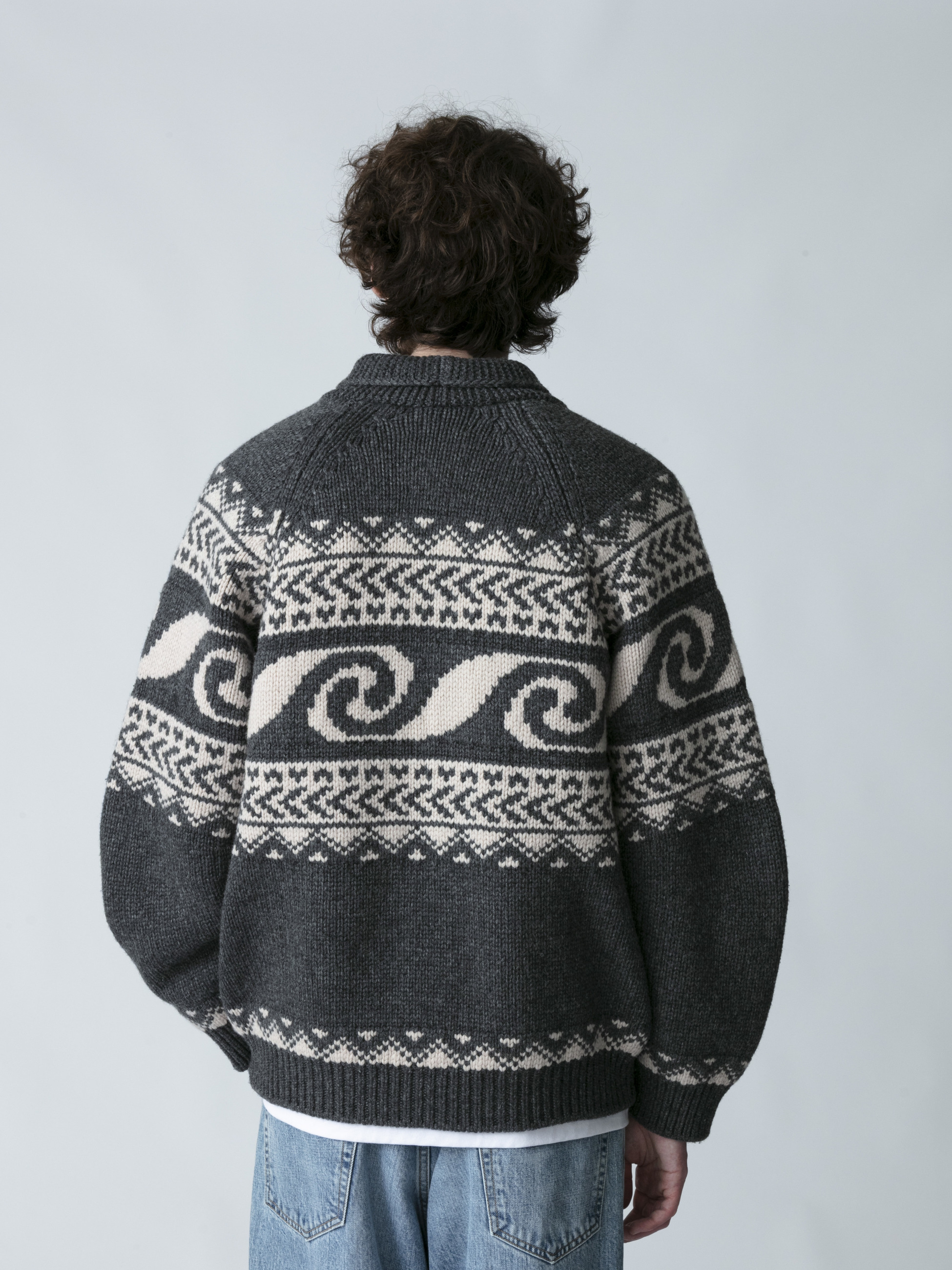 - 上質なウールとカシミアを混紡したカウチンニットカーディガン。オリジナルで製作されたウェーブパターンをジャカード織りで表現したデザインは、優れた技術力を持つ新潟県のニッターによって編まれています。また、非常に柔らかな肌触りや厚みのある生地感は、快適な着心地を実現しています。さらに、襟前端に配した変形ケーブルやレザーで製作されたオリジナルのブランドネームとファスナーの引手にもレザーを使用した細部まで拘ったつくりも魅力のひとつ。ゆったりとしたフィットは、デイリーユースしやすい一着です。