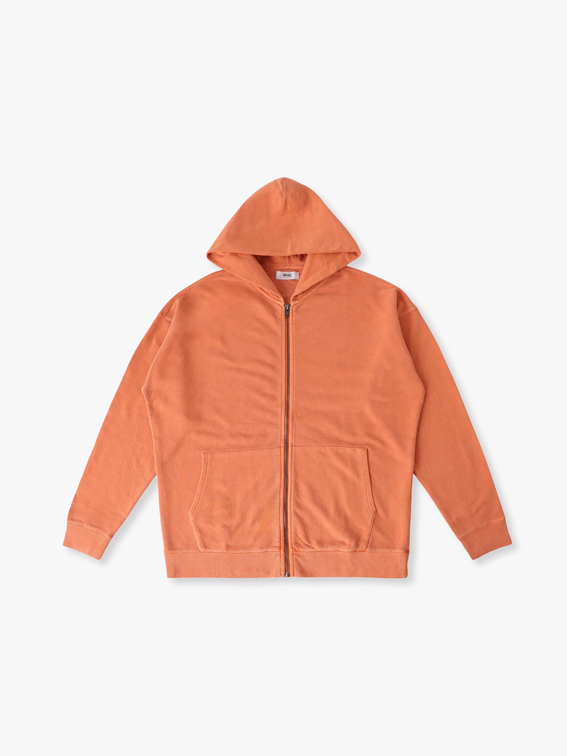 - オリジナルで製作した非常に柔らかな裏毛素材を使用したスウェットジップフーディー。ピグメント加工とバイオウォッシュ加工を施したヴィンテージのようなフェードしたカラーリングとふうわりとした風合いが特徴です。身幅にゆとりを持たせたゆったりとしたフィットは、デイリーユースしやすい一着です。