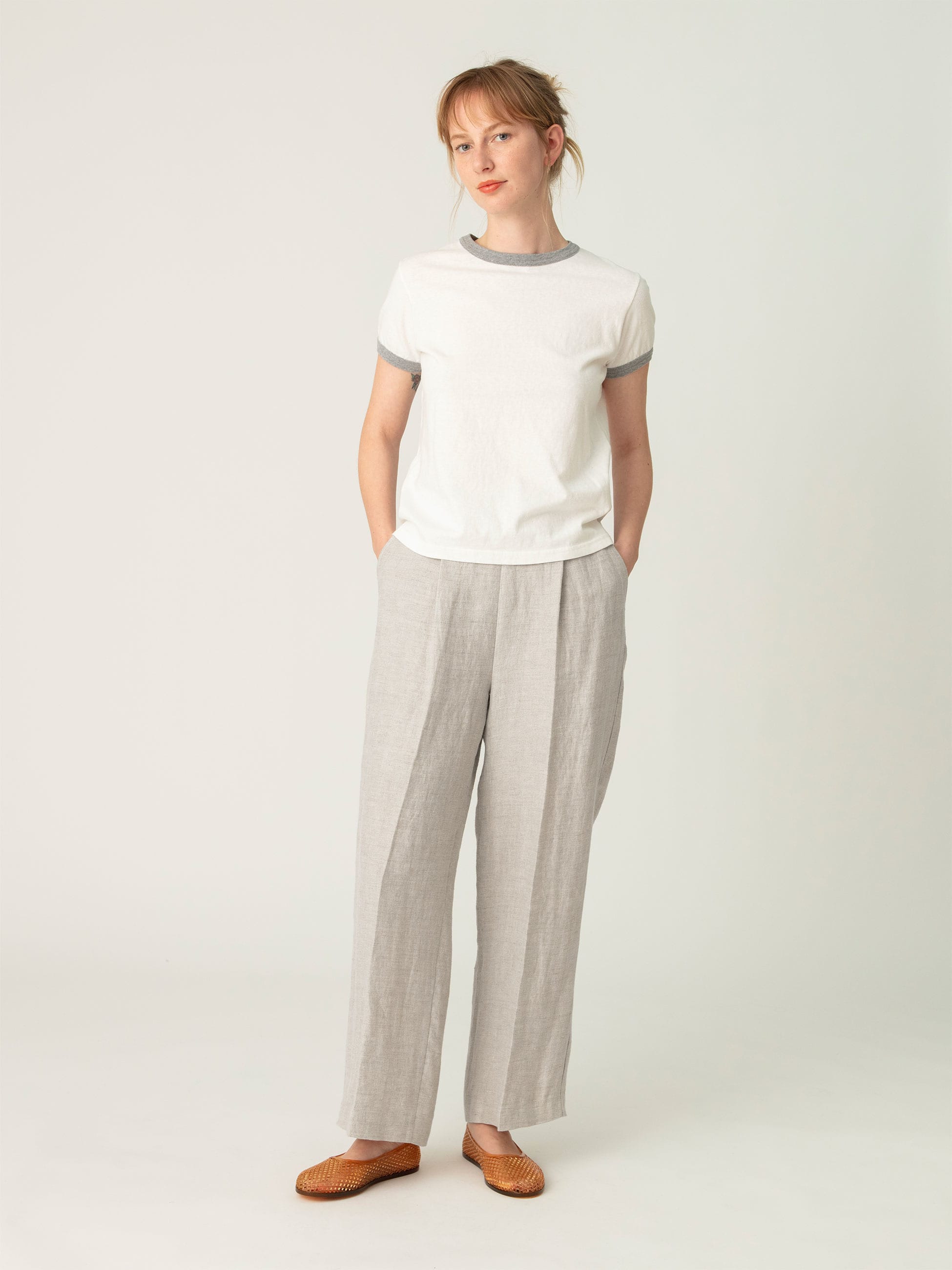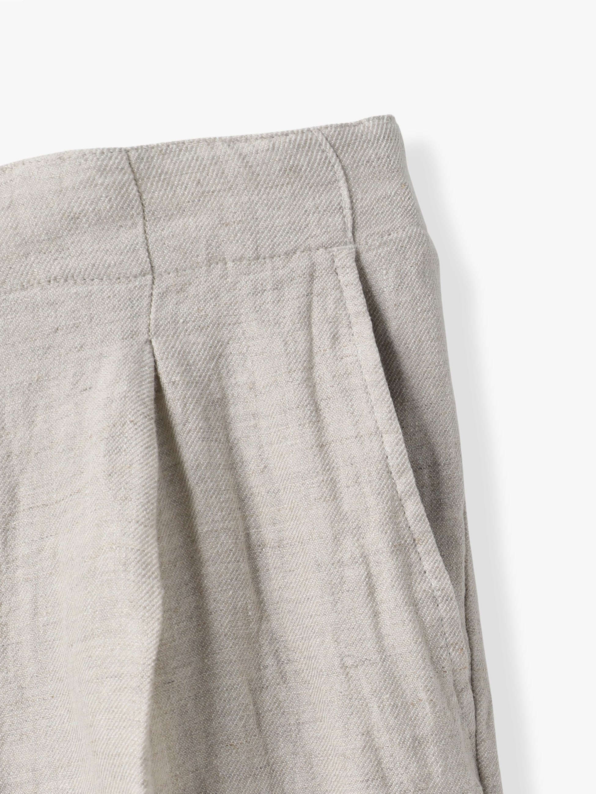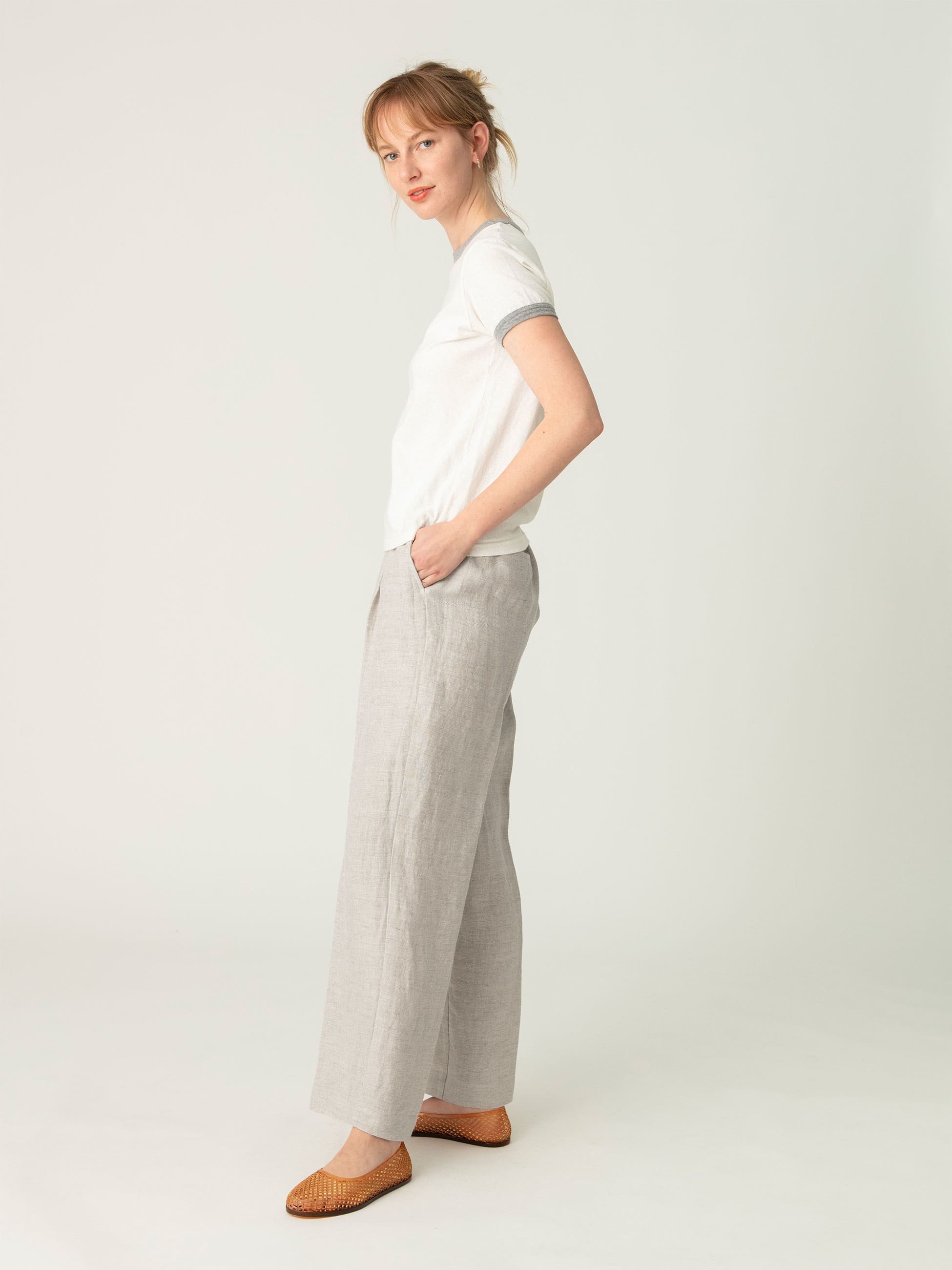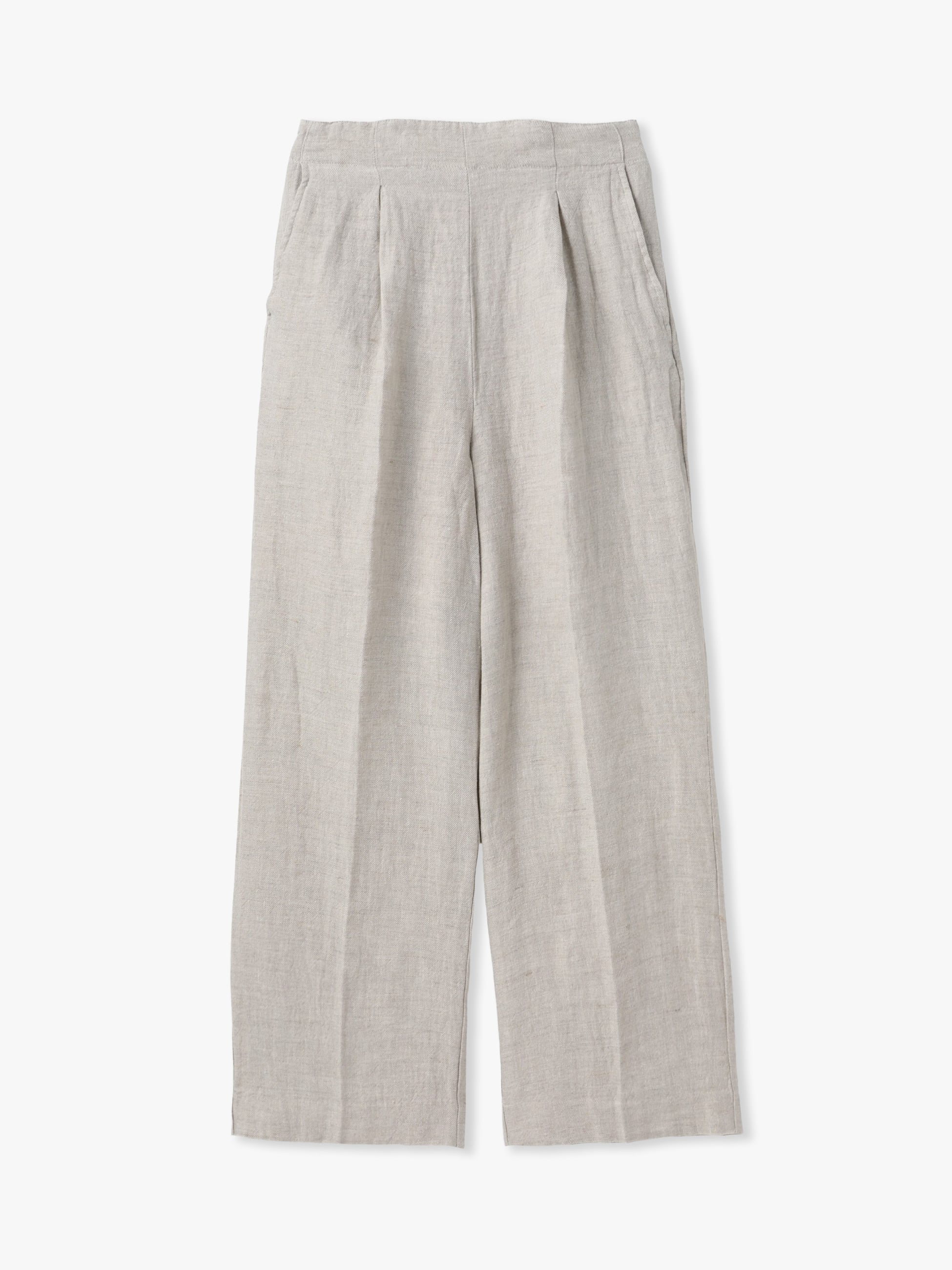- 軽やかでゆったりとしたシルエットのリネンパンツは、涼しげで抜け感がありながらも、ウエストのバックはゴム仕様にし、フロントはゴムを寄せずにすっきりと見せることで、ラフな雰囲気に綺麗めなエッセンスをプラスしています。同シリーズのジャケットとのセットアップも様になります。