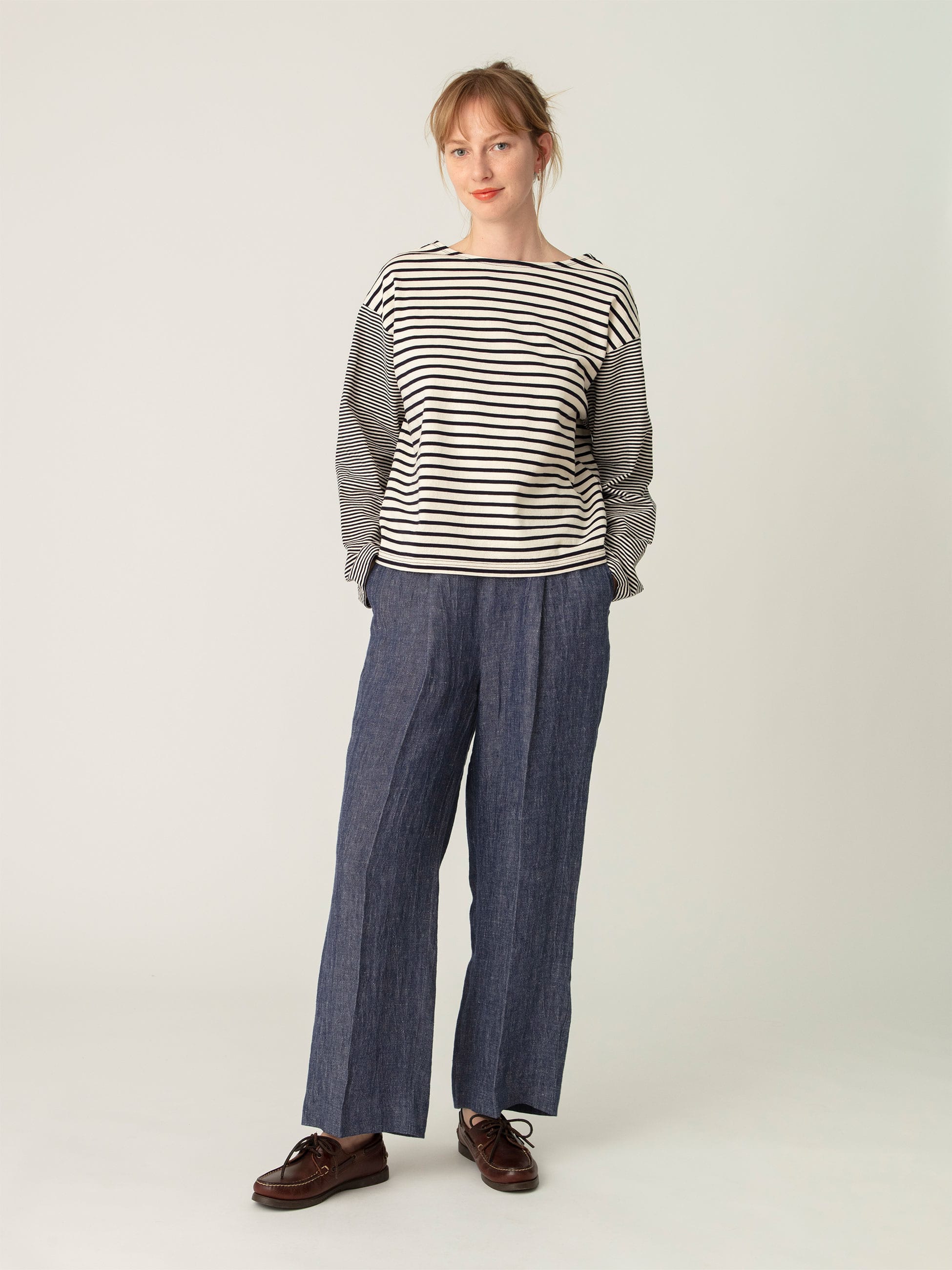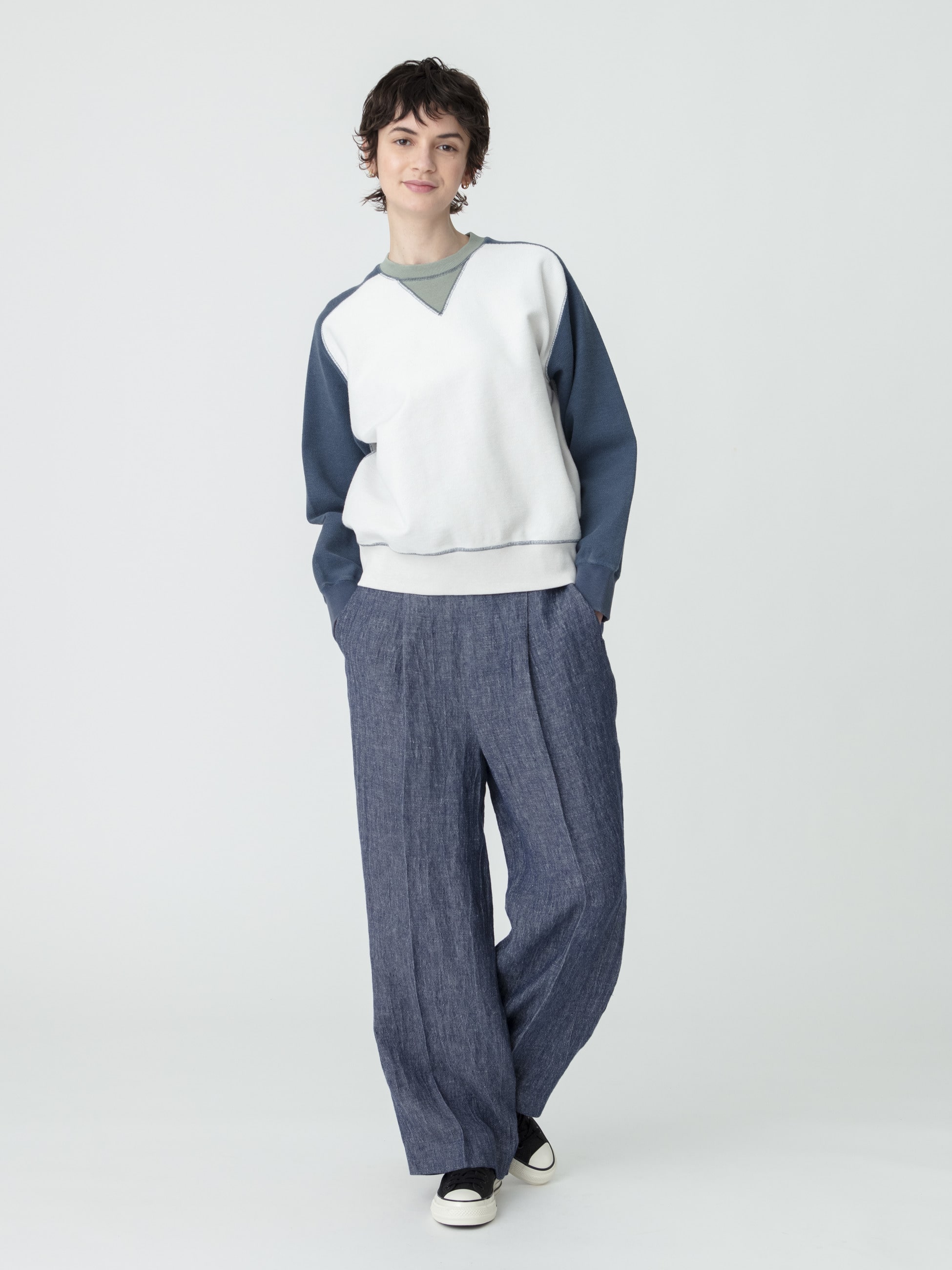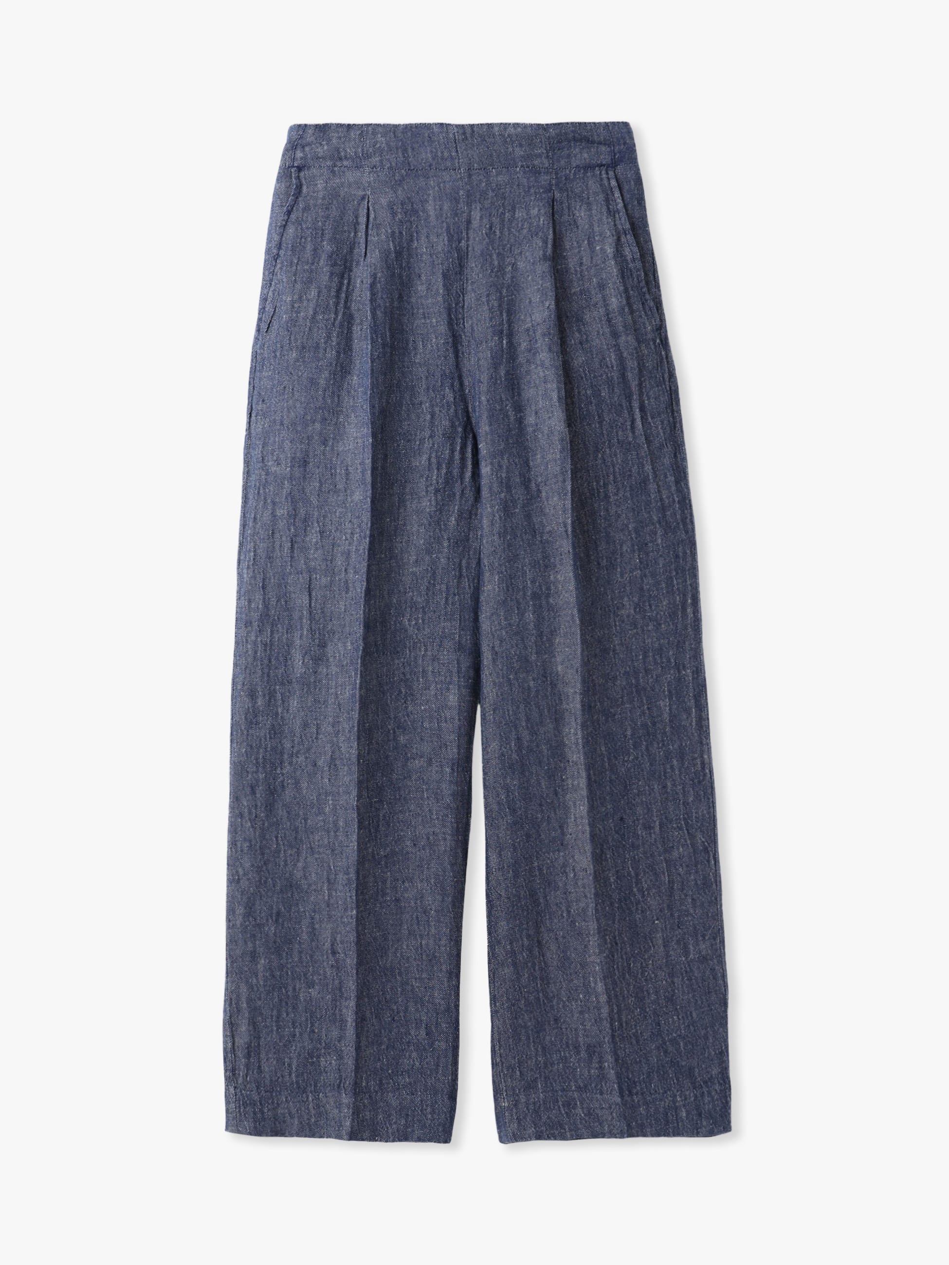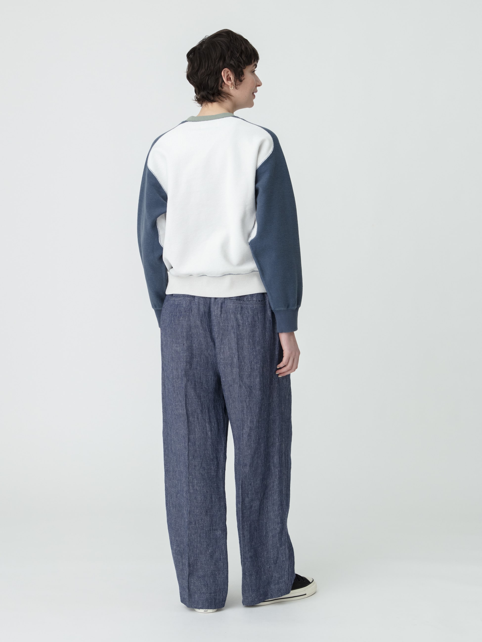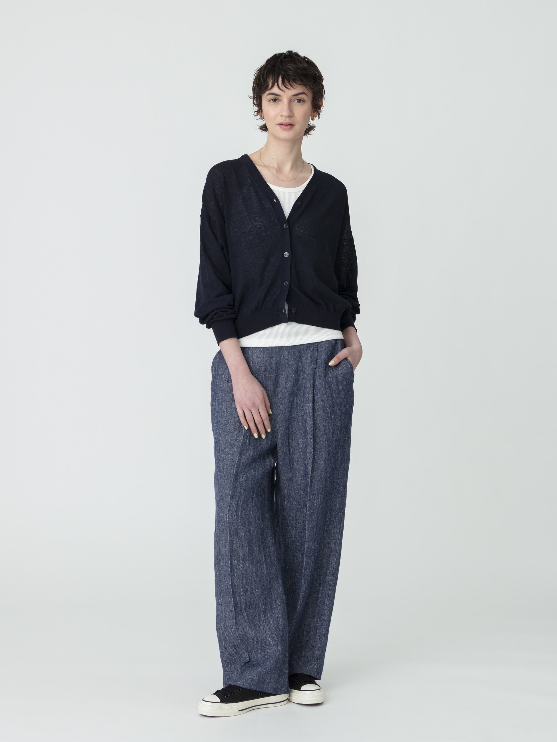 - 軽やかでゆったりとしたシルエットのリネンパンツは、涼しげで抜け感がありながらも、ウエストのバックはゴム仕様にし、フロントはゴムを寄せずにすっきりと見せることで、ラフな雰囲気に綺麗めなエッセンスをプラスしています。同シリーズのジャケットとのセットアップも様になります。