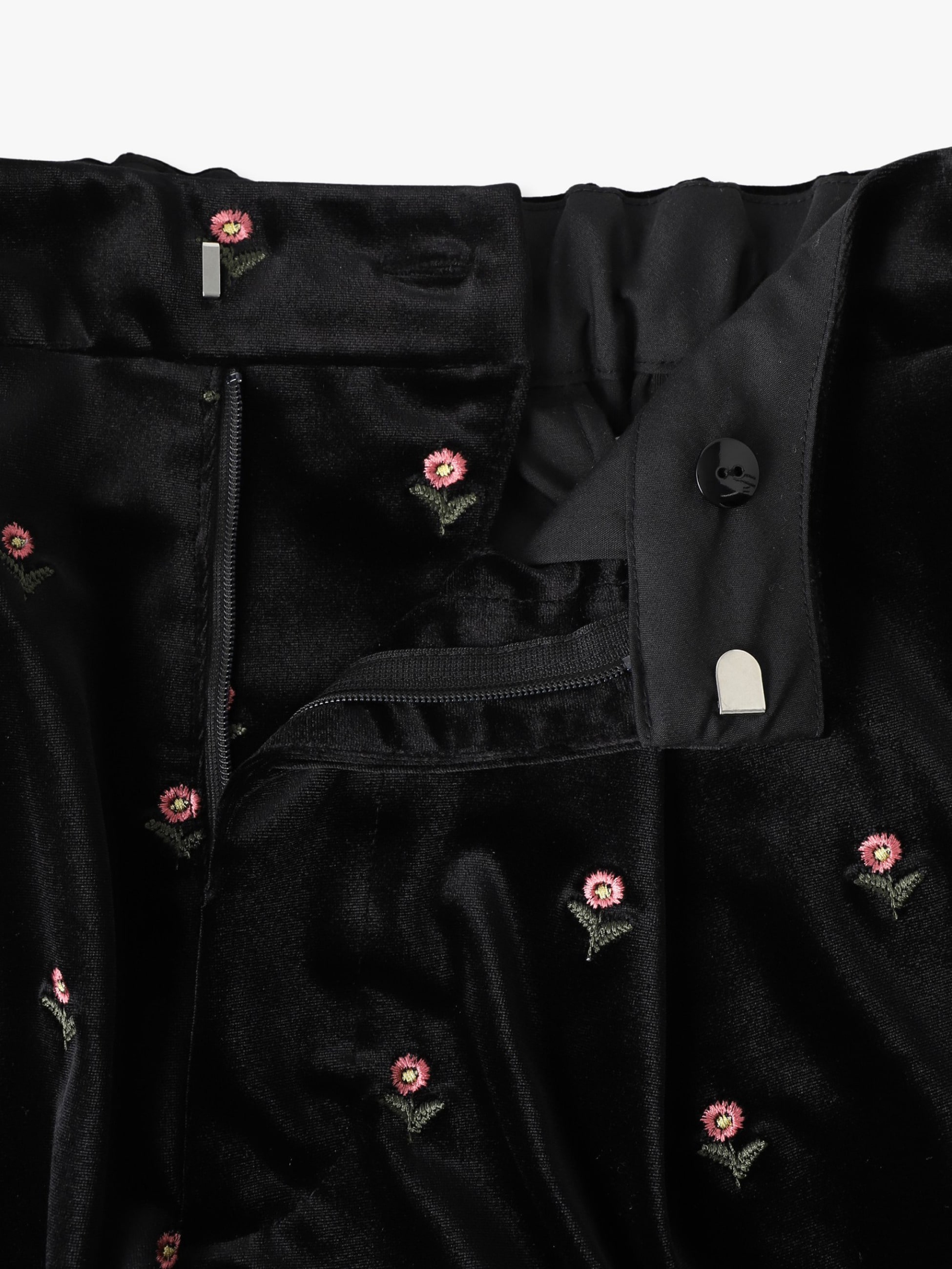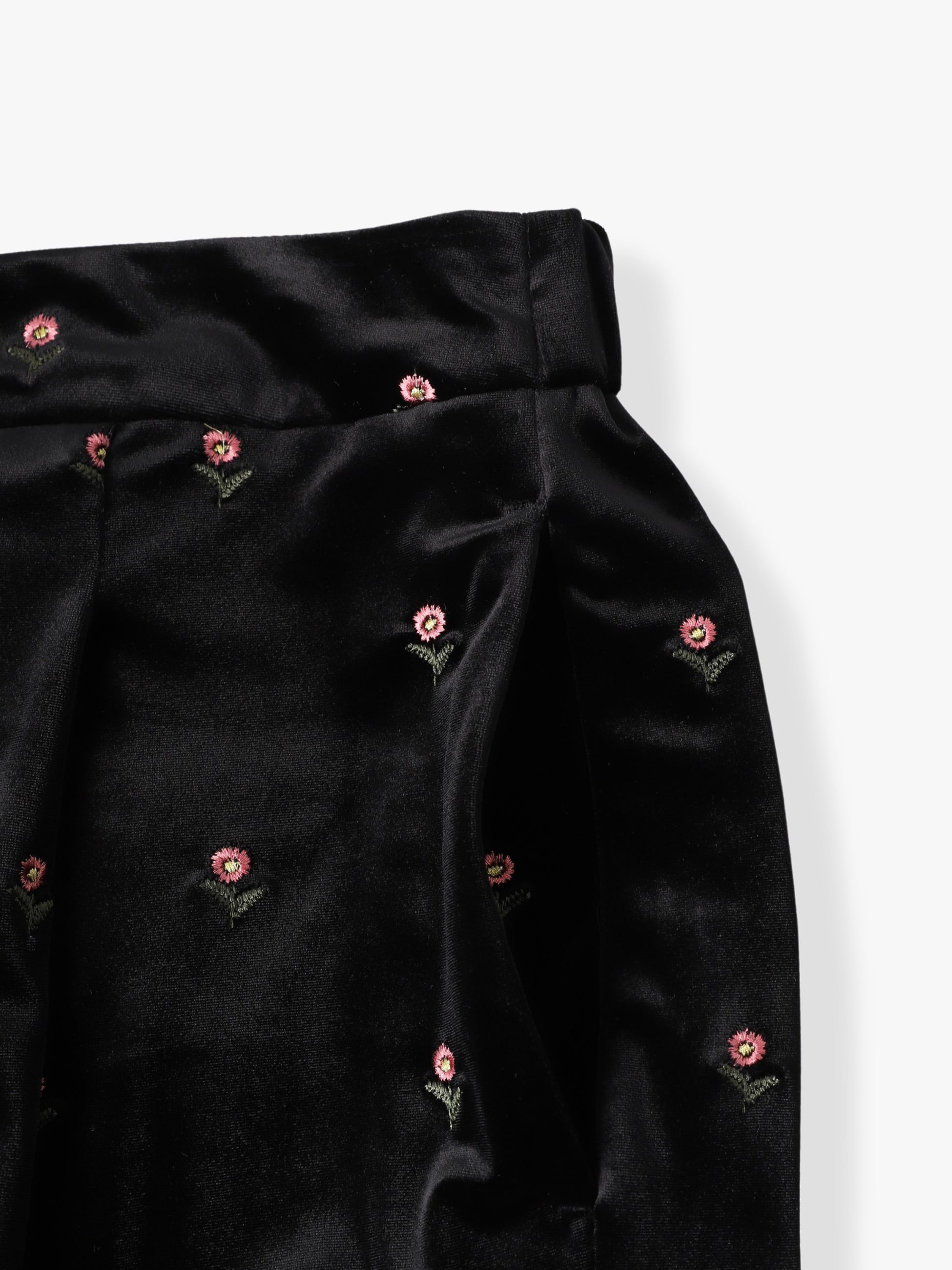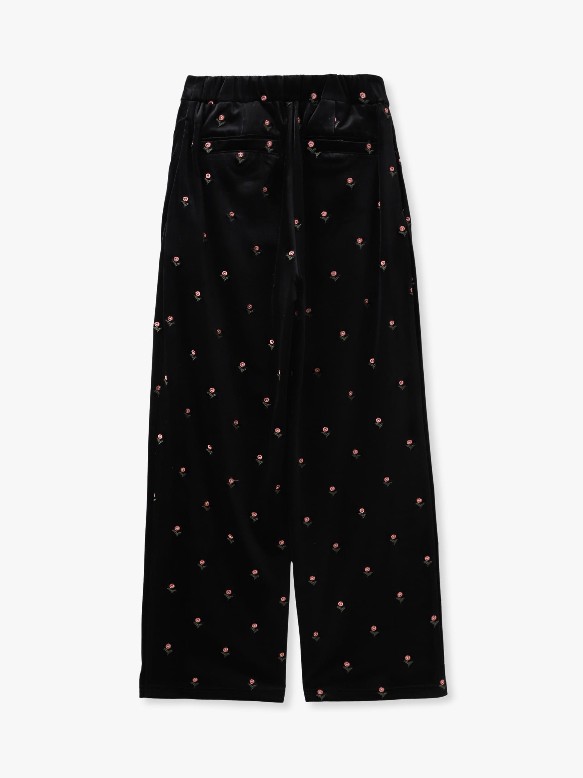 落ち着いた光沢のベロア素材に、オリジナルのデイジー刺繍を施した可愛らしい印象のパンツは、リラックス感のある穿き心地で、シンプルなトップスを合わせるだけで、どこか特別感のある装いに。フロントタックのディティールで、きちんと感のあるシルエットを引き立てます。同シリーズのスリーブレスドレスもございます。