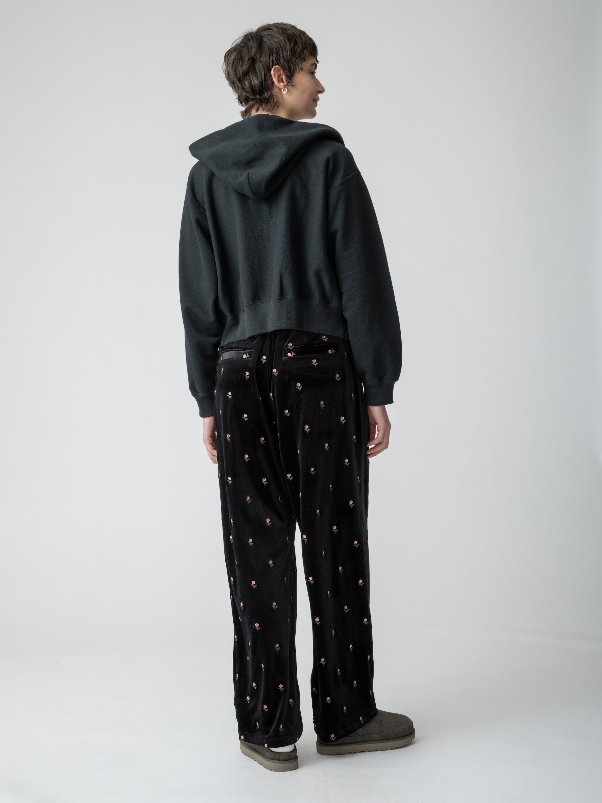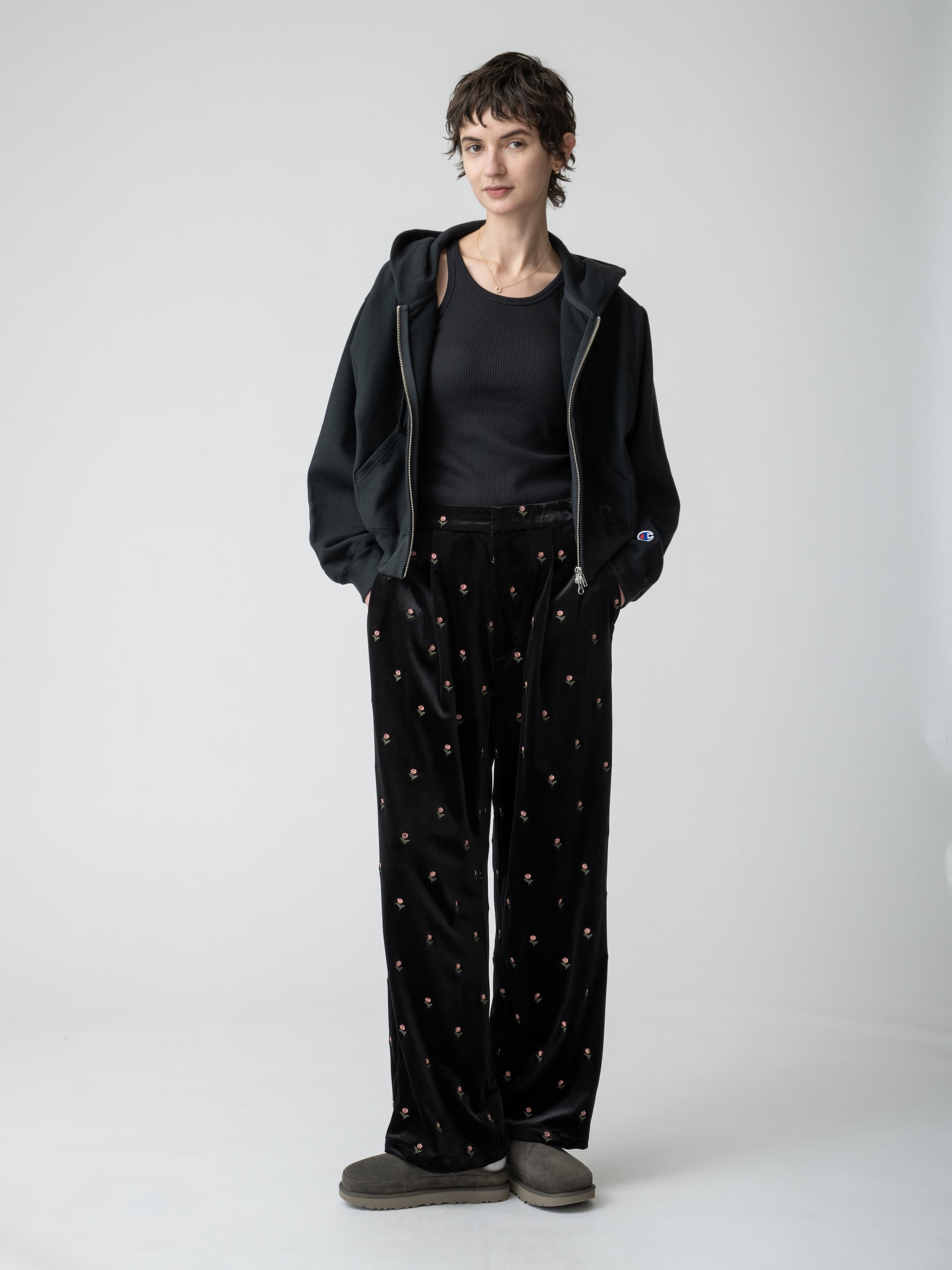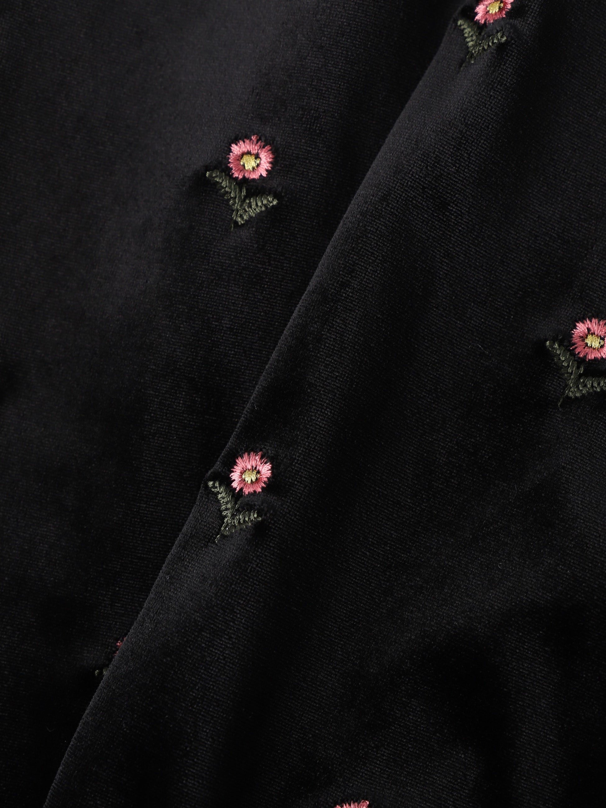 落ち着いた光沢のベロア素材に、オリジナルのデイジー刺繍を施した可愛らしい印象のパンツは、リラックス感のある穿き心地で、シンプルなトップスを合わせるだけで、どこか特別感のある装いに。フロントタックのディティールで、きちんと感のあるシルエットを引き立てます。同シリーズのスリーブレスドレスもございます。