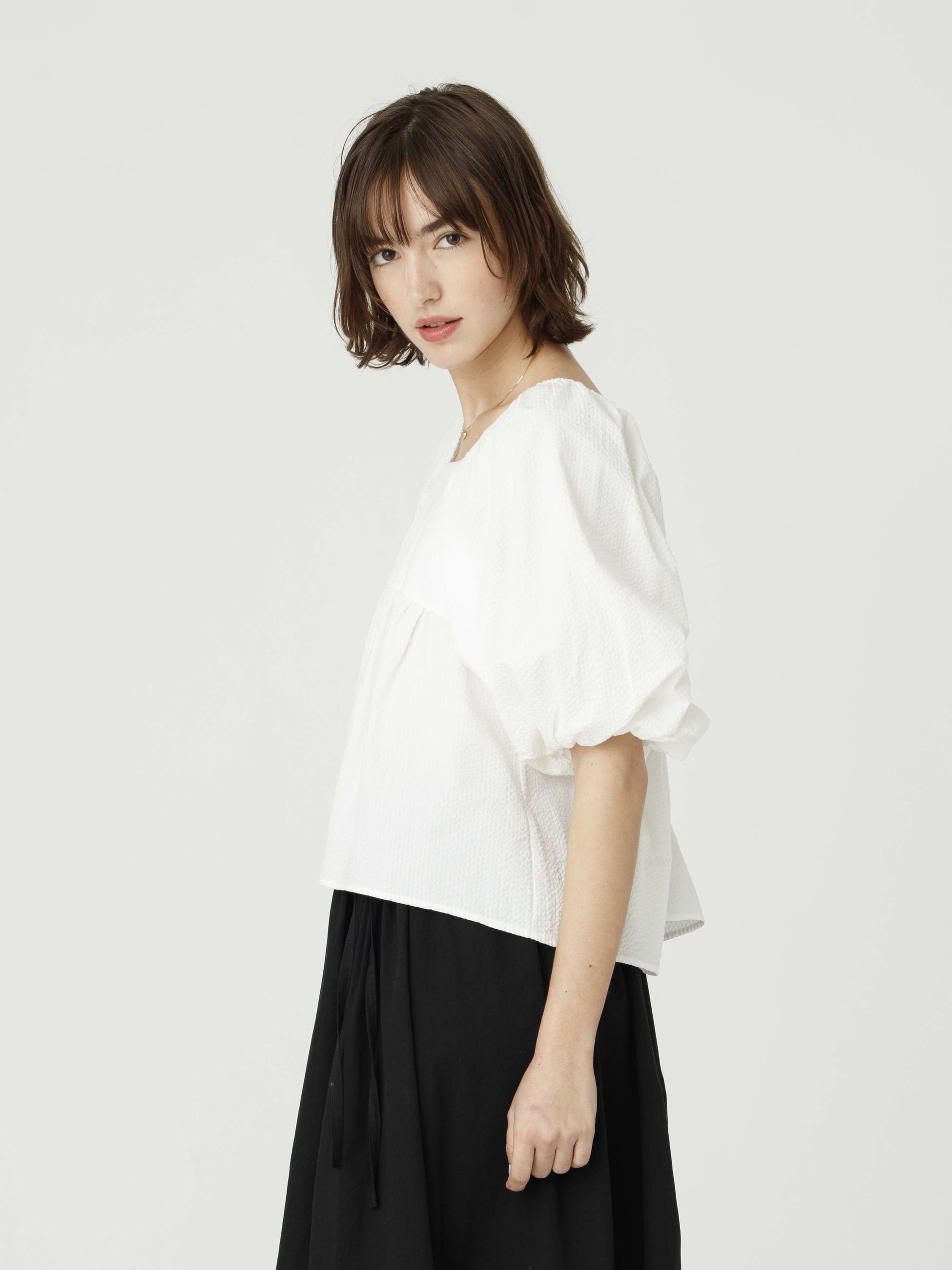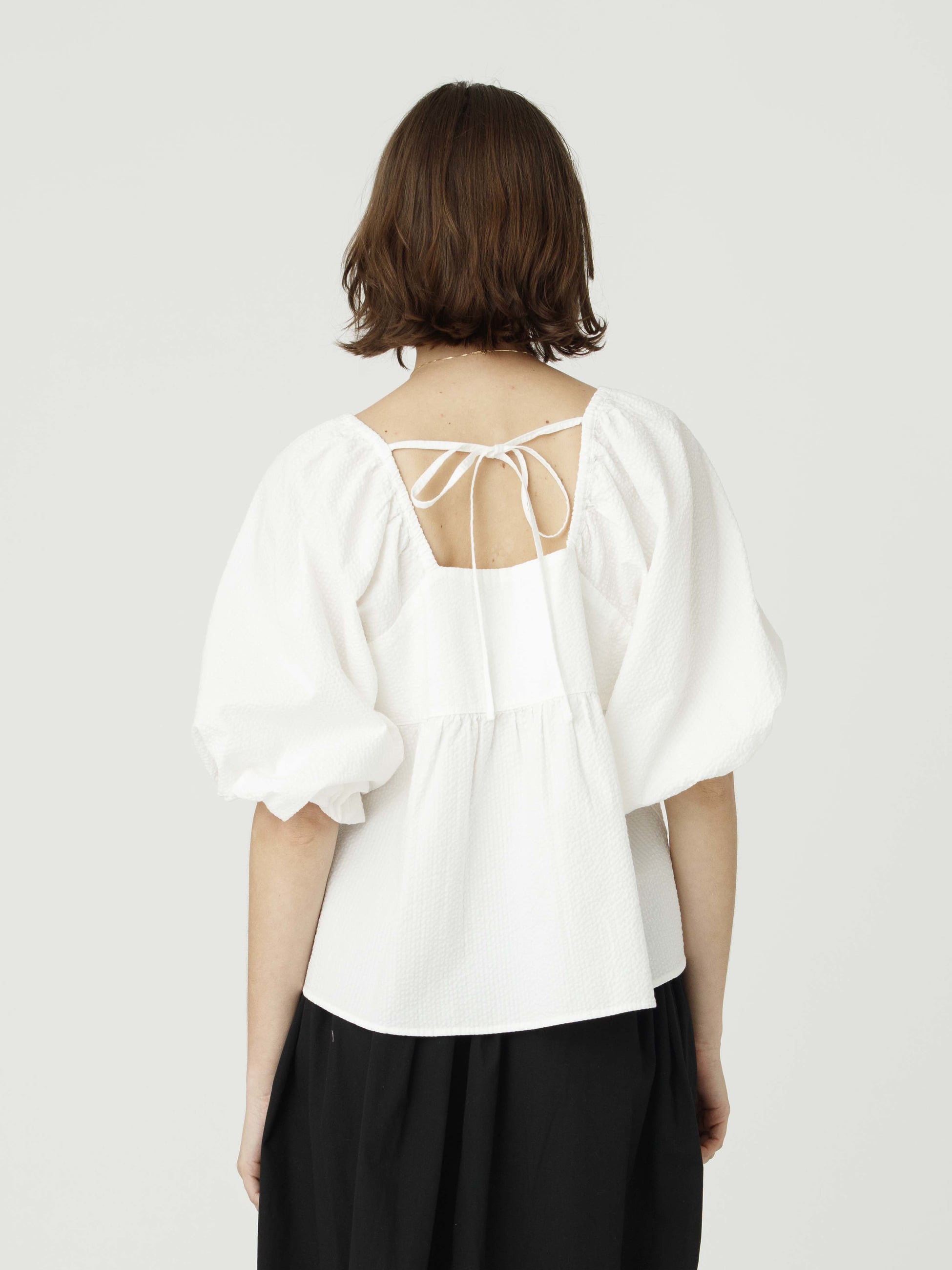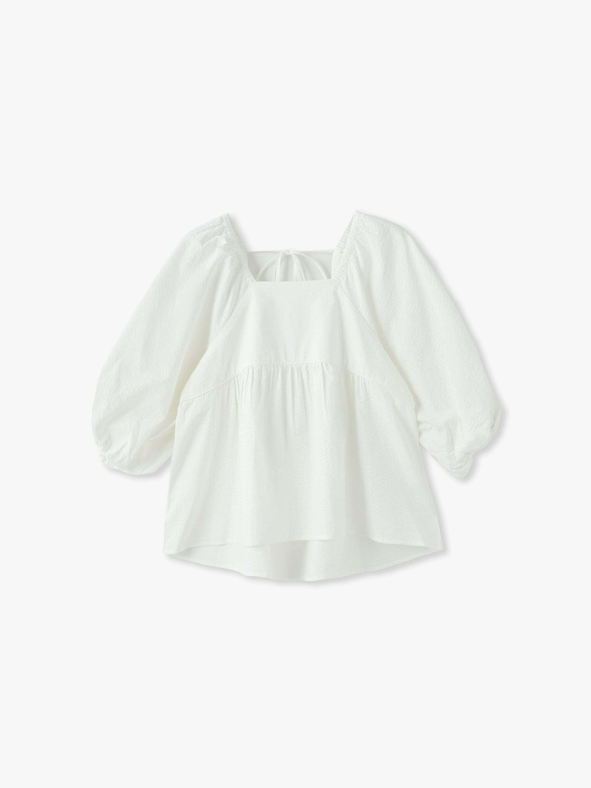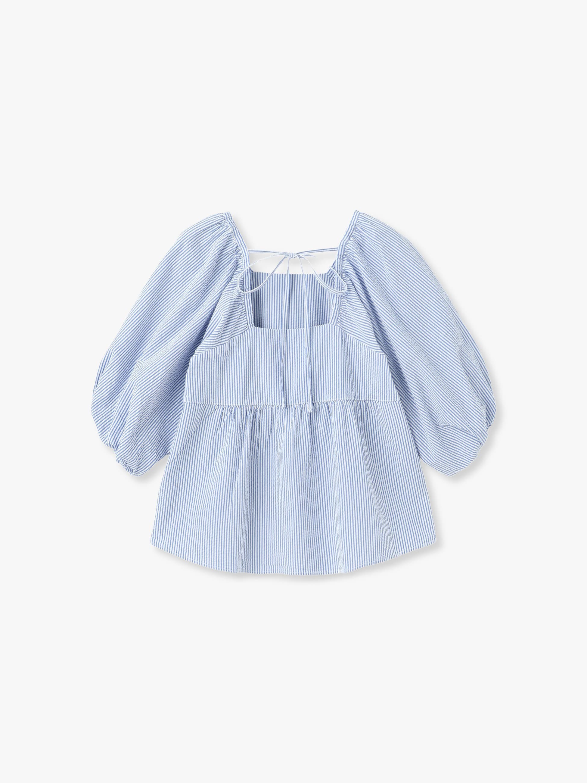 - 汗ばむ季節にぴったりな、軽やかで通気性に優れたシアサッカー生地のブラウスです。袖や裾のふんわりとしたシルエットが可愛らしく、後ろ姿も映えるバックリボンもデザインポイントです。短めの着丈でボトムスとのバランスも取りやすく、コーディネートに華やかさを持たせたいときにぴったりな1枚です。同素材のオールインワンもございます。