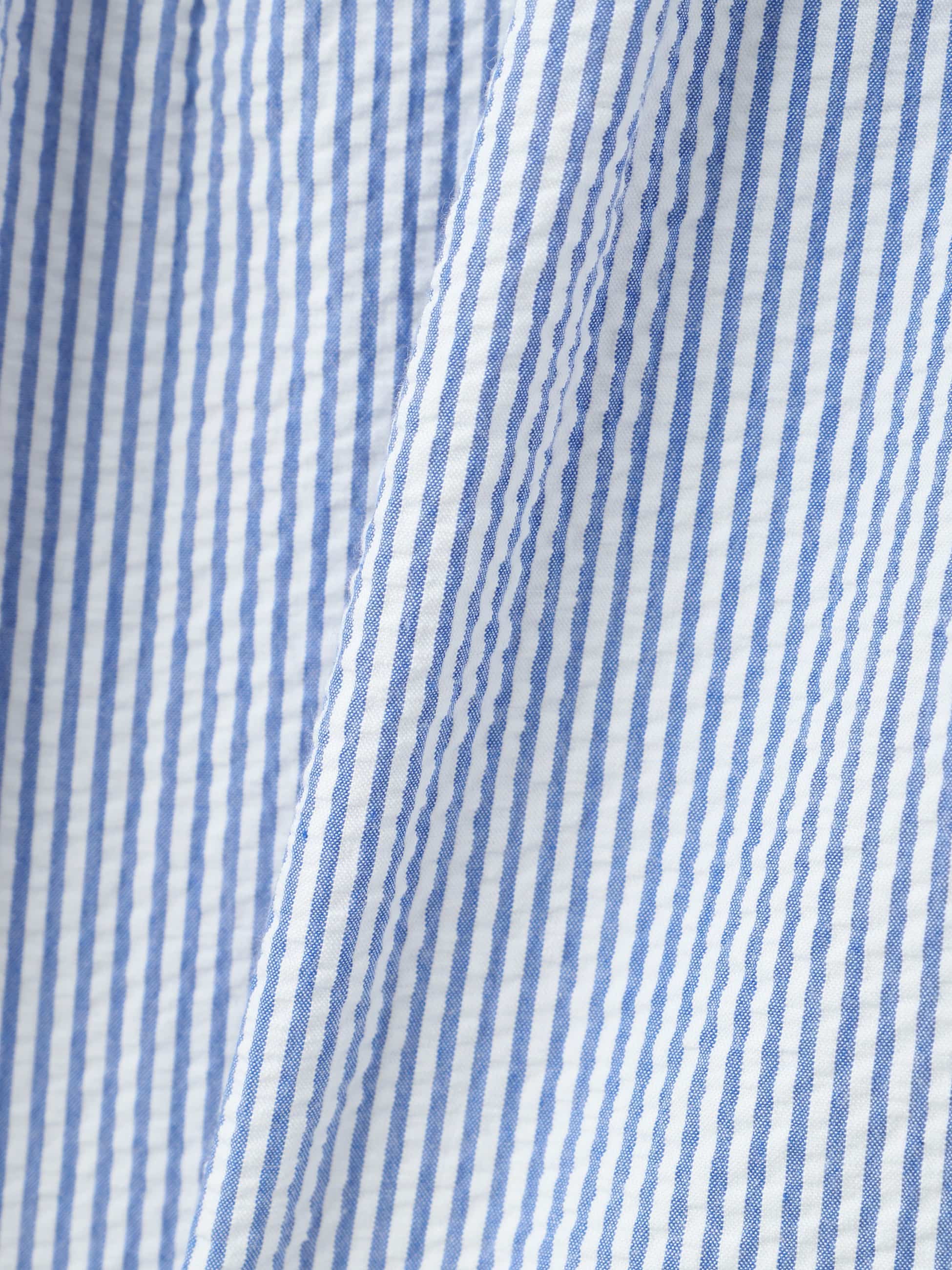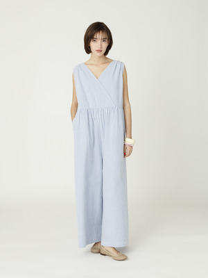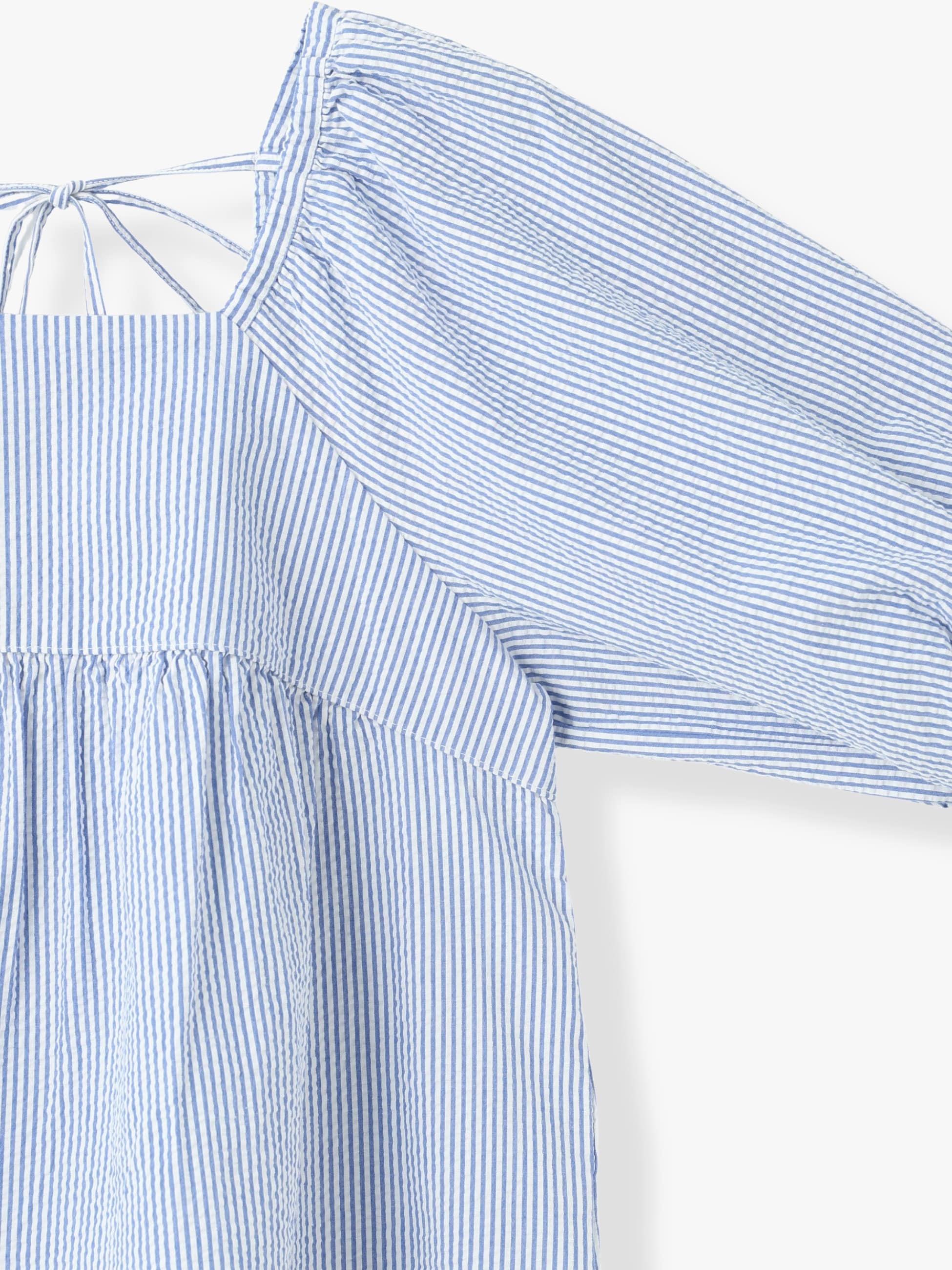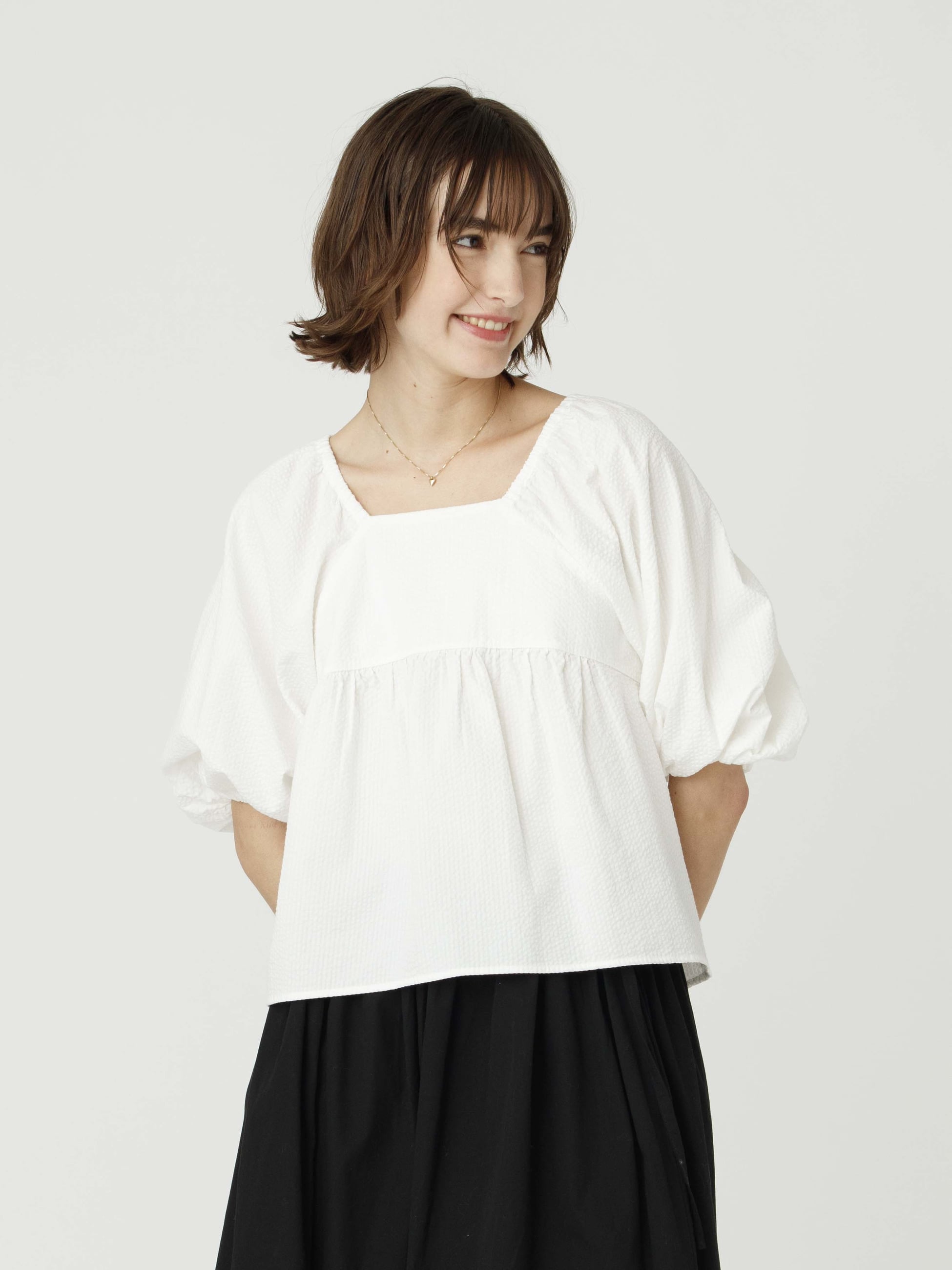 - 汗ばむ季節にぴったりな、軽やかで通気性に優れたシアサッカー生地のブラウスです。袖や裾のふんわりとしたシルエットが可愛らしく、後ろ姿も映えるバックリボンもデザインポイントです。短めの着丈でボトムスとのバランスも取りやすく、コーディネートに華やかさを持たせたいときにぴったりな1枚です。同素材のオールインワンもございます。