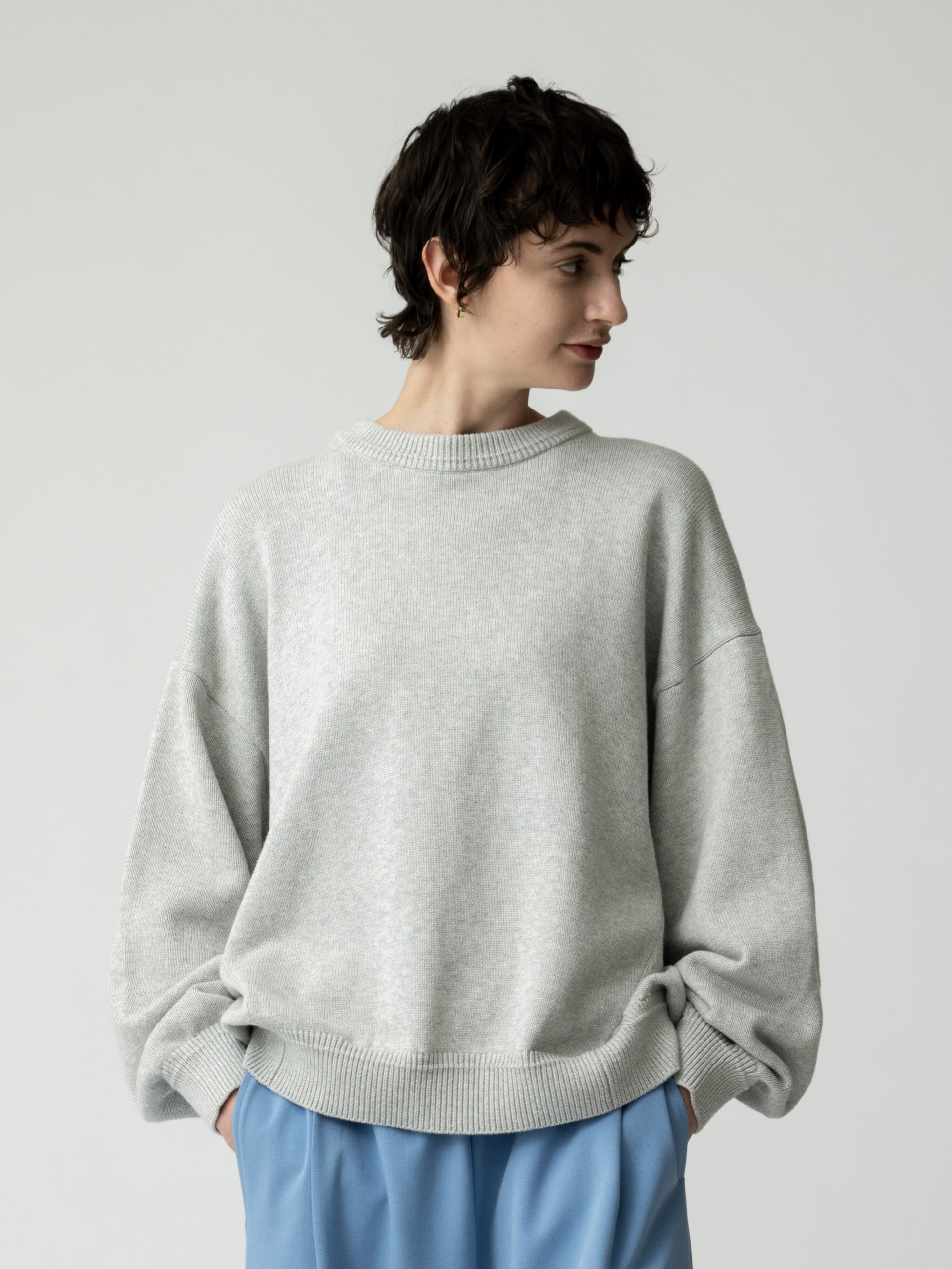ゆったりとしたリラクシーな雰囲気を醸すニットプルオーバーは、コットン100%でありながらも厚みのある編地で、インナーを変えると長いシーズンで活躍します。着丈に前後差をつけ、前脇にあしらったシームがデザインのポイントに。ボトムはスリムシルエットからボリュームのあるものまで幅広くカバーし、汎用性の高いアイテムです。