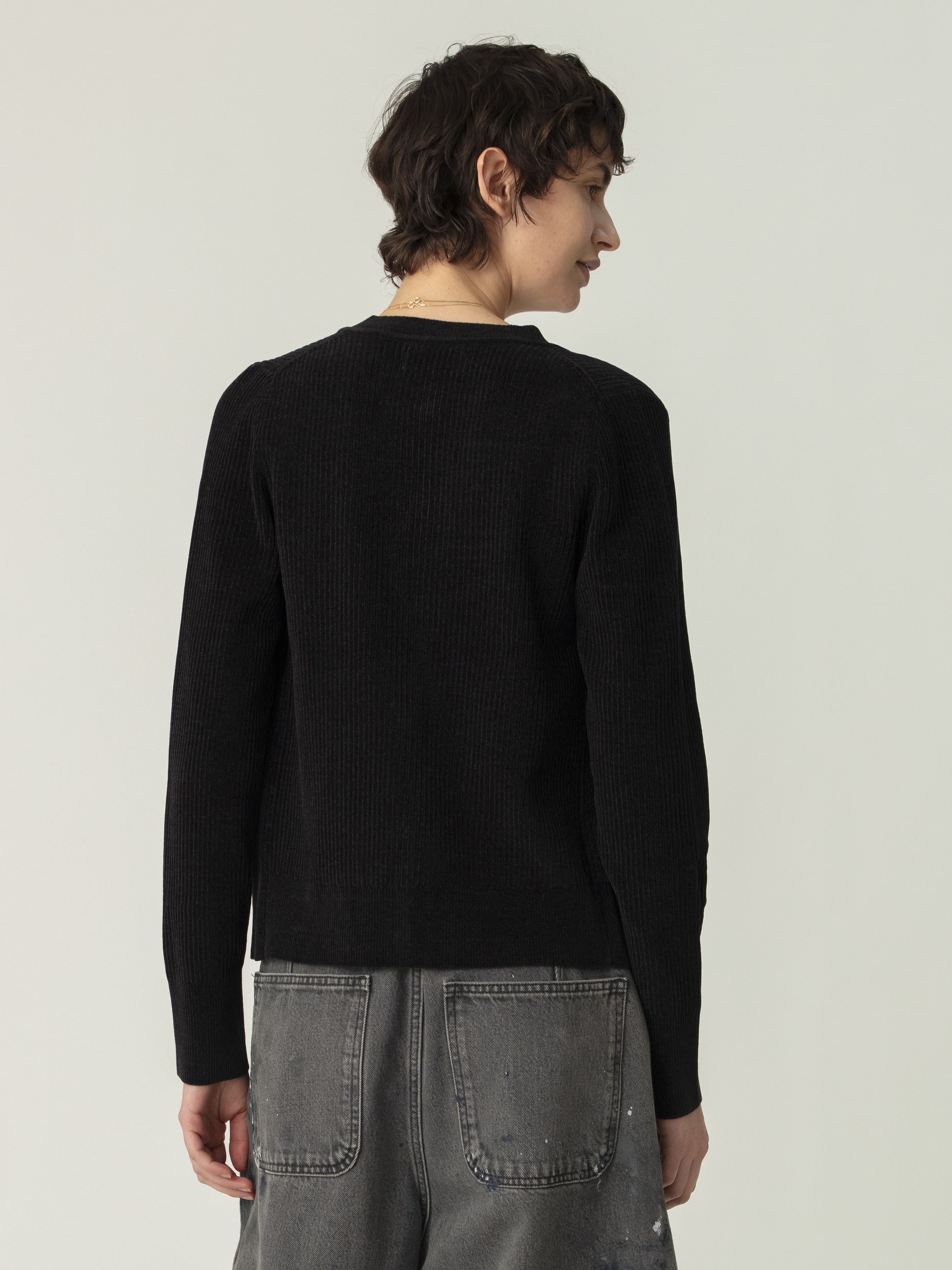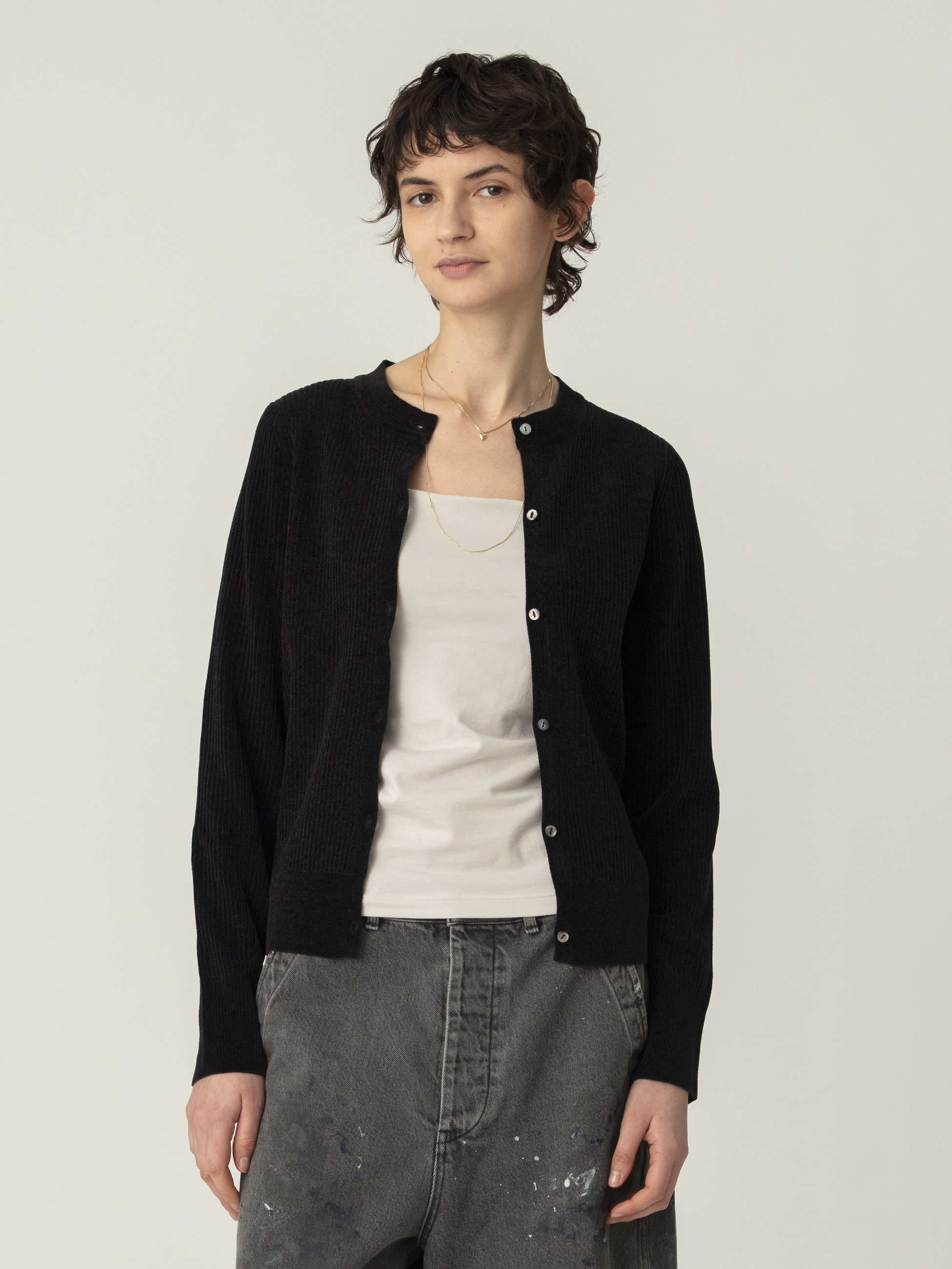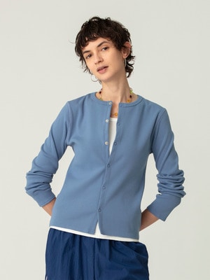 - 2025SSに好評いただいたモールカーディガンが、リブ編みにアップデートして登場です。伸縮性を高め、コンパクトでバランスの取りやすいサイズ感に仕立てました。肌寒い時期の軽い羽織りとしてはもちろん、前ボタンを閉めればプルオーバーとしても活躍します。ベーシックなブラックと春らしいライトブルーの2色展開です。