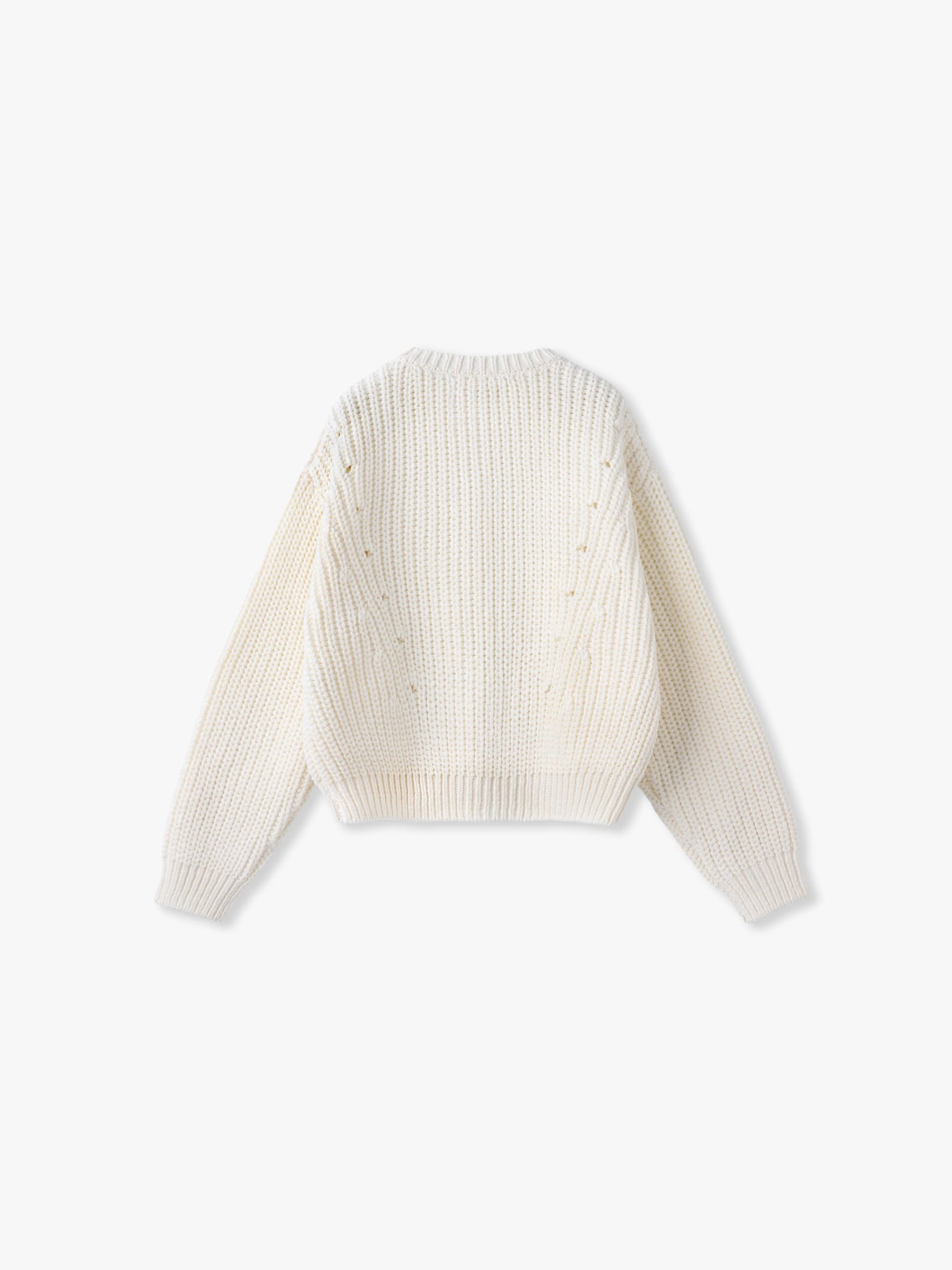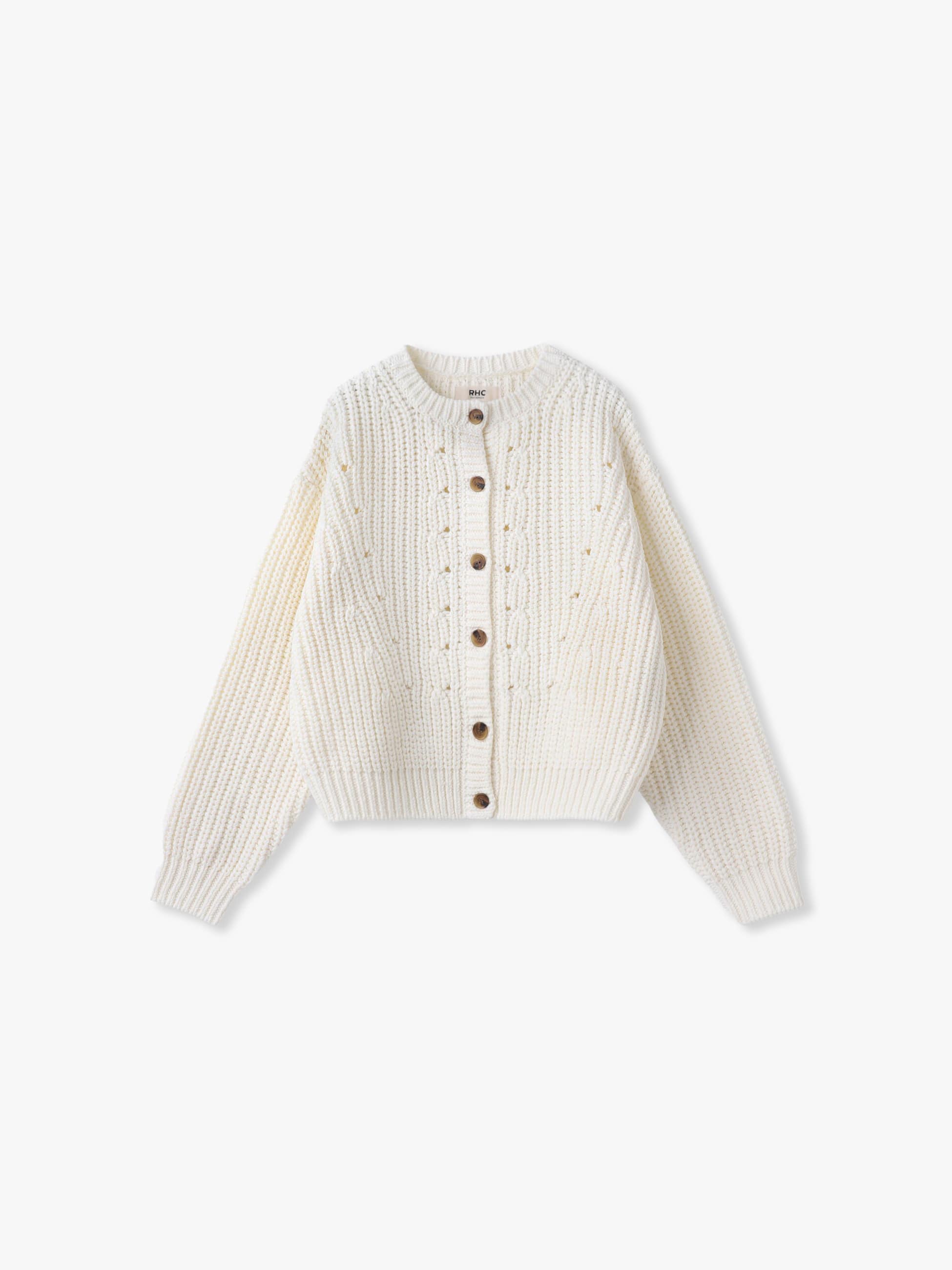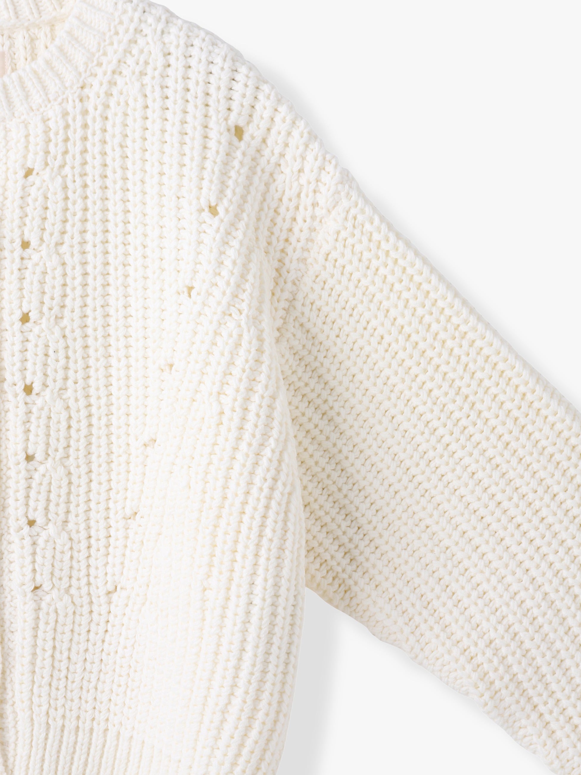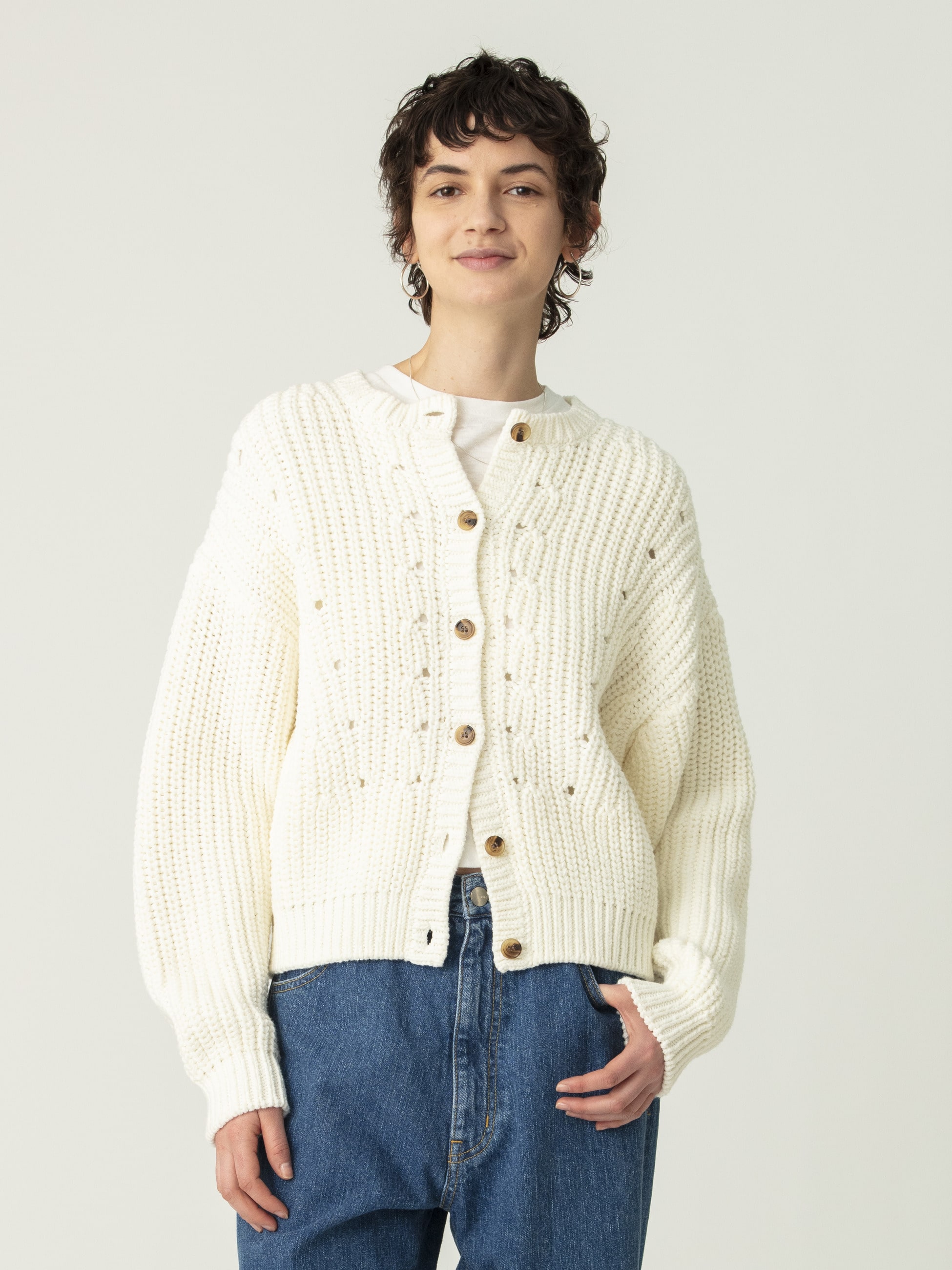 ふくらみのあるコットン混の糸で編みあげた軽やかなニットカーディガンは、身頃に施したアイレット模様がワンポイント。やや短めの着丈で着ぶくれしにくく、バランスの取りやすいシルエットに整えた1着。どんなスタイリングにもマッチするシンプルなホワイトとネイビーの2色展開で、春先まで重宝します。