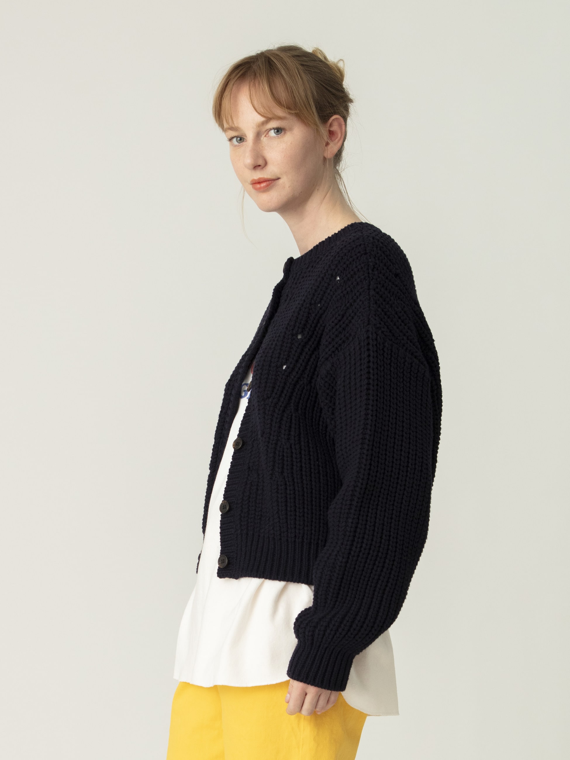 - ふくらみのあるコットン混の糸で編みあげた軽やかなニットカーディガンは、身頃に施したアイレット模様がワンポイント。やや短めの着丈で着ぶくれしにくく、バランスの取りやすいシルエットに整えた1着。どんなスタイリングにもマッチするシンプルなホワイトとネイビーの2色展開で、春先まで重宝します。