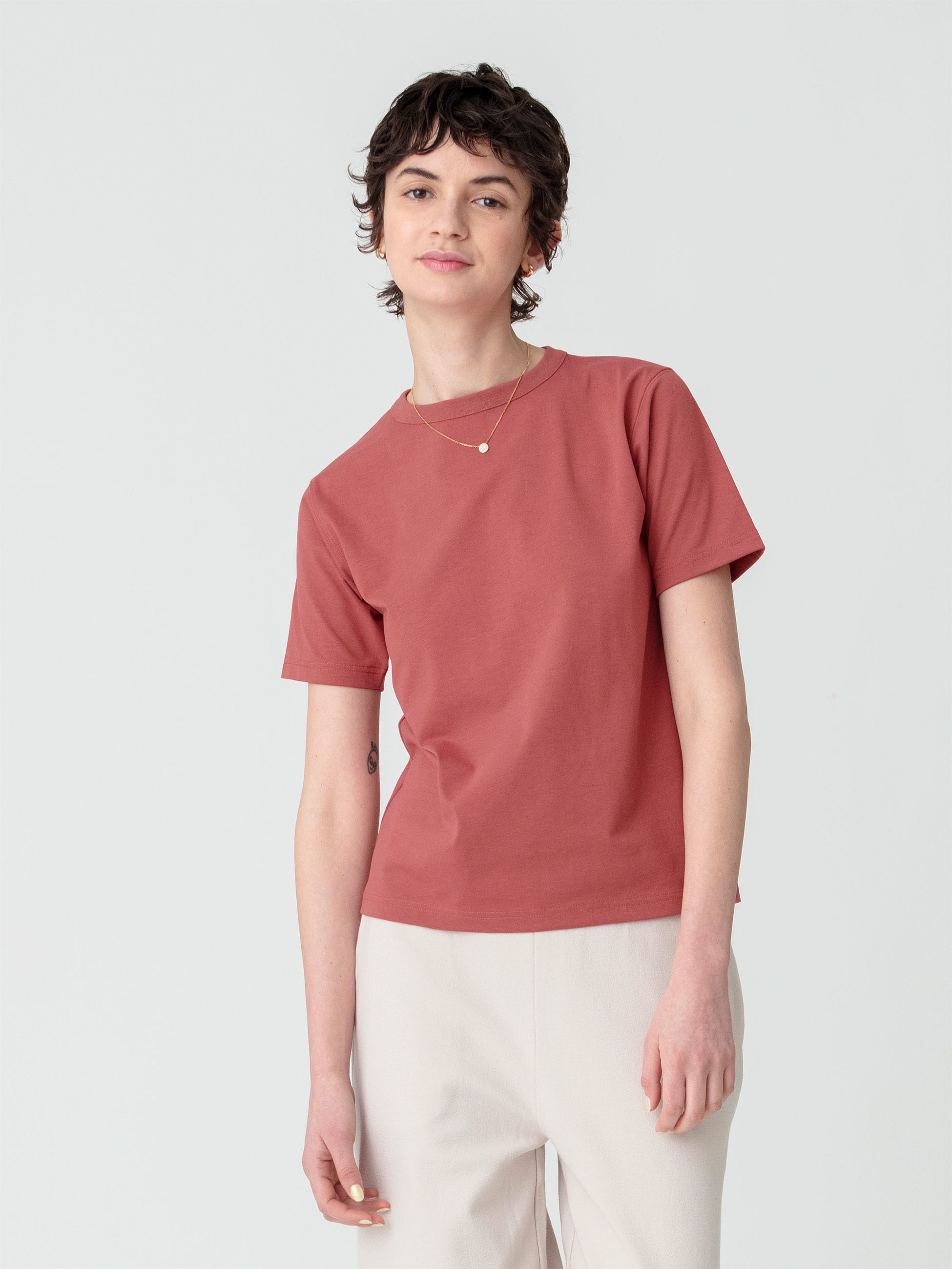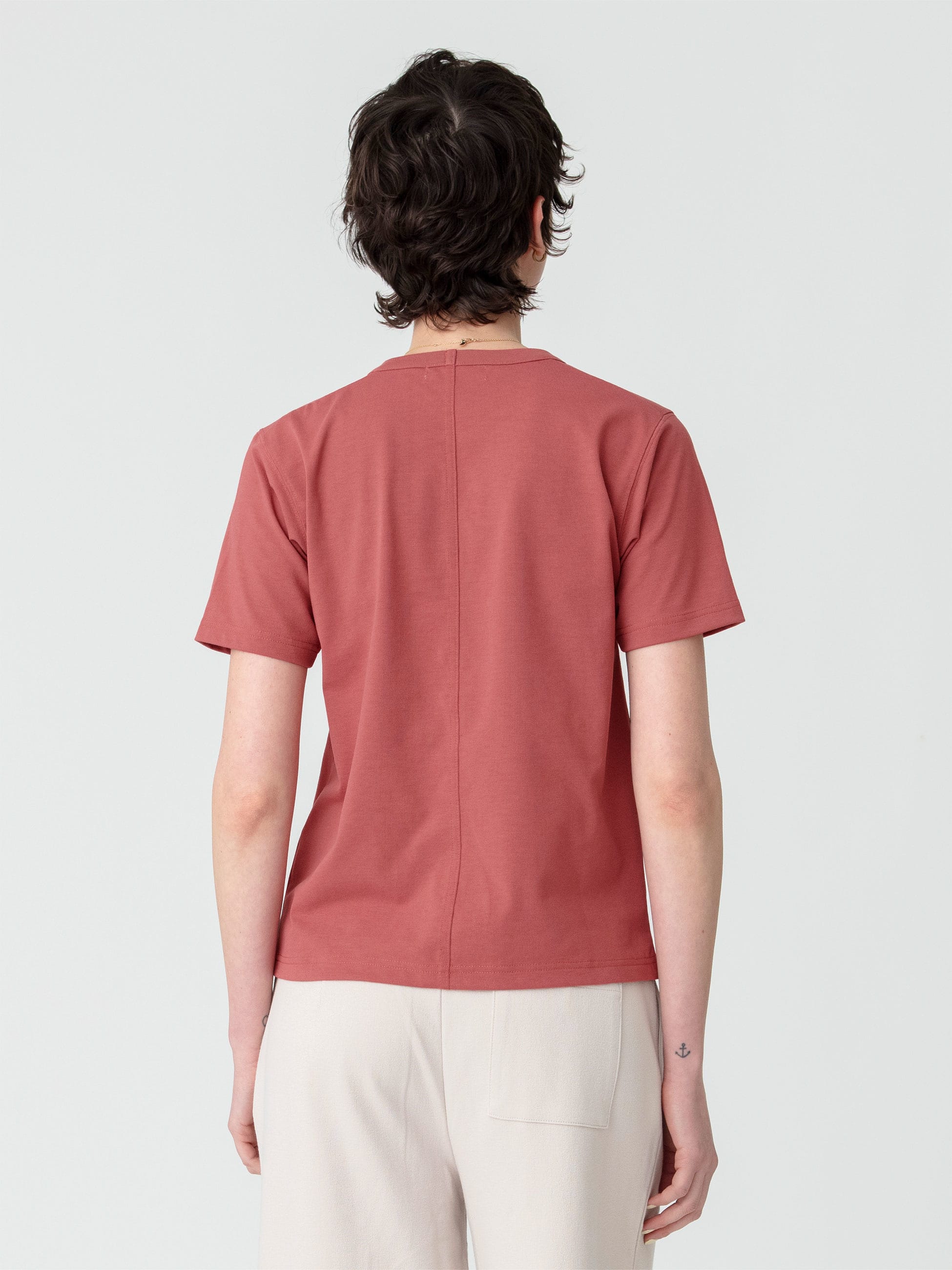 - 天竺素材のベーシックなTシャツは、速乾性に優れ、シワになりづらいリサイクルポリエステル素材を使用しています。生地の風合いを綺麗めな印象に仕上げており、合わせるアイテムを選ばず、1枚でも、インナー使いとしても重宝する万能な1枚です。