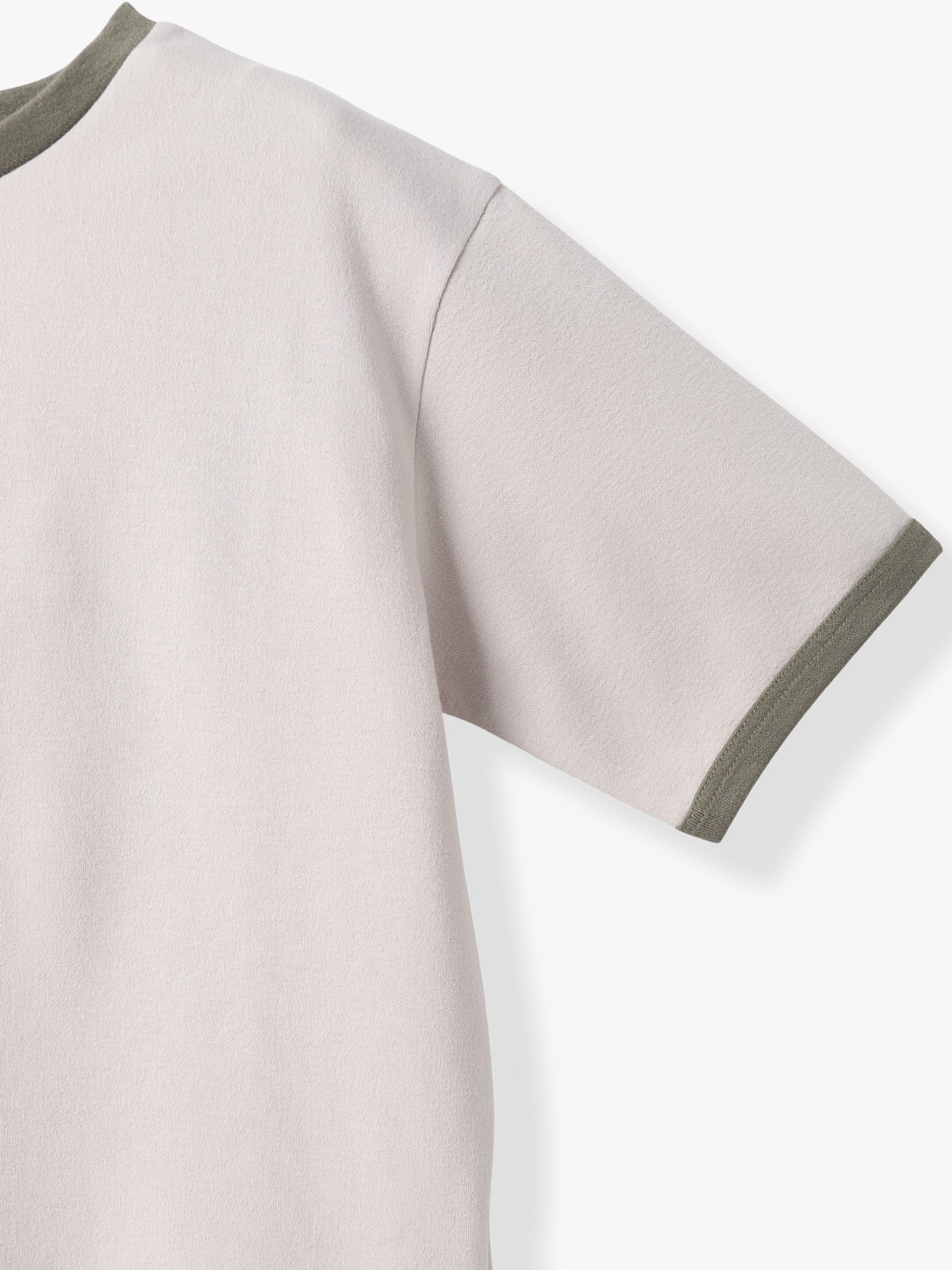 ナチュラルなカラーのリンガーティーシャツは、コットンのさらっとした肌触りが心地よく、肌離れが良いマットな質感で、安心して着用いただける1枚。同シリーズのイージーワイドパンツとセットアップで、リラックス感のある着こなしも素敵です。トウモロコシやサトウキビなど、身の回りの植物から抽出されたデンプンを原料としたPLA(ポリ乳酸)を使用した、サスティナブルな素材で作られています。