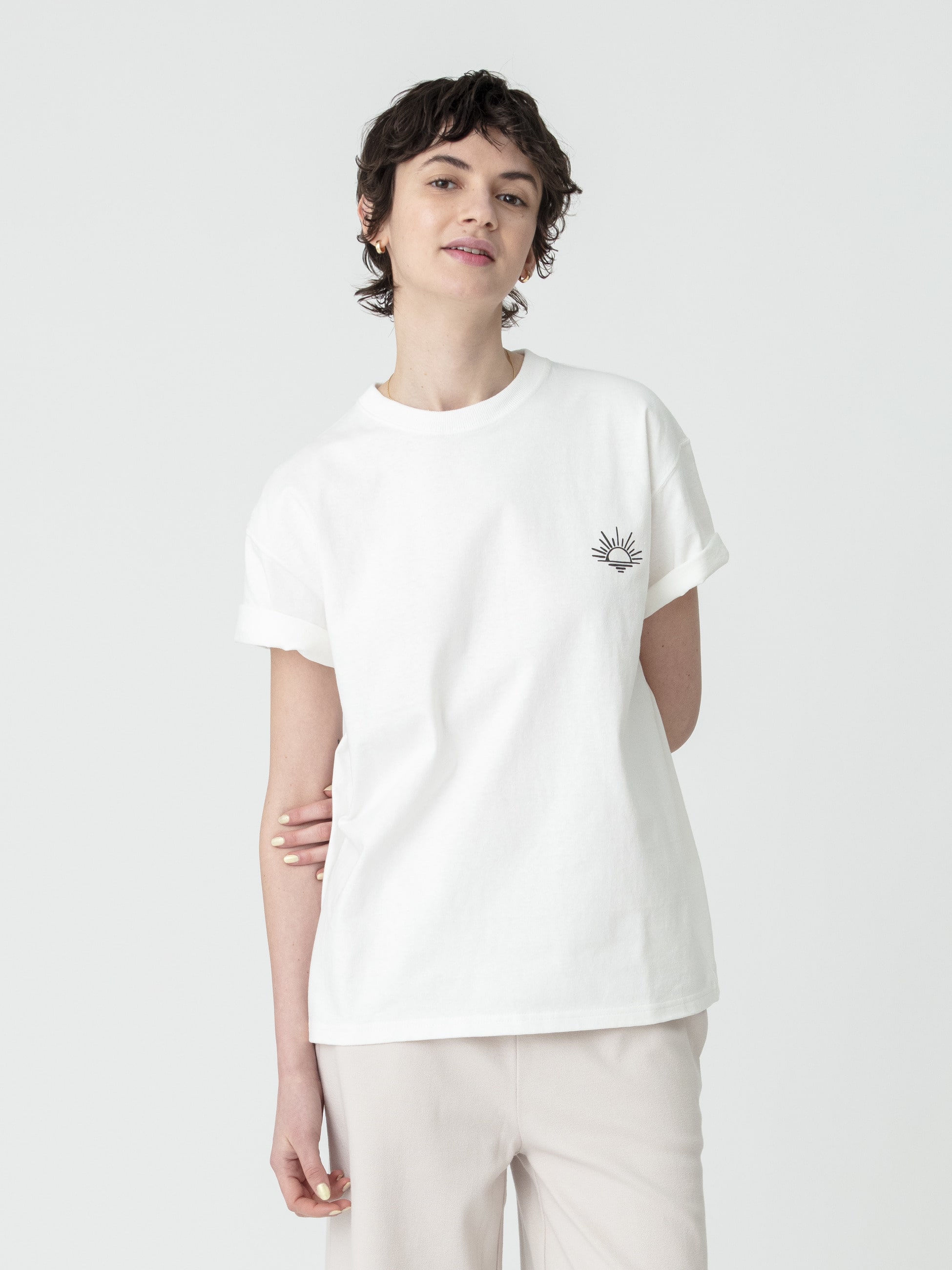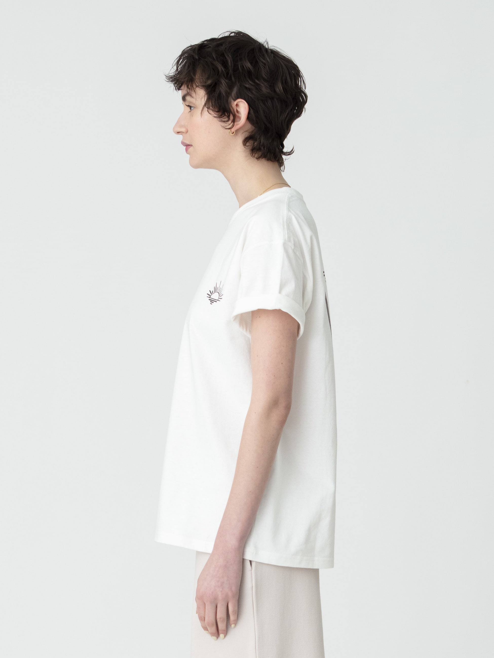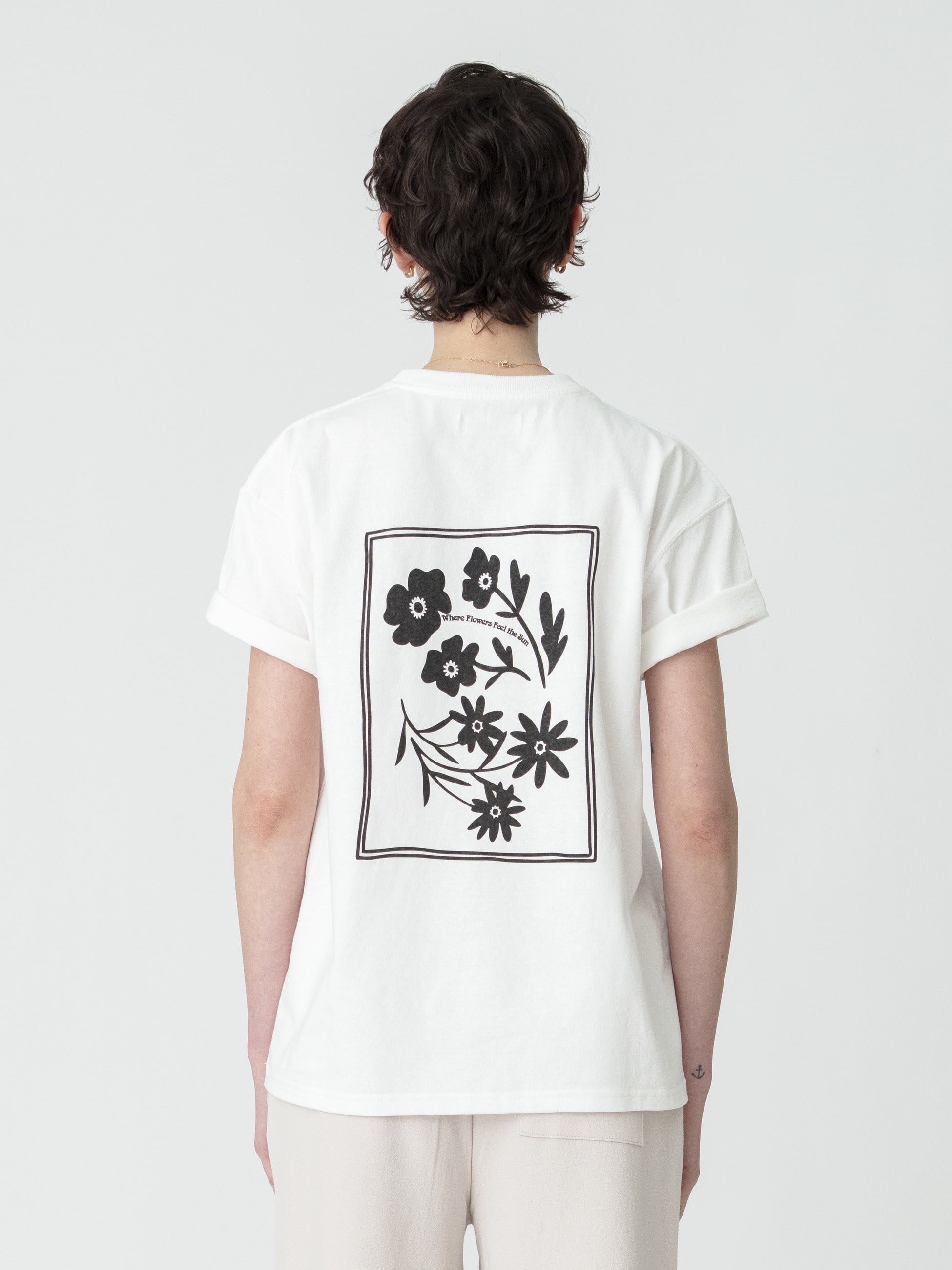 - 2026SSシーズンテーマ「Where Flowers Feel the Sun」をオリジナルのグラフィックで表現したバックプリントTシャツは、胸元には太陽、バックには陰陽マークをイメージした、お花のフォーメーションを配置した1枚。RHC ロンハーマンらしい、ナチュラルな風合いの天竺素材で、着心地も抜群です。