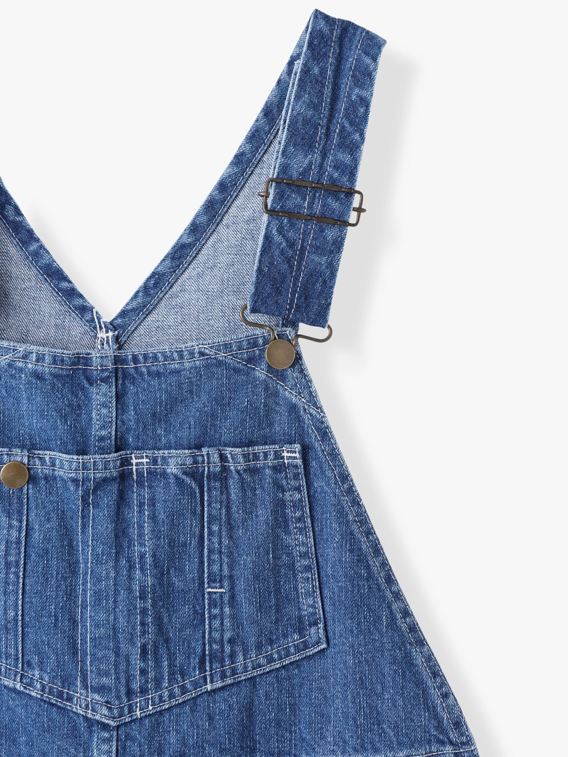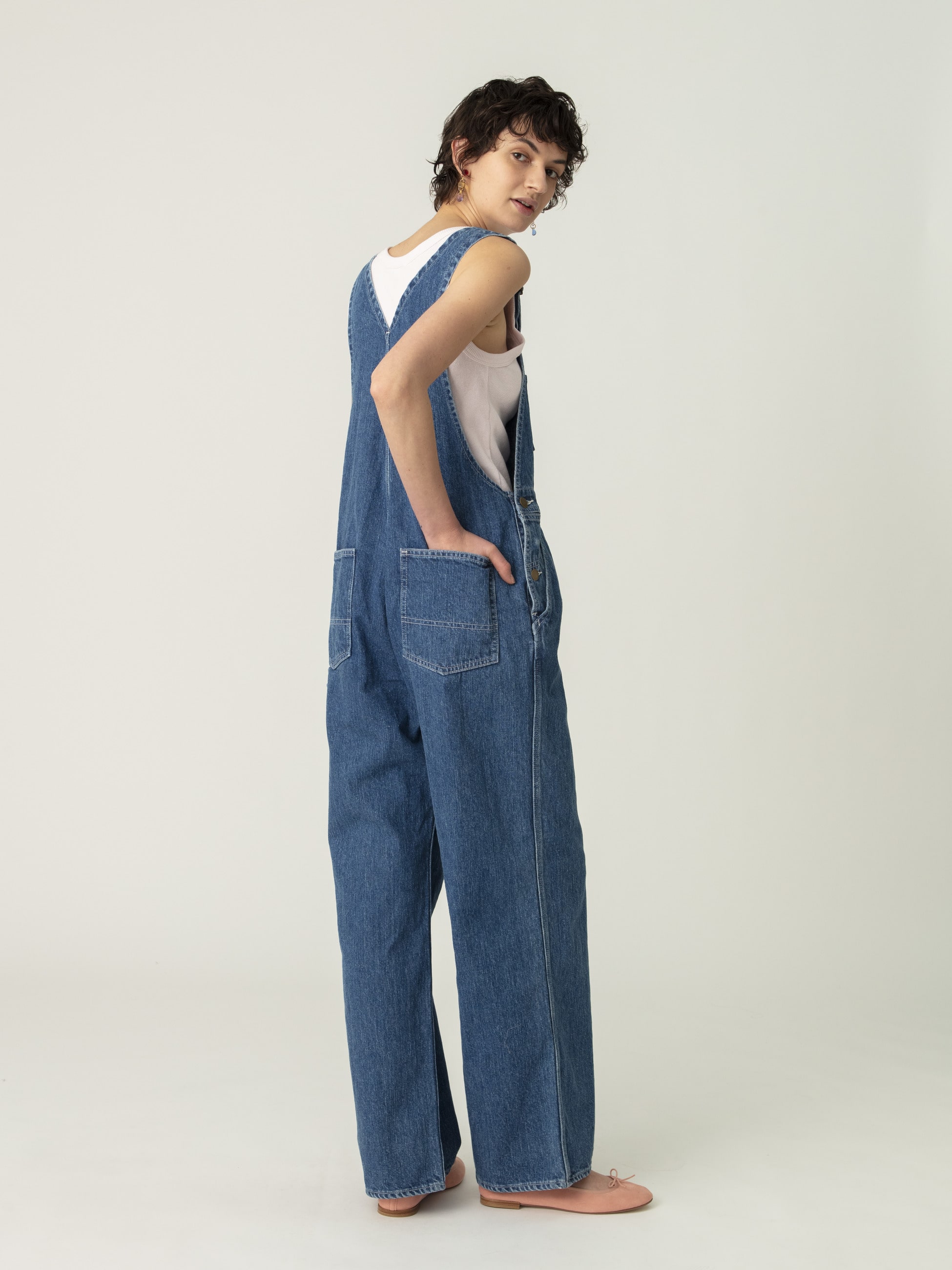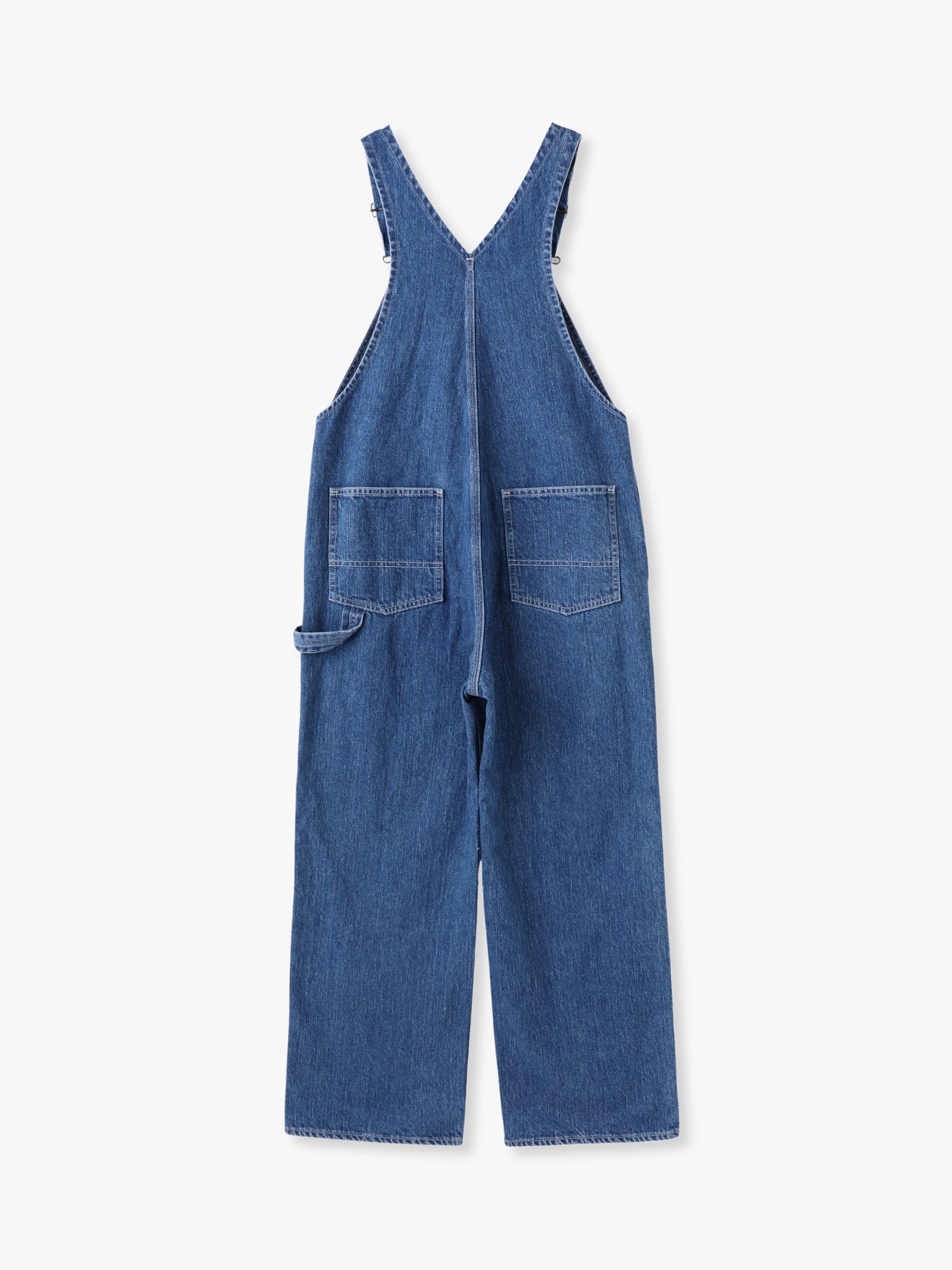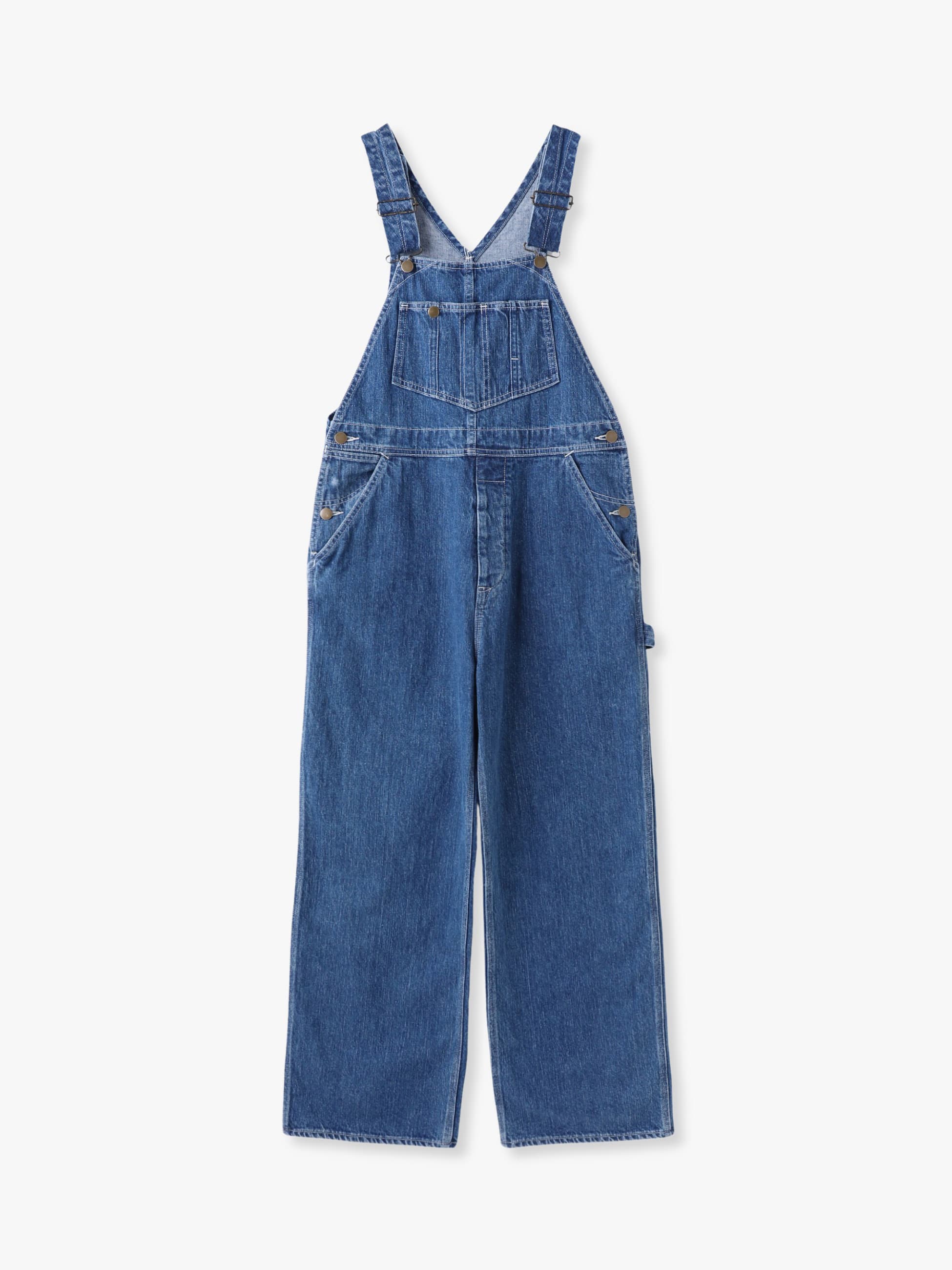 リサイクルコットンデニム生地を使用した、ヴィンテージのような縦落ちで、大人の女性のためのアイテムとして格好良く仕上げたデニムオーバーオールです。胸元のポケットに施したタックボタンやペインターパンツのディティールがデザインポイント。どなたでも取り入れやすい絶妙なサイズ感に仕上げ、合わせるアイテムによってシーズン問わず着用いただけます。