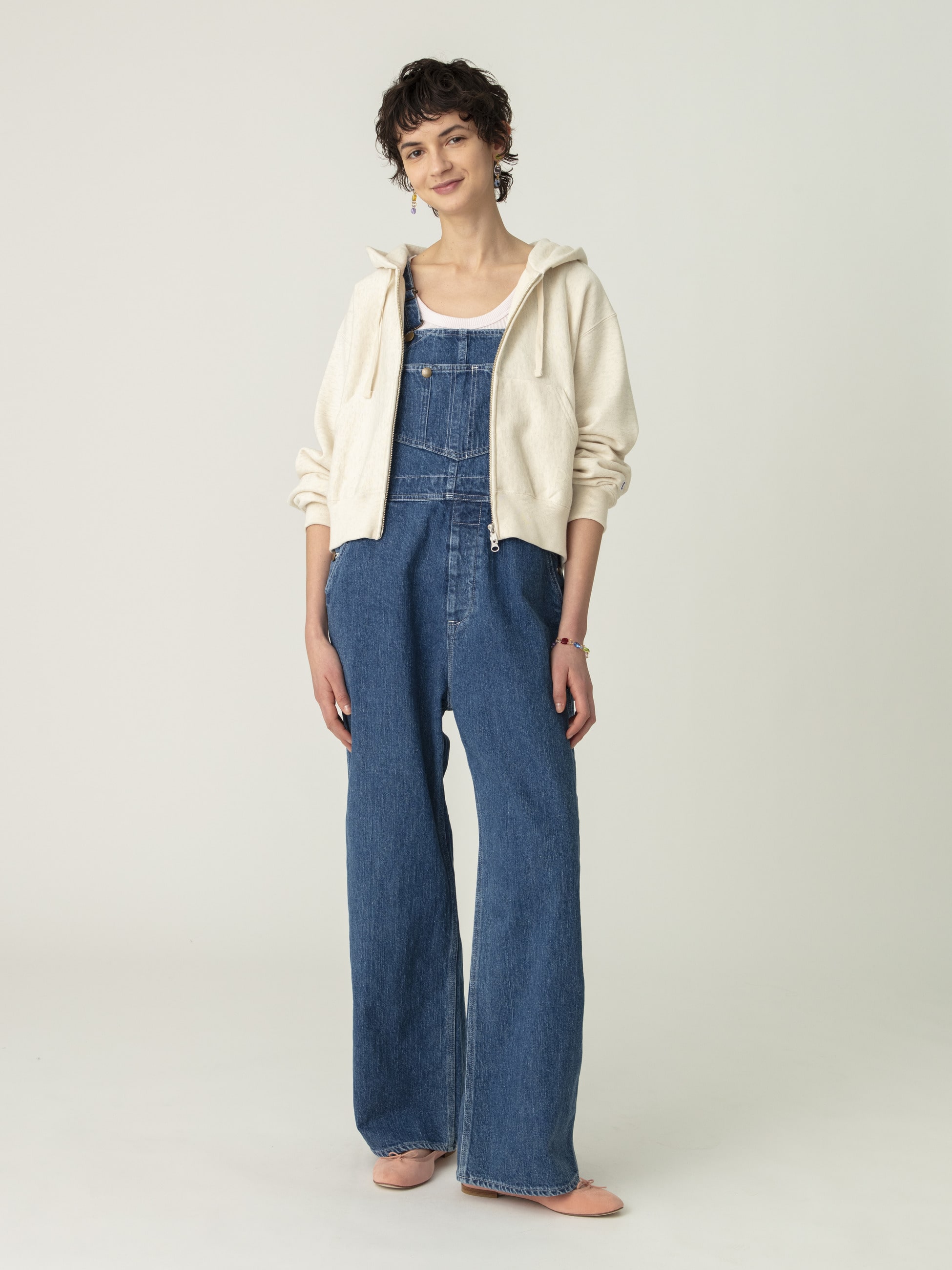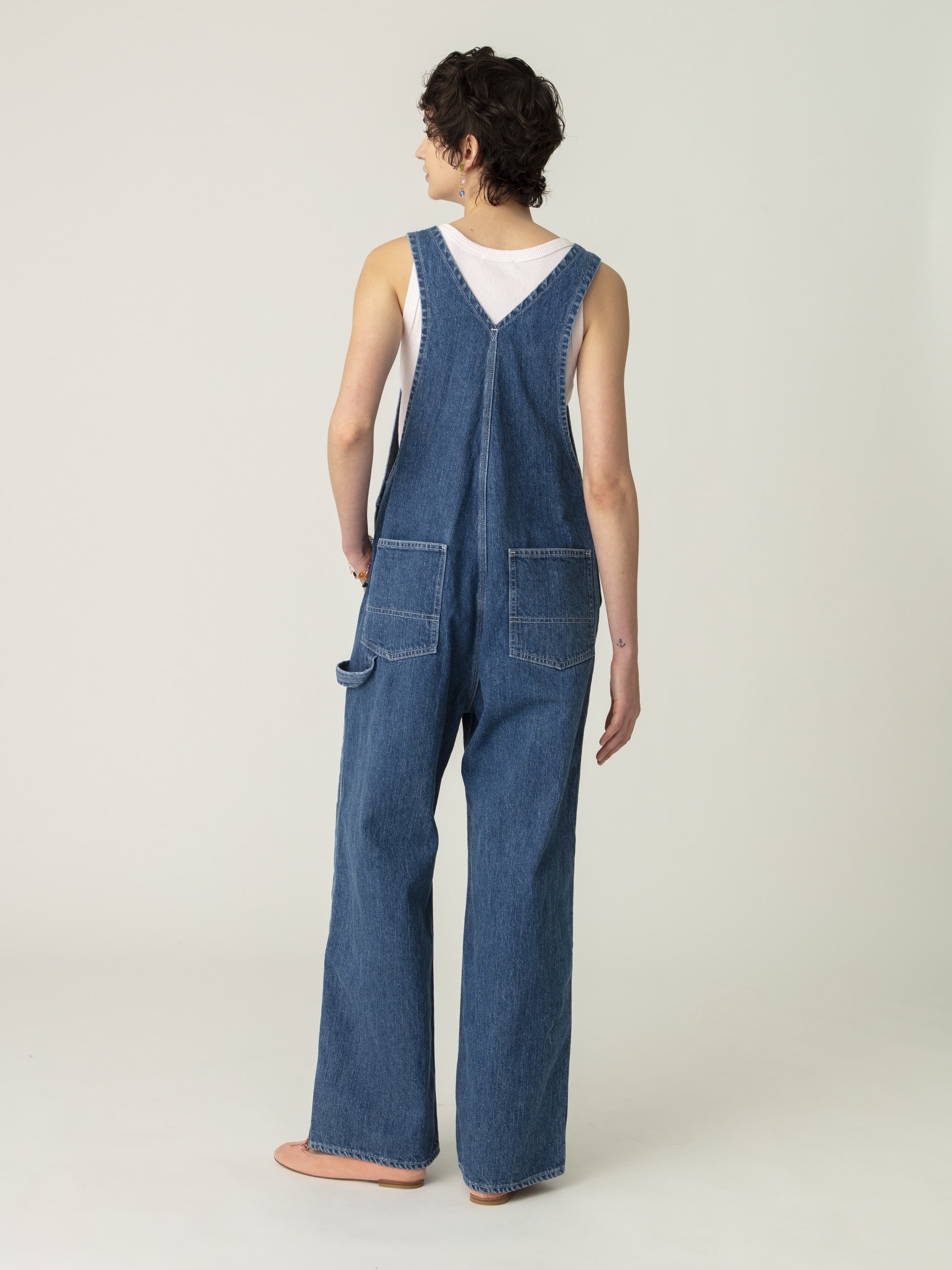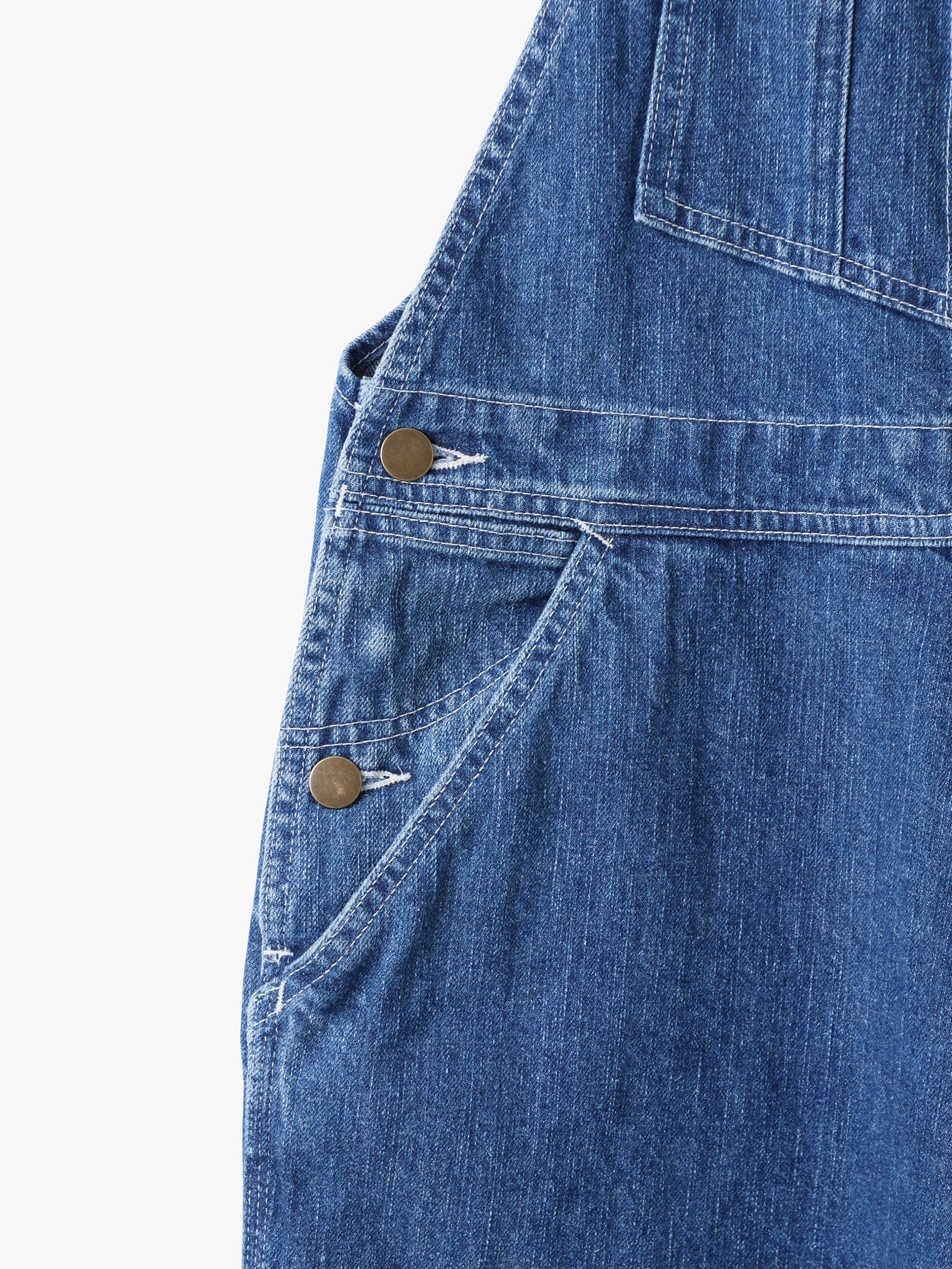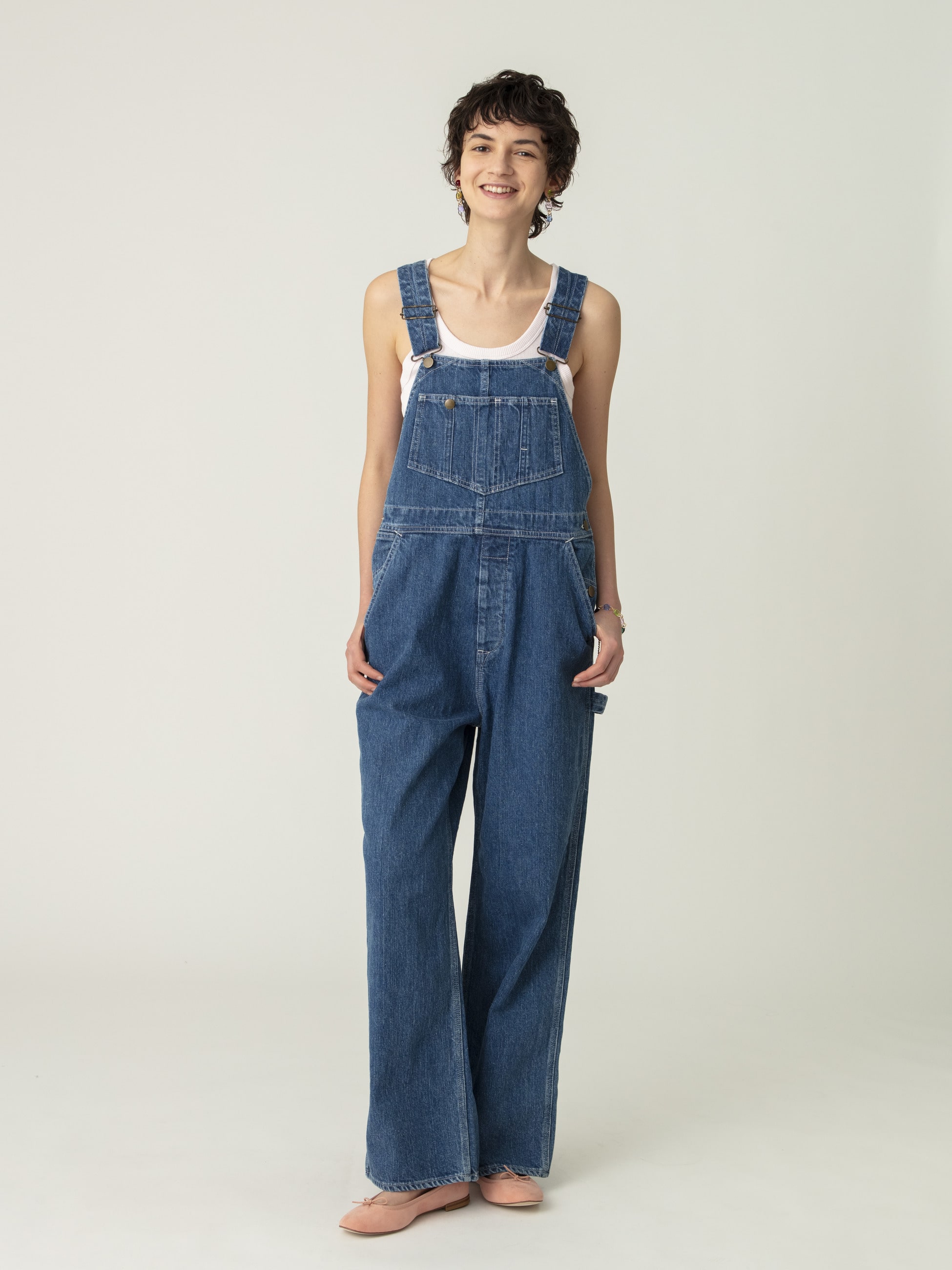 リサイクルコットンデニム生地を使用した、ヴィンテージのような縦落ちで、大人の女性のためのアイテムとして格好良く仕上げたデニムオーバーオールです。胸元のポケットに施したタックボタンやペインターパンツのディティールがデザインポイント。どなたでも取り入れやすい絶妙なサイズ感に仕上げ、合わせるアイテムによってシーズン問わず着用いただけます。