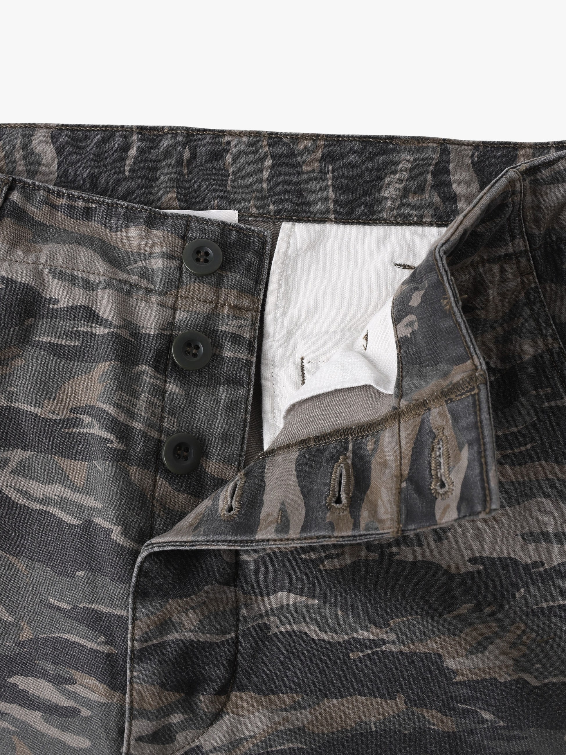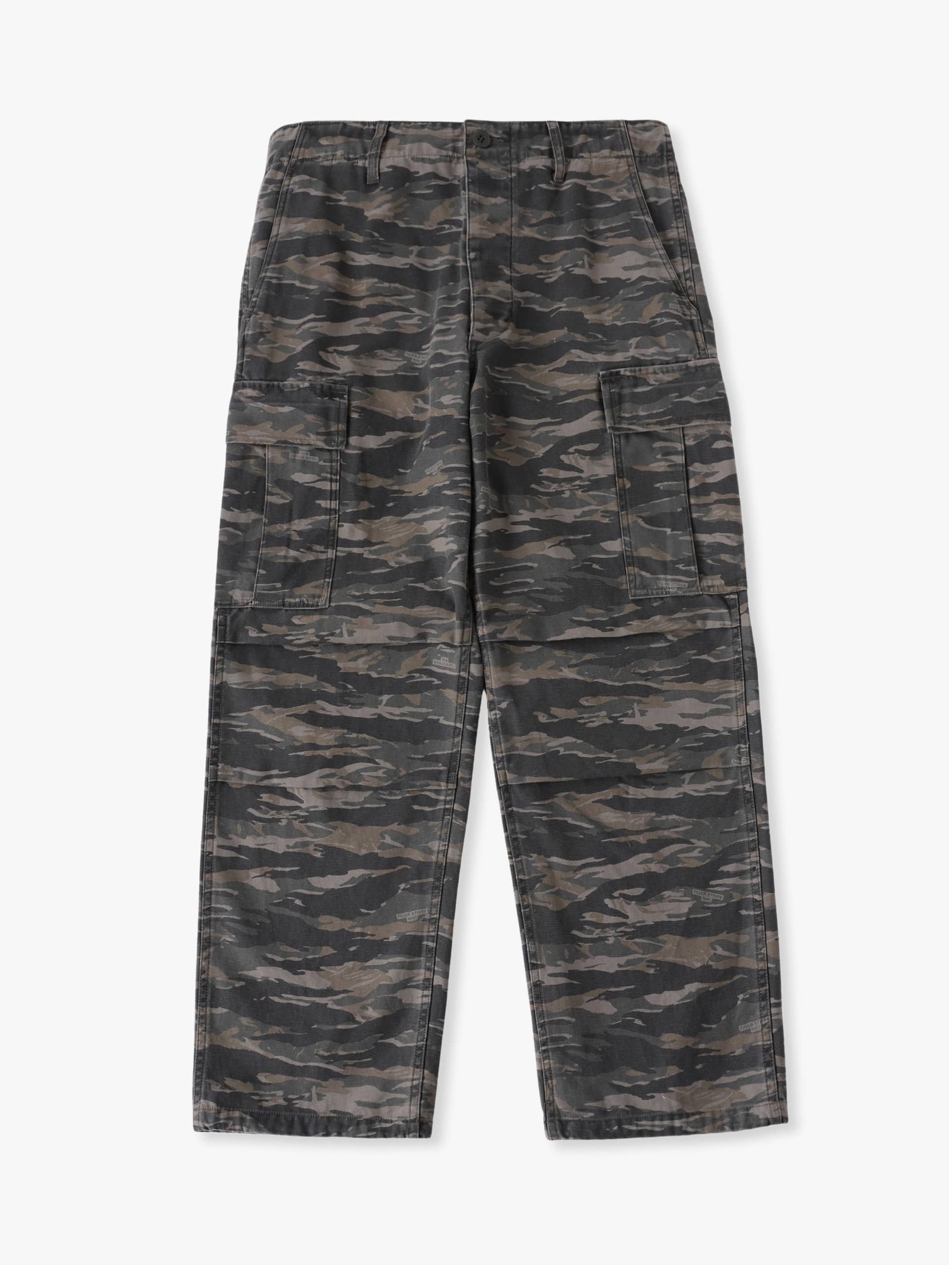 - 高密度のバックサテン生地を使用したカーゴパンツ。ストーンバイオウォッシュ加工を施したヴィンテージのような風合いとオリジナルで製作したmultiカラーのタイガーカモ柄がアクセントになっています。また、US ARMYのファティーグパンツをベースにしたクラシカルなディテールもポイント。ゆったりとしたフィットは、デイリーユースしやすい一着です。