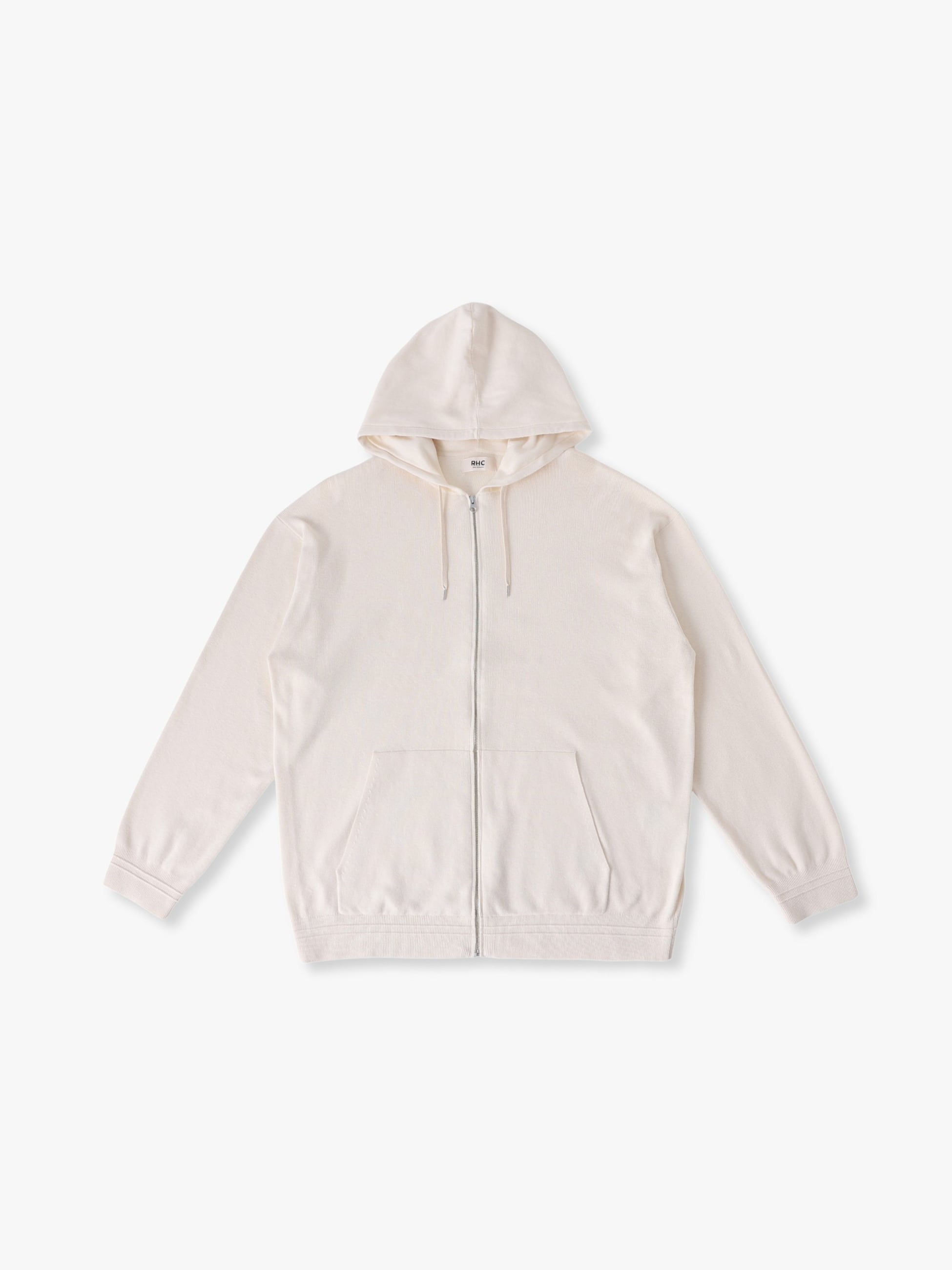 - コットンとリサイクルナイロンの混紡糸で編み上げられたニットフーディー。ニットによる程よく落ち感のある風合いと柔らかな肌触りが特徴です。また、ポケット口の端をシームレスにし、裾と袖のリブ部分にタックラインを入れた細部までこだわったデザインも魅力のひとつ。身幅にゆとりを持たせたゆったりとしたフィットは、デイリーユースしやすい一着です。