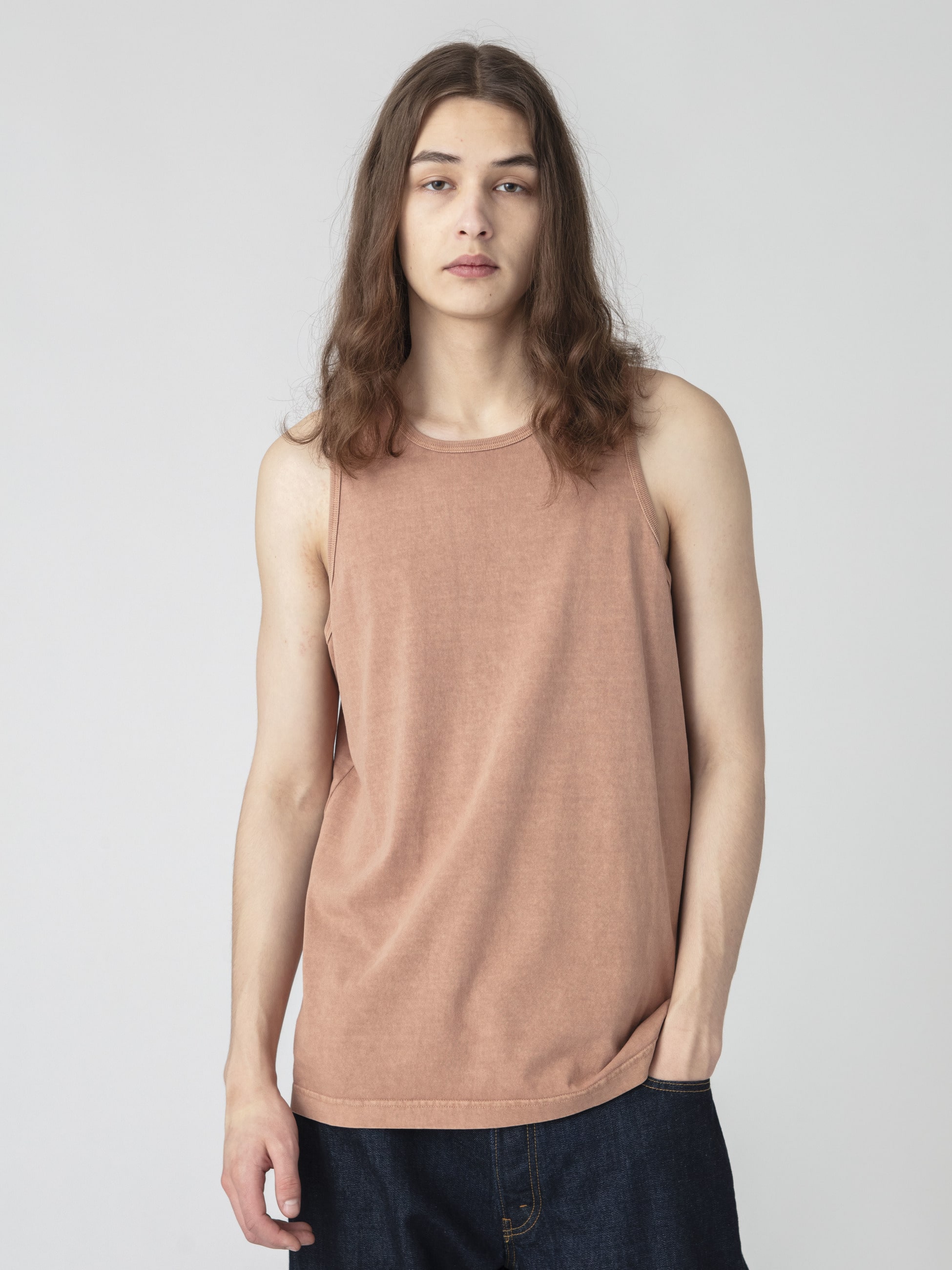 天竺生地を使用したタンクトップは、ドライタッチな風合いとライトな着心地が気温の高い時季でも快適な着心地を実現しています。また、また、ピグメントダイ加工を施したフェードしヴィンテージのようなカラーリングも魅力のひとつ。ベーシックなレギュラーフィットは、デイリーユースしやすい一着です。