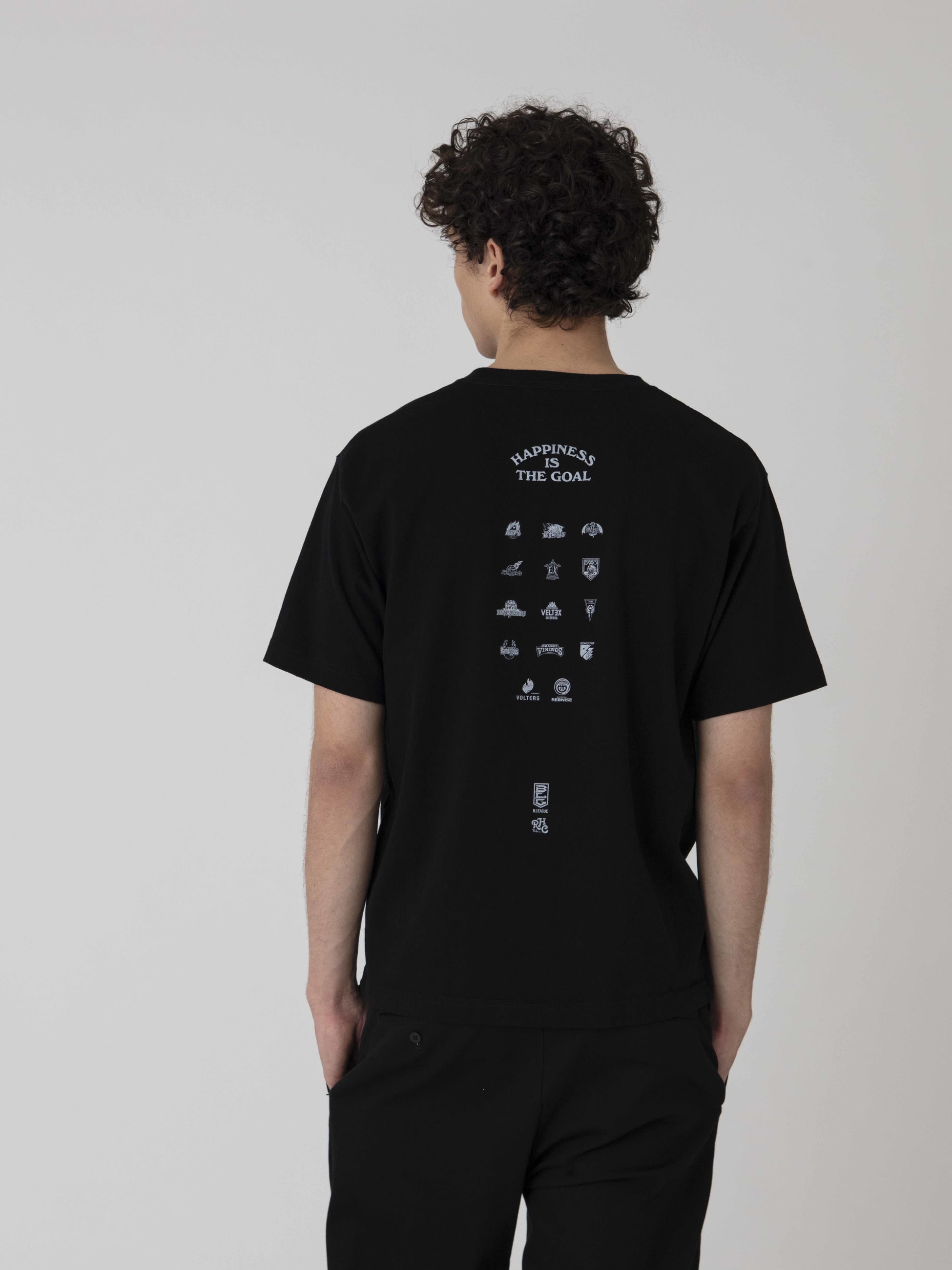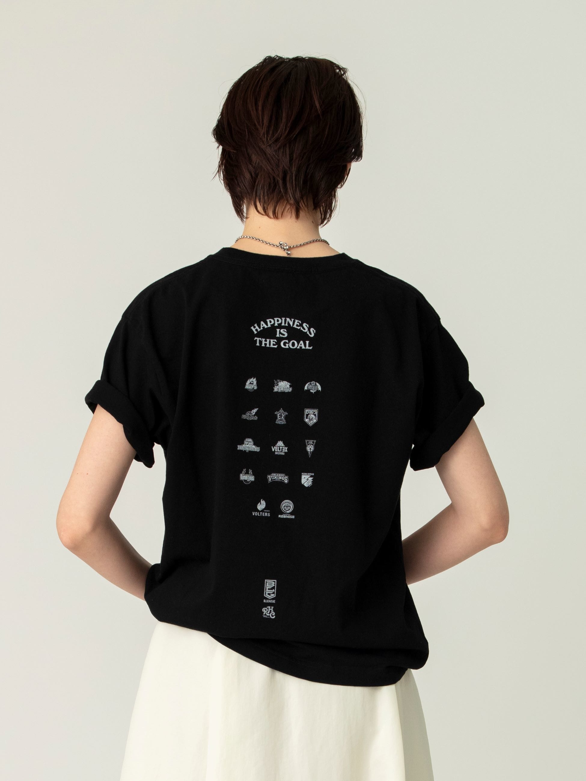 「ココロ、たぎる。」をパーパスにスポーツを通して人々に感動を与え続け、記念すべき10シーズンを迎えたB.LEAGUEと、「HAPPINESS IS THE GOAL」をコンセプトにカリフォルニアカルチャーを通じてポジティブなエネルギーを発信するRHC ロンハーマンが、共に大切にしている”ワクワク”や感動を、更に多くの人に届けたいという願いを込めてコラボレーションしたアイテムが登場いたします。初のコラボレーションで登場するアイテムは、上質なコットンを使用したTシャツ。空気の力で糸を撚り合わせる特殊な製法によって紡がれた糸を使用し、表面はしっかりと、中心はやわらかな風合いとさらりとした快適な肌触りを実現しています。また、毛羽立ちや糸ムラが少ないクリアな表情は、カジュアルでリラックスした雰囲気の中にも、しなやかさとタフさを兼ね備えた上質な素材感が特徴です。さらに、リラックスしたシルエットと日常に自然と溶け込む着心地の良さを追求し、ホワイトとブラックの2色展開でご用意いたしました。フロントには「HAPPINESS IS THE GOAL」のワンポイント、バックにはB1・B2 所属全クラブのロゴとB.LEAGUEとRHC ロンハーマンのロゴを配した特別なデザインに落とし込んでいます。バスケットボールファンはもちろんRHC ロンハーマンファンにも楽しんでいただける特別なアイテムをお試しください。
