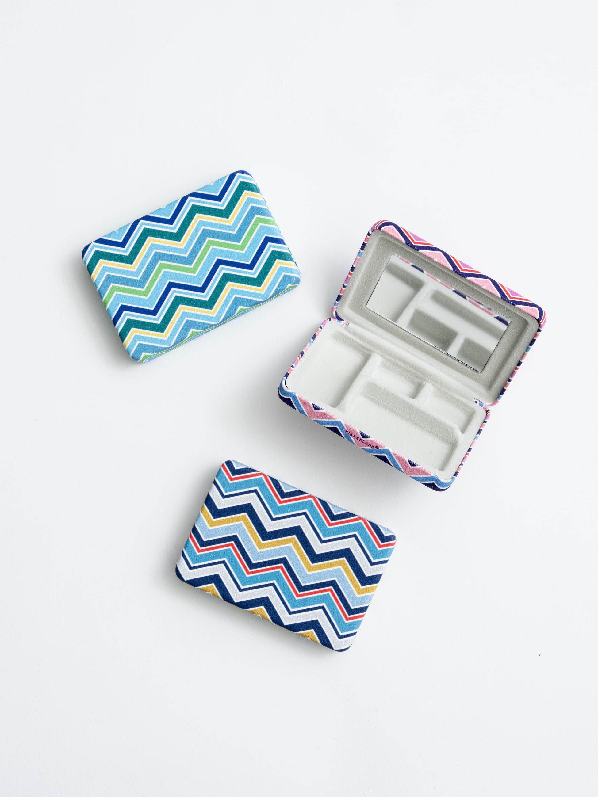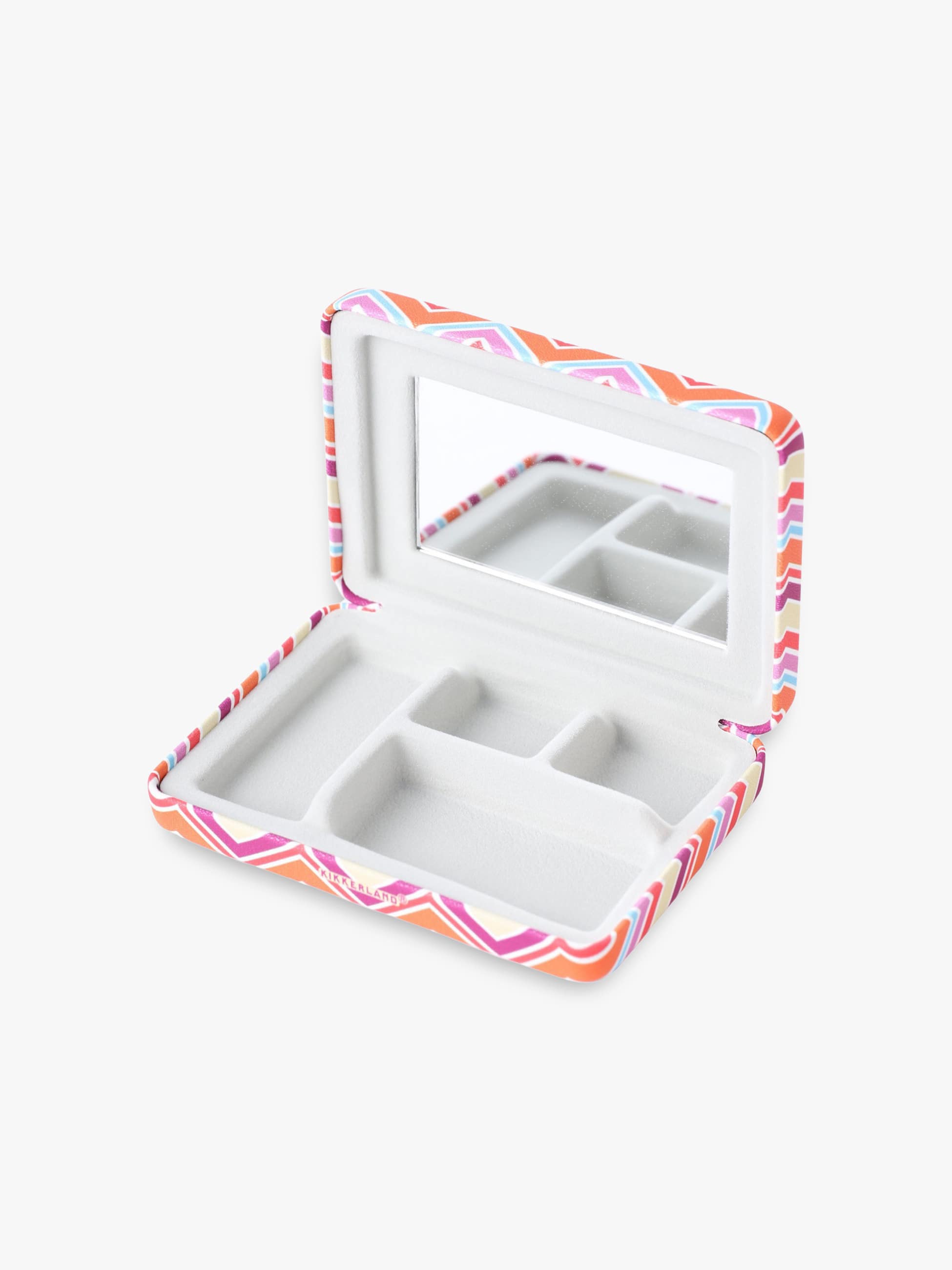 - 持ち運びに便利なミラー付きのジュエリーケース。細かな仕切りが施されており、傷つきやすいアクセサリーや絡まりやすいチェーンもすっきりと収納できます。旅先でも大切なジュエリーを安心して持ち歩ける仕様に。カラフルな柄が気分を明るくしてくれる、機能性とデザイン性を兼ね備えたアイテムです。