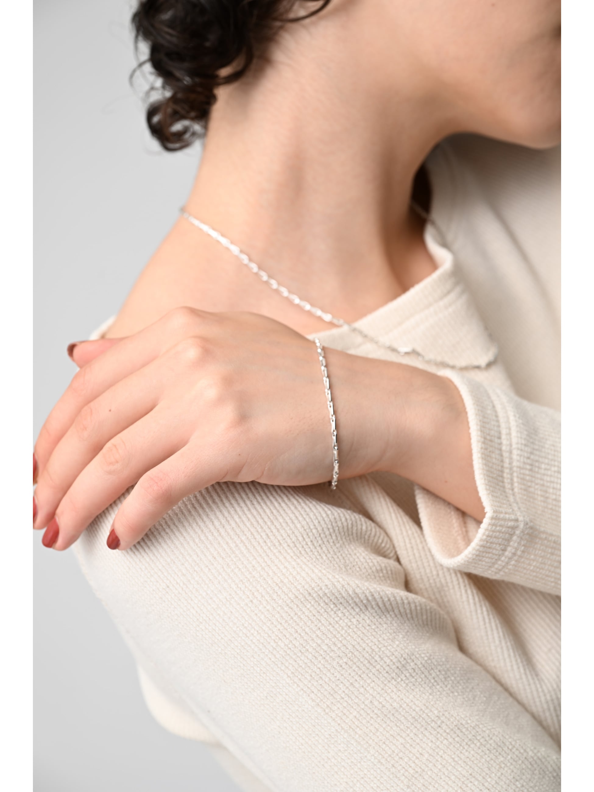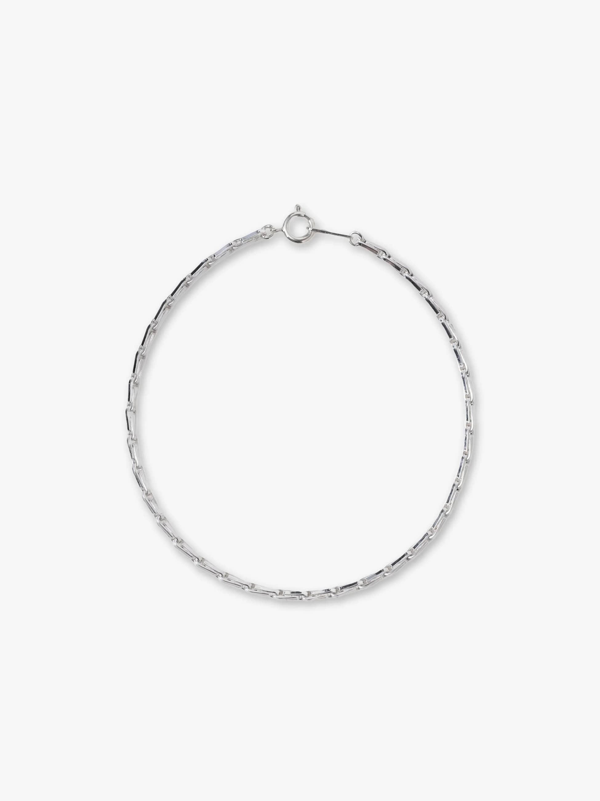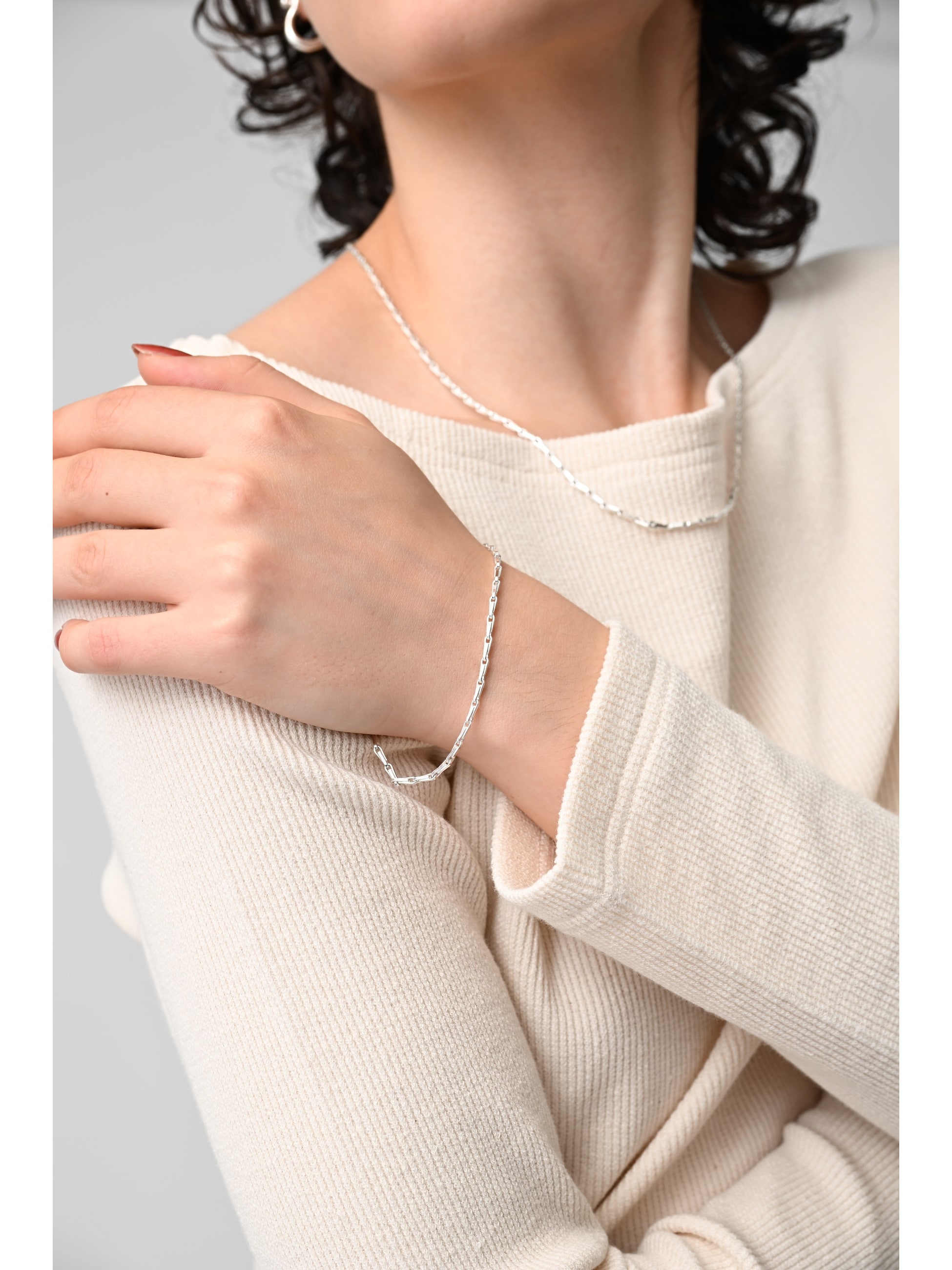 大麦の粒を思わせる美しいフォルムが特徴のチェーンブレスレット。シンプルながら程よい存在感があり、単体で着けても重ね付けしてもコーディネートのポイントになります。襟付きのシャツやスウェットなど、様々なスタイルに自然に馴染むデザインで、日常の装いにさりげなく上品さをプラス。程よい重みとシャープな輝きがスタイルを引き締め、男性の方にもおすすめのアイテムです。