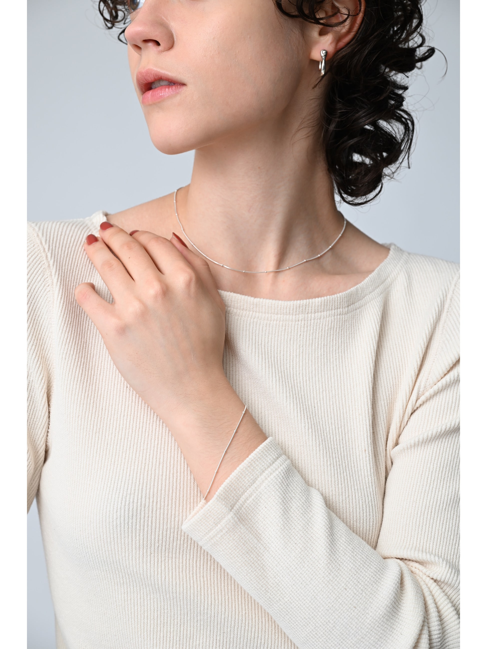 - フラットなチェーンと丸い粒が規則的に連なるデザインで、モールス信号を思わせるユニークなチェーンです。小ぶりで繊細なチェーンを使用しており、個性的になりすぎず、日常のスタイルにも自然に馴染みます。単体で身につけても、重ね付けしても、さりげなくスタイルのアクセントになる上品なデザインです。