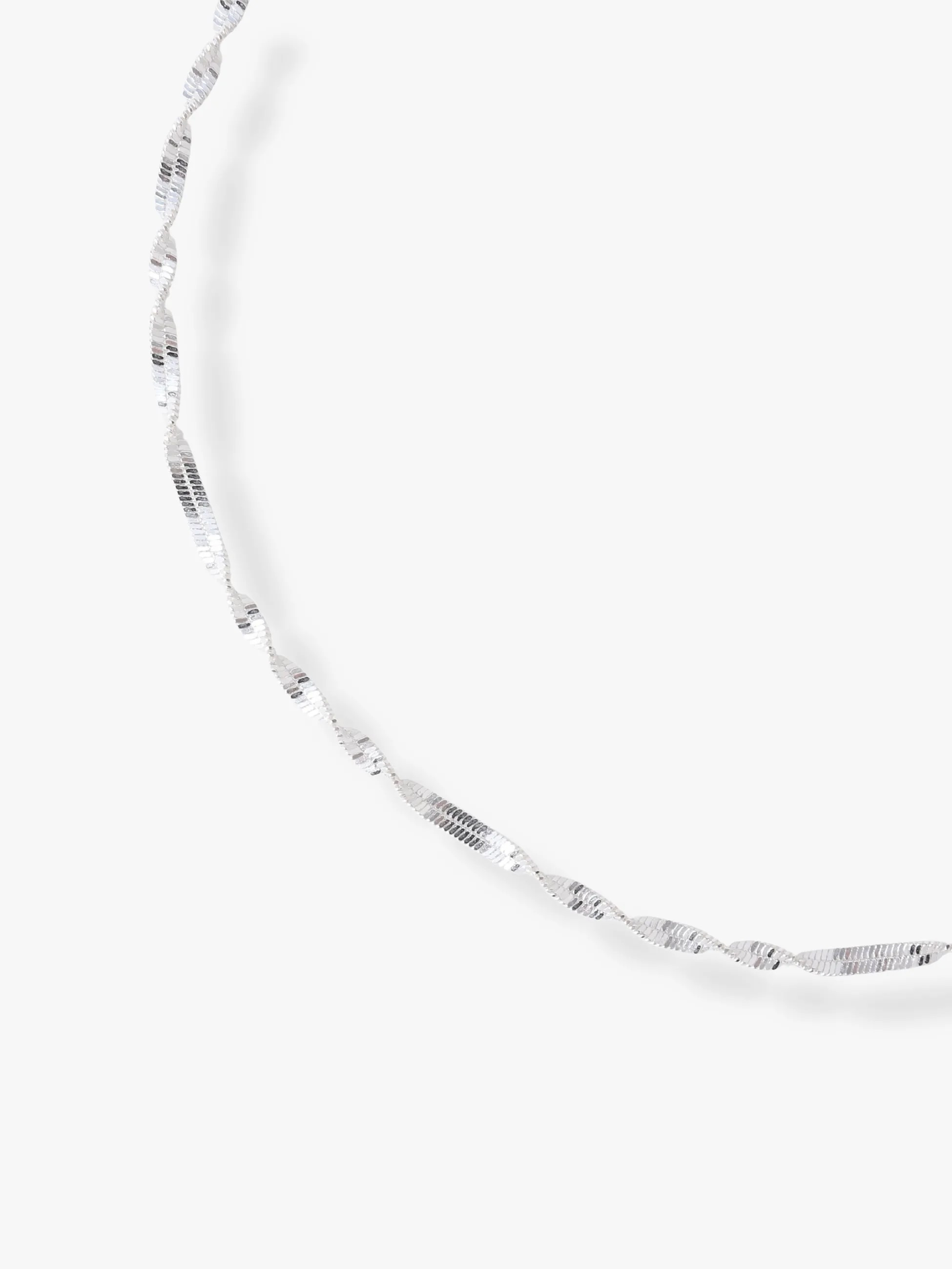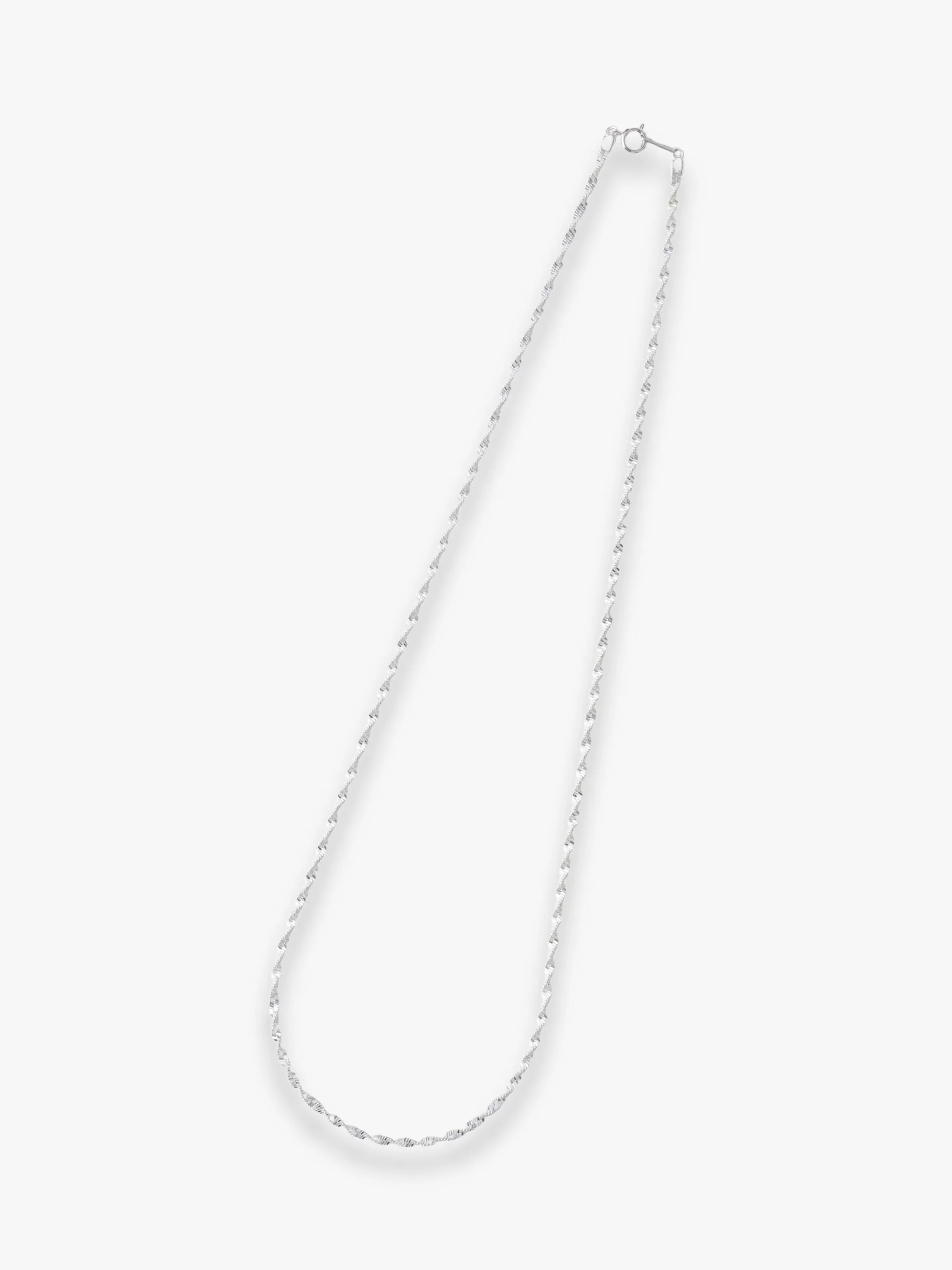 - 平らなヘリンボーンチェーンにねじりを加えた、動きのあるユニークなデザイン。光を受ける面が多く、キラキラと輝く表情が印象的です。ネックレスは首元に華やかさを、ブレスレットは手元にさりげないアクセントを添えてくれます。チェーン自体に存在感があるため、ひとつ身に着けるだけで、こなれた印象に仕上がります。他ではあまり見かけないデザインなので、シンプルなチェーンをすでにお持ちの方にも、プラスワンとしておすすめのアイテムです。