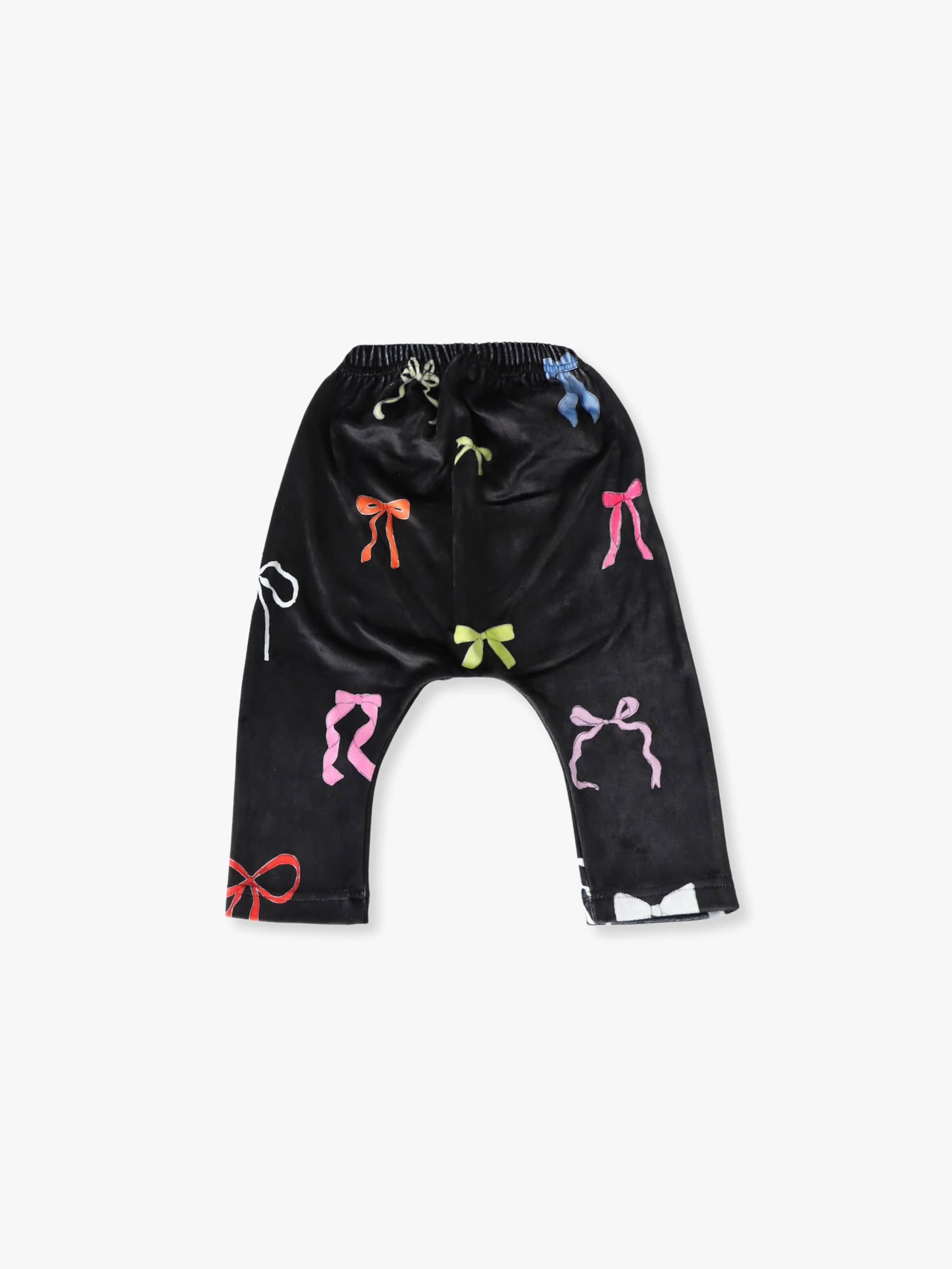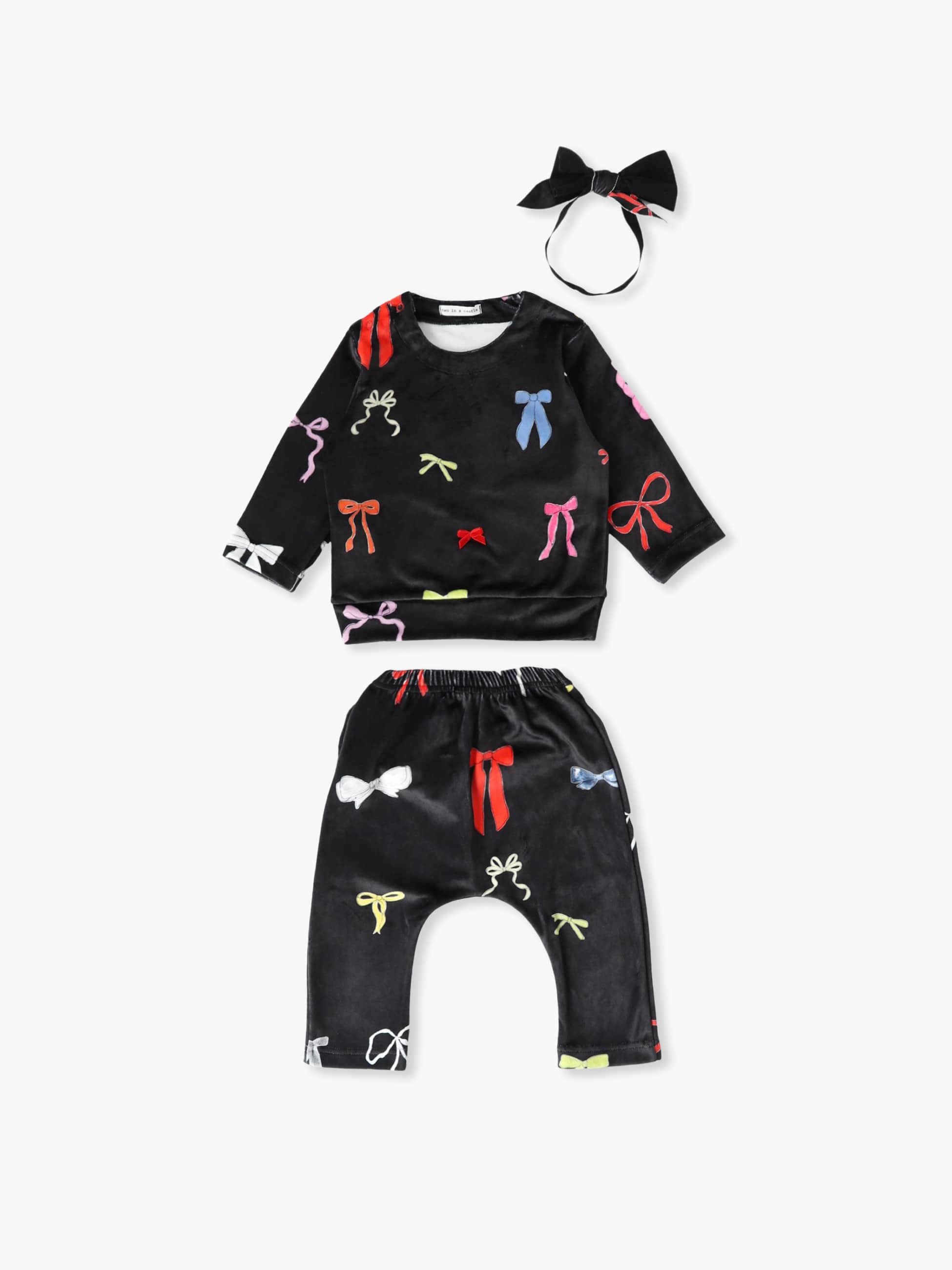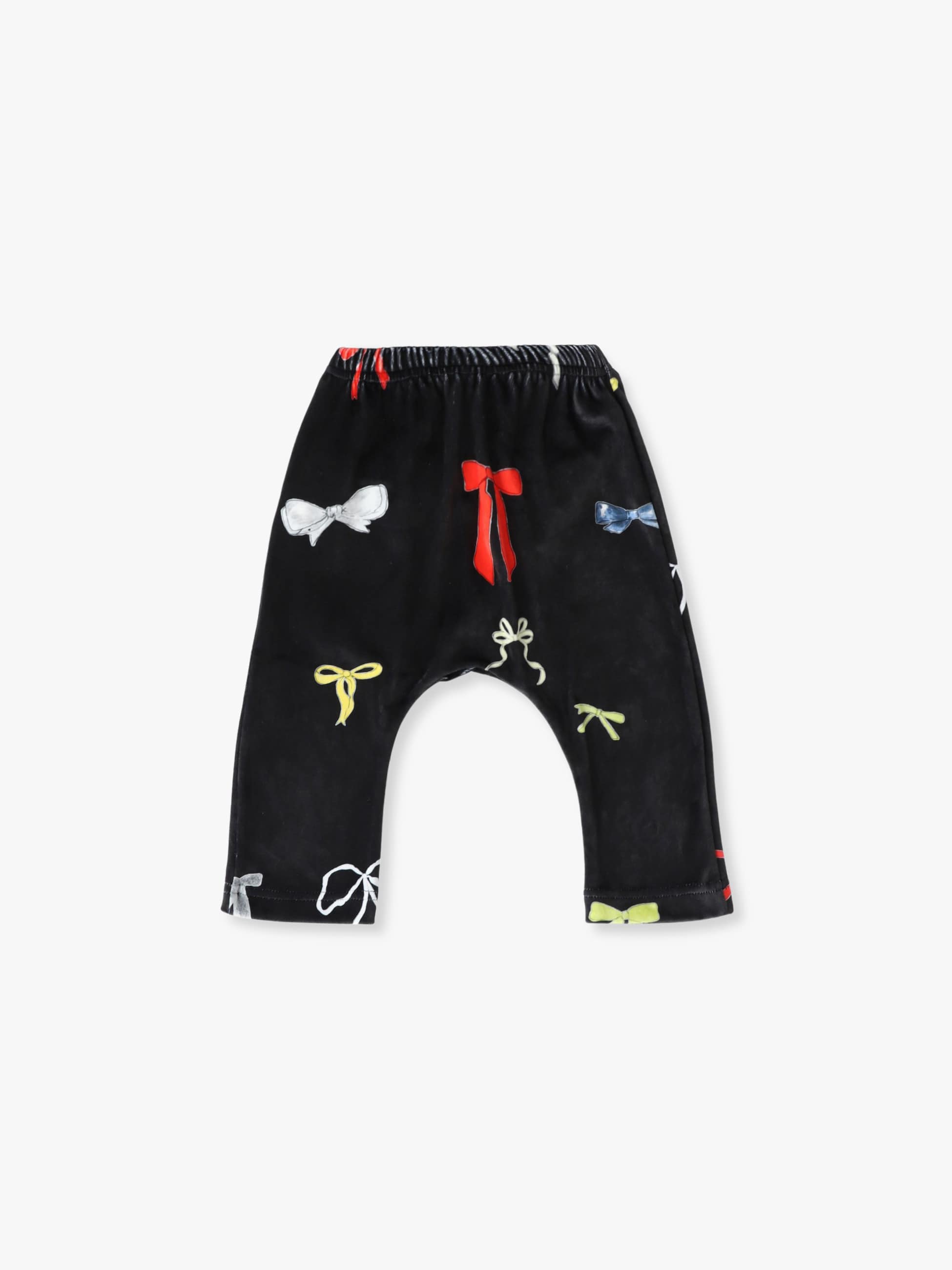 カラフルなリボンが散りばめられたセットアップは、ヘッドバンド付きで遊び心をくすぐるキュートなアイテムです。柔らかくあたたかなベロア素材を使用しているため快適な着心地です。パンツはウエストがゴム仕様で、着脱が簡単なところも嬉しいポイントです。