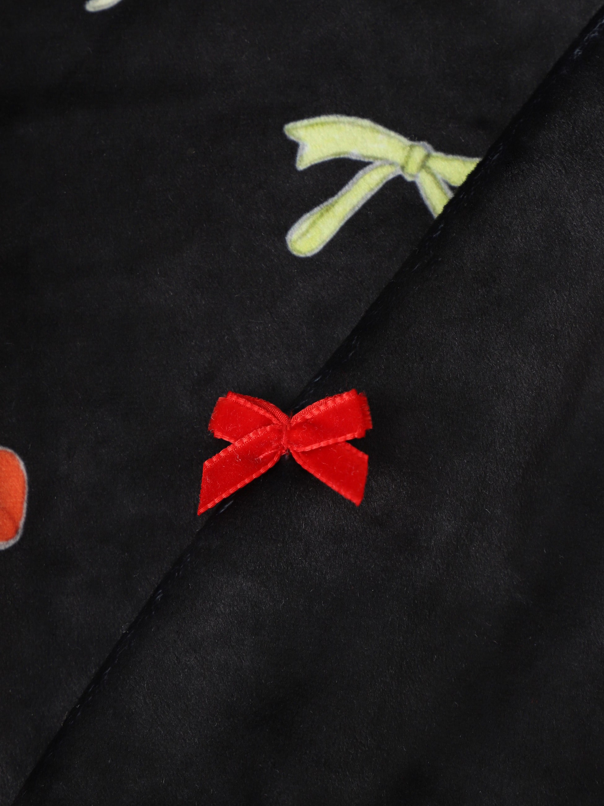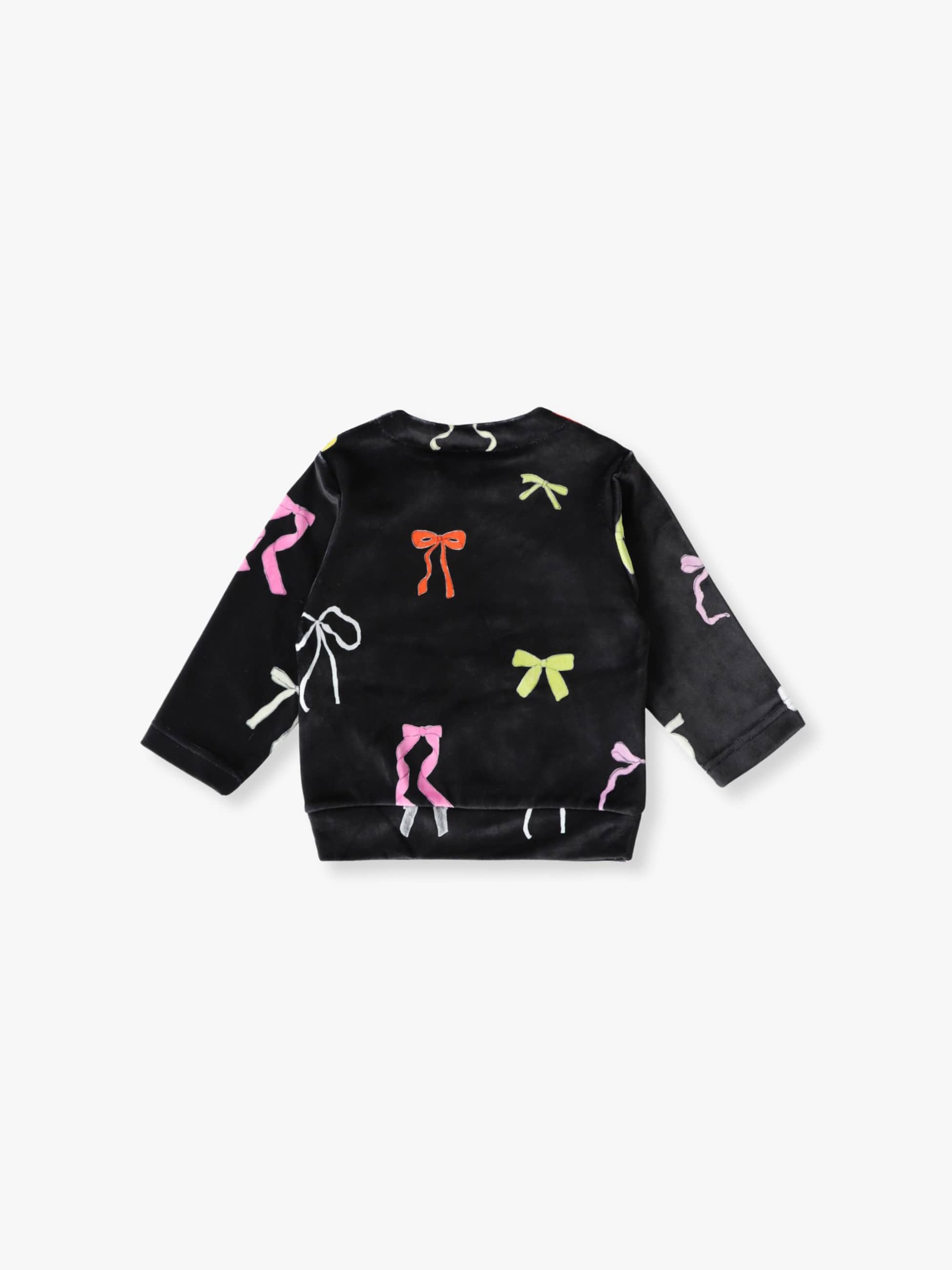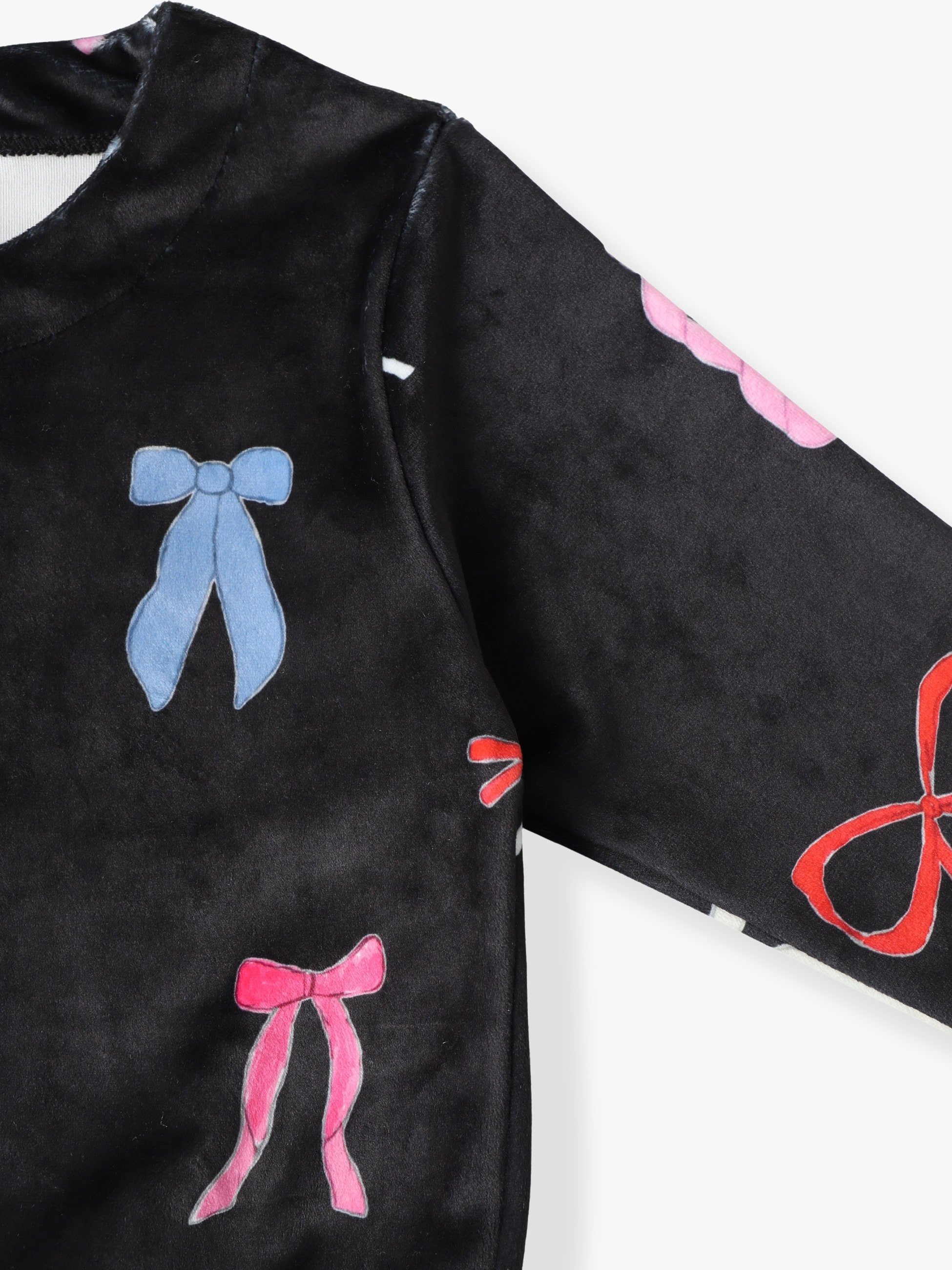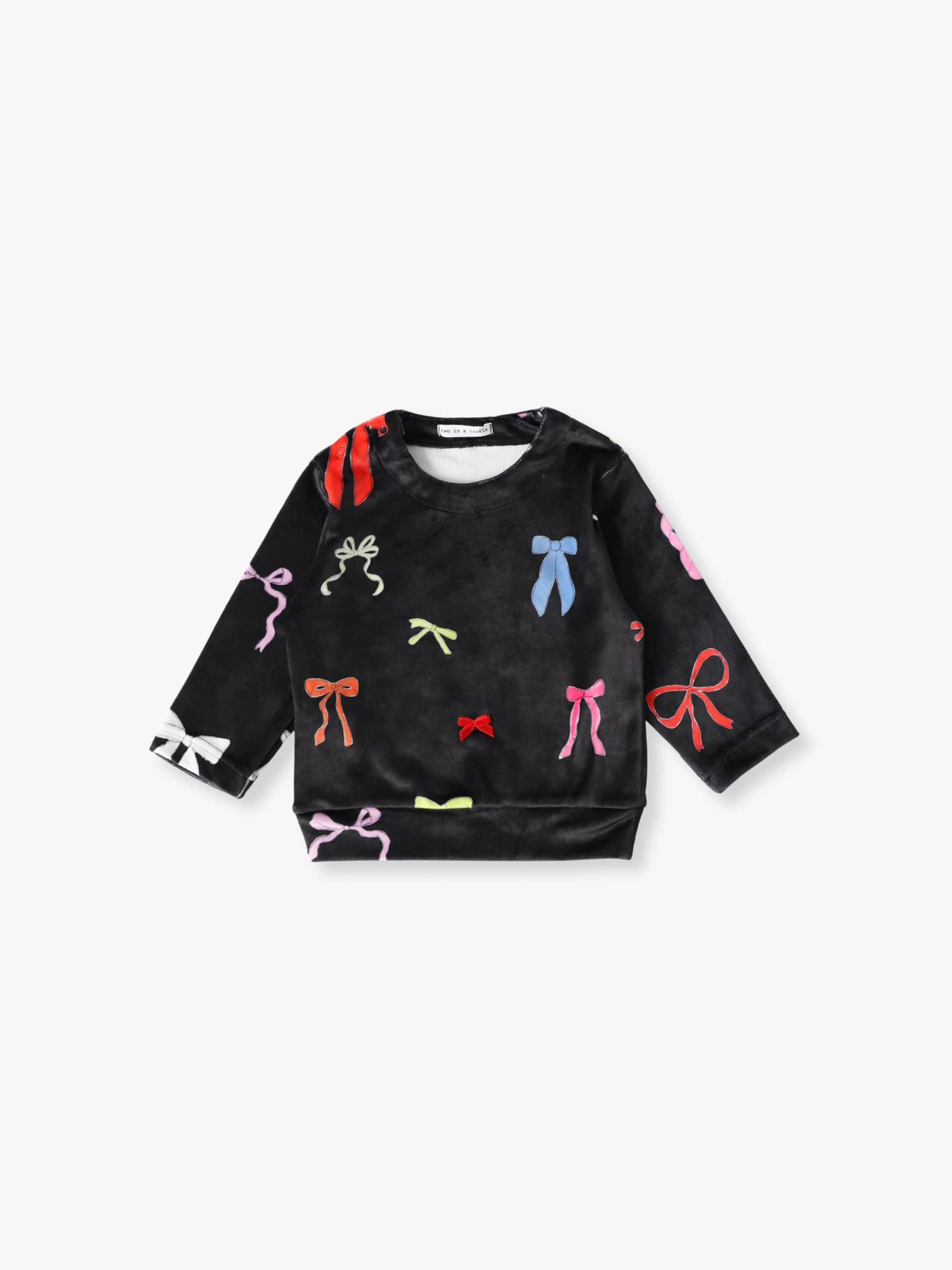 カラフルなリボンが散りばめられたセットアップは、ヘッドバンド付きで遊び心をくすぐるキュートなアイテムです。柔らかくあたたかなベロア素材を使用しているため快適な着心地です。パンツはウエストがゴム仕様で、着脱が簡単なところも嬉しいポイントです。