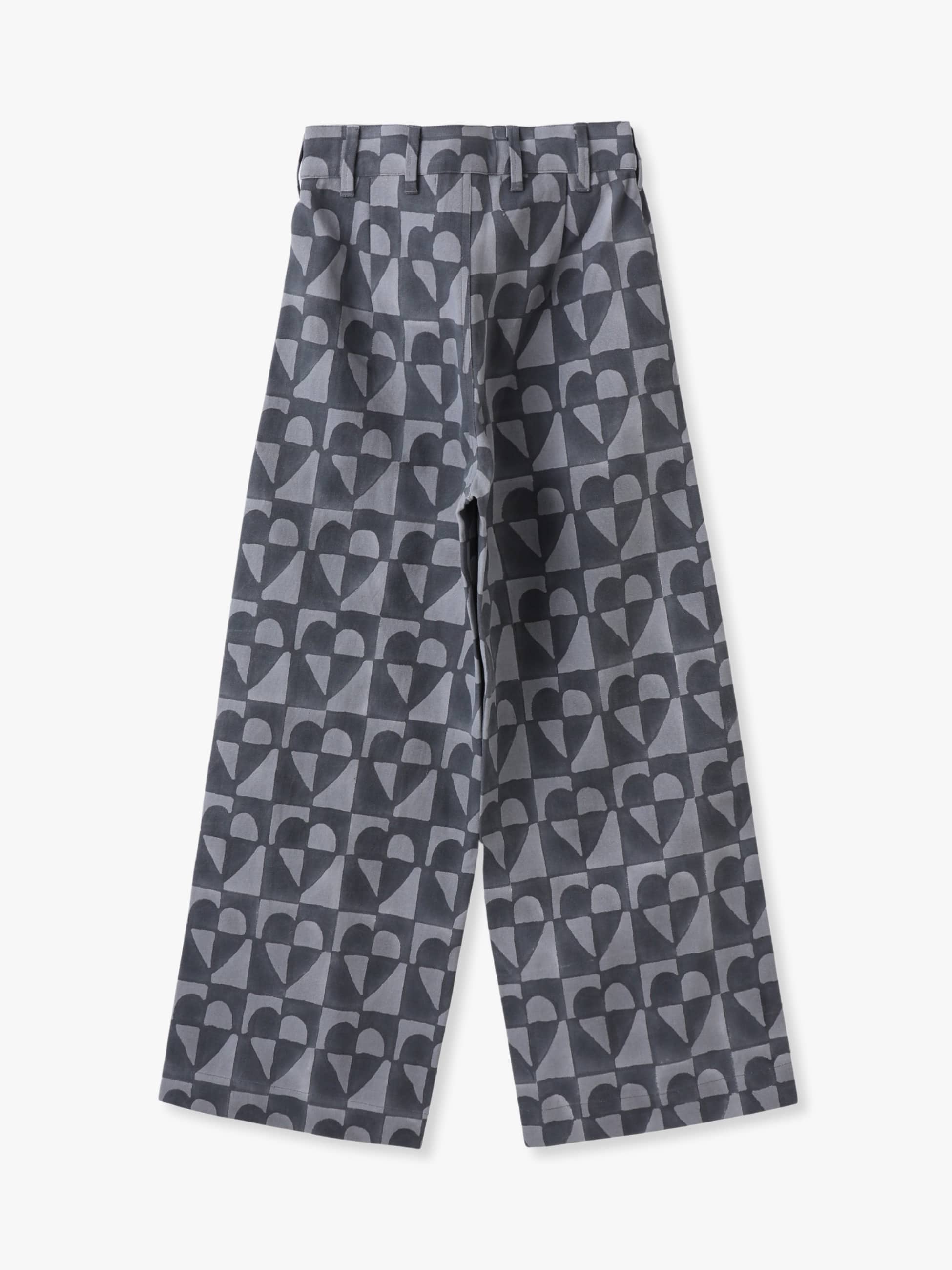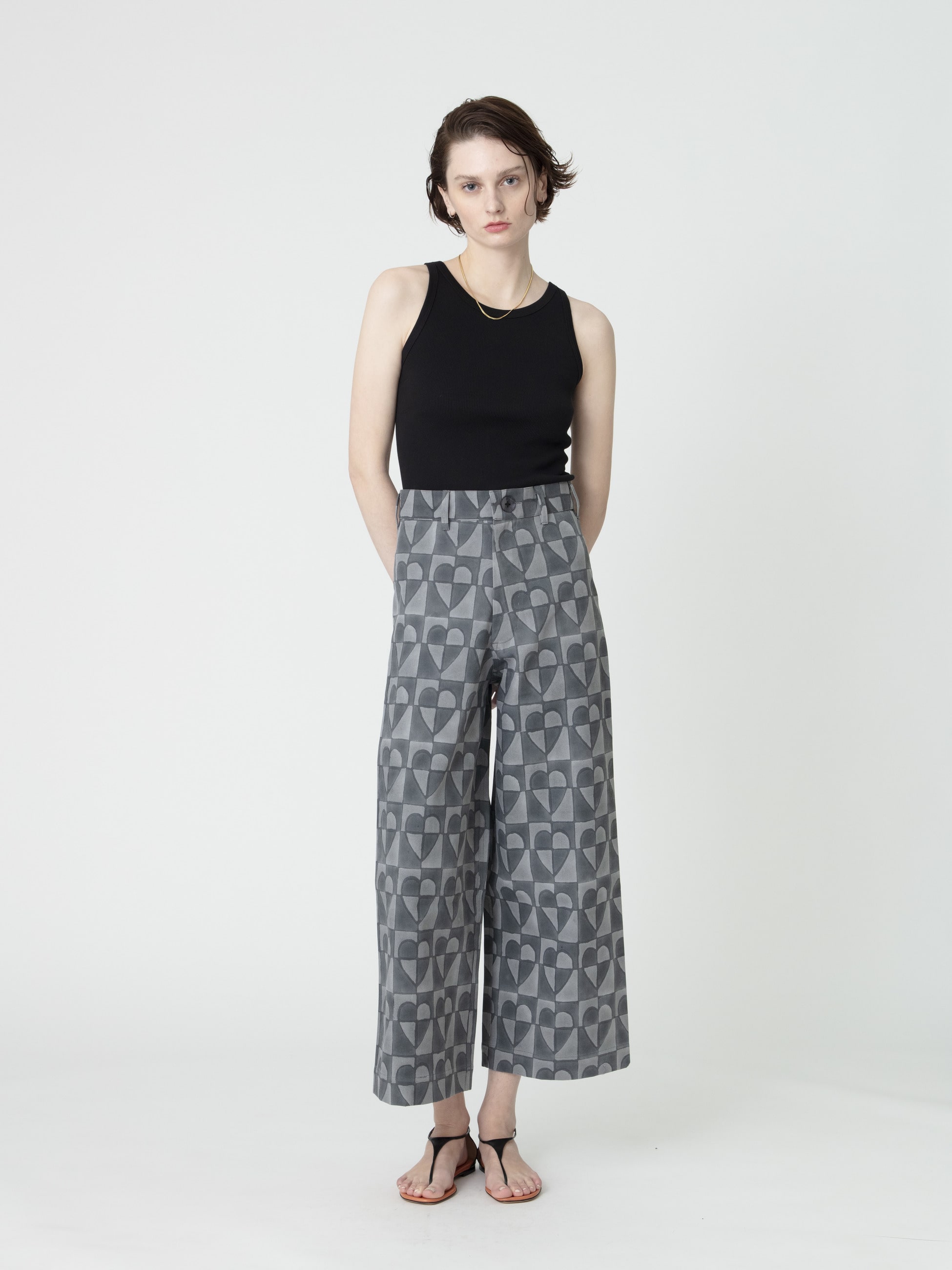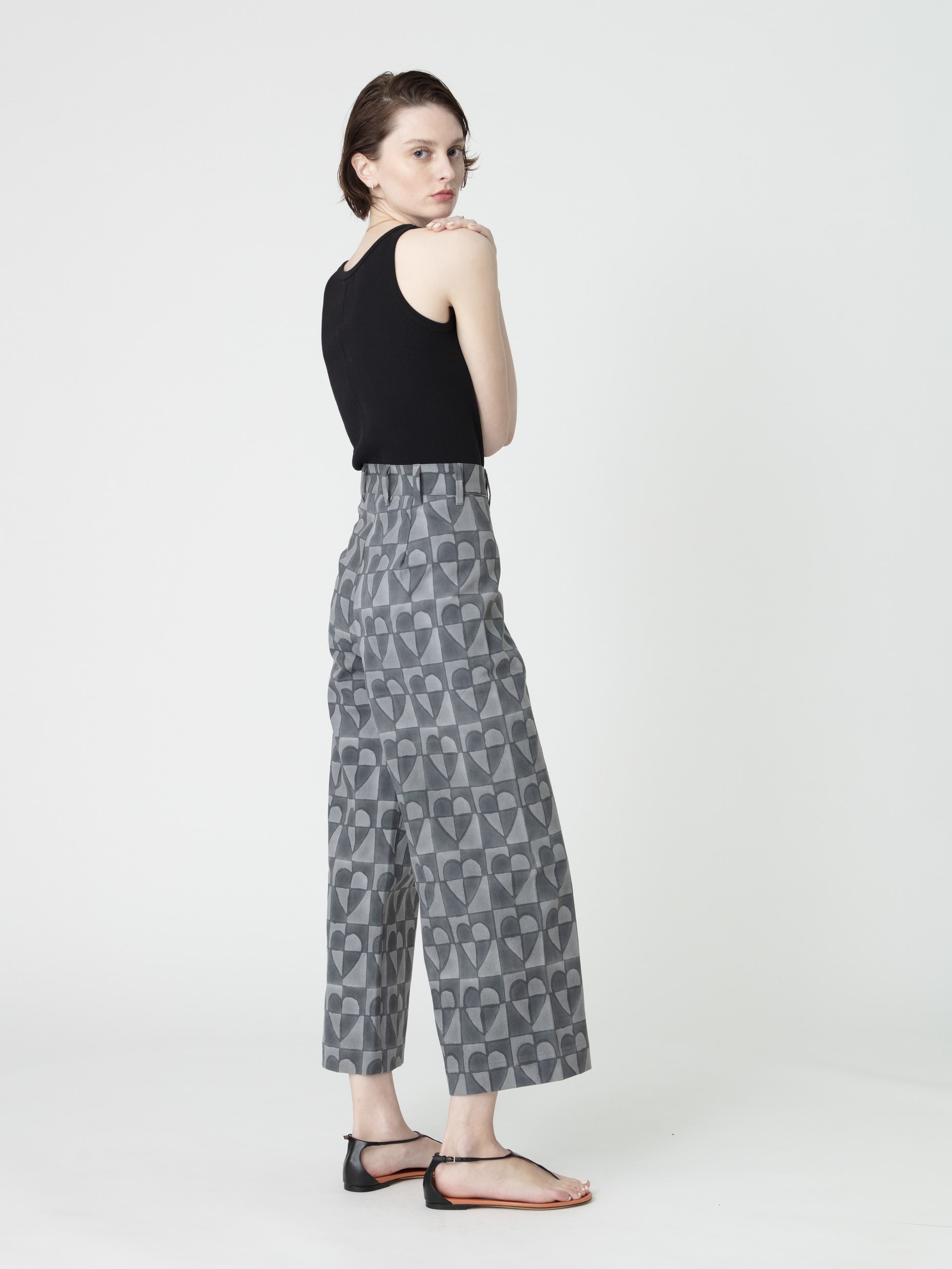 シックなブラックとグレーの配色にハート型クッキーのようなモチーフを忍ばせたディスコパンツは、ハイウエストのクロップド丈で立体的なワイドシルエットが特徴です。ハリのあるコットン素材を使用し、長いシーズンお楽しみいただけます。シンプルなトップスと合わせるだけでこなれ感を演出し、スタイリングの主役として活躍するアイテムです。