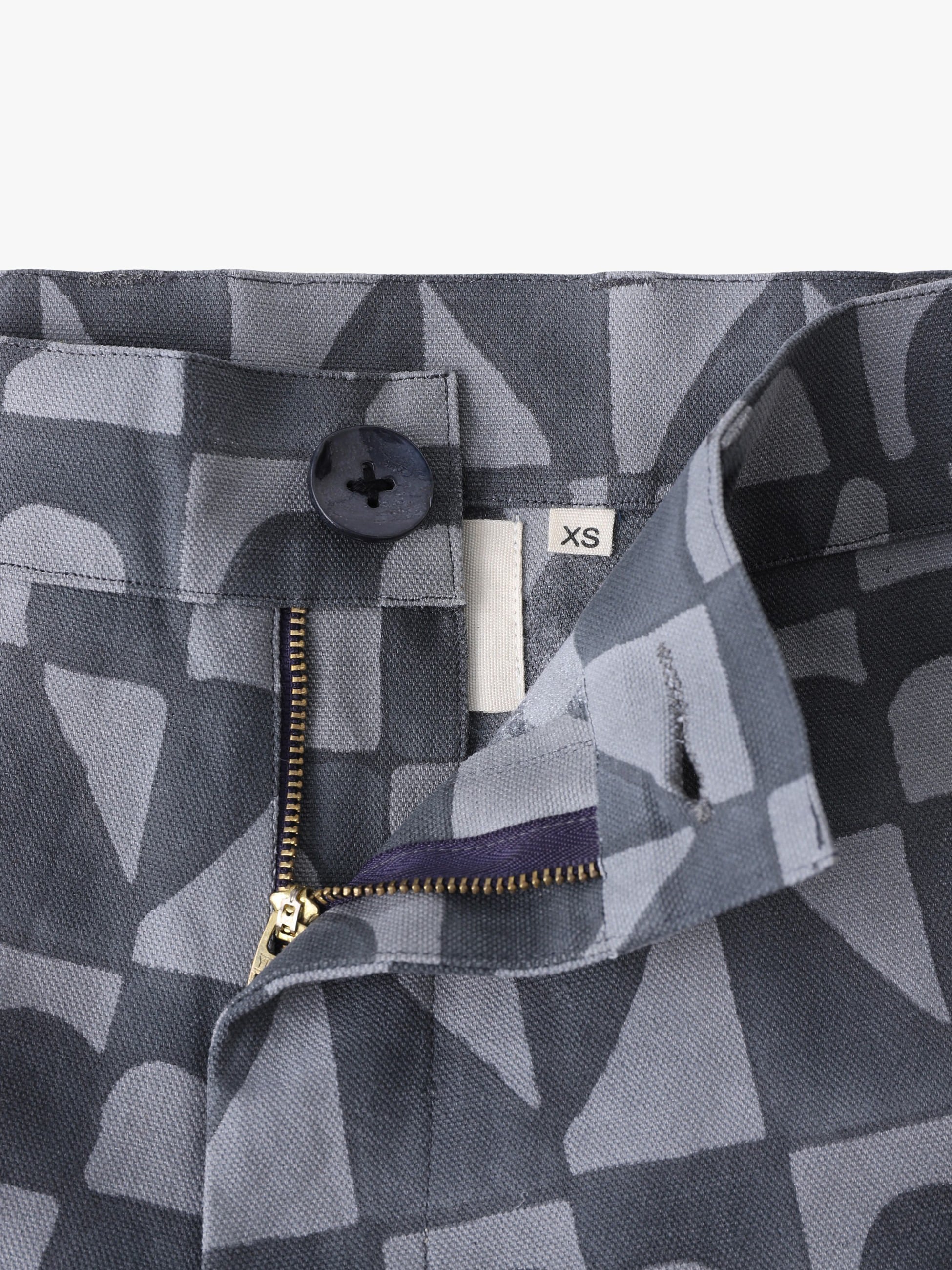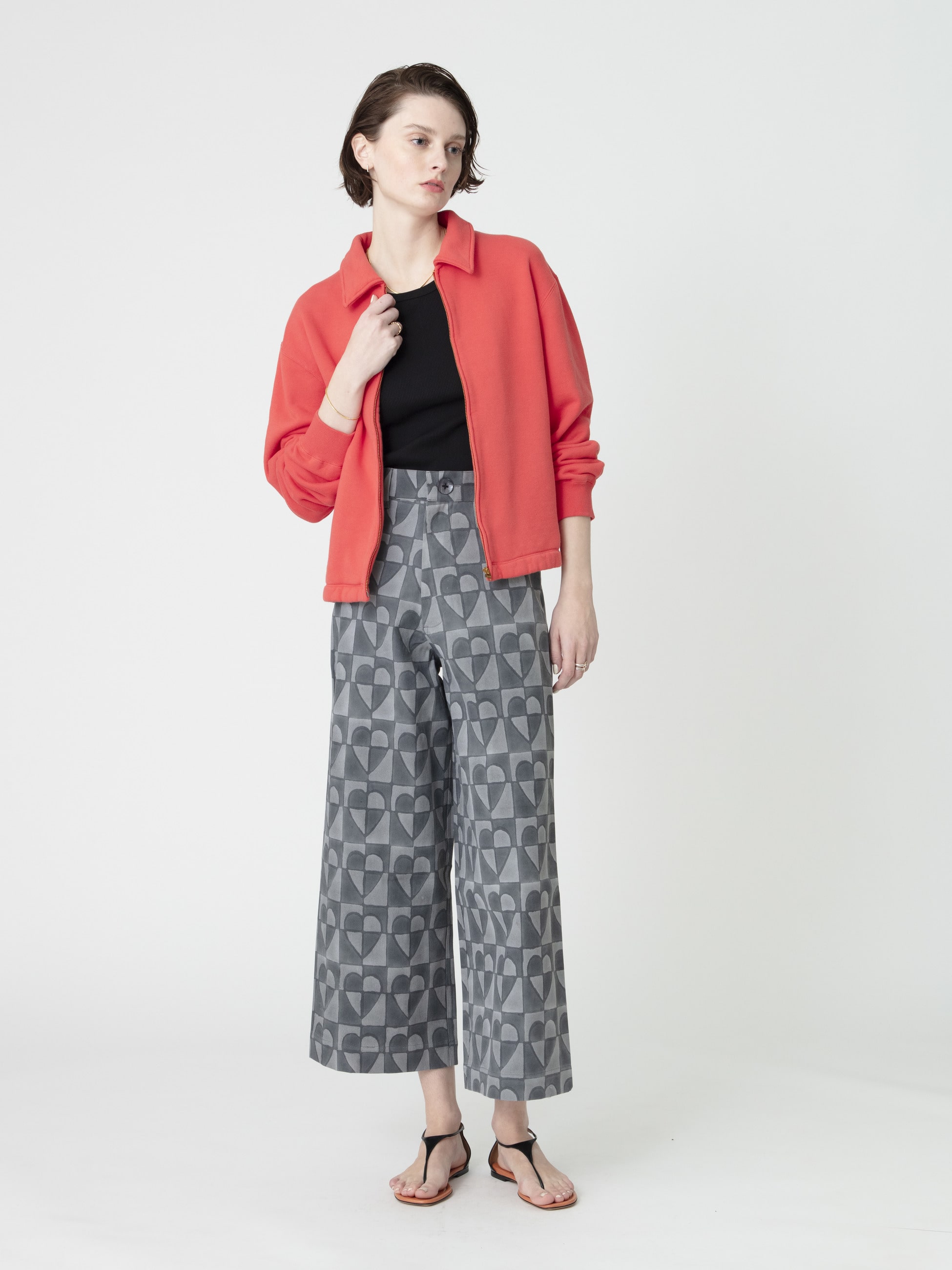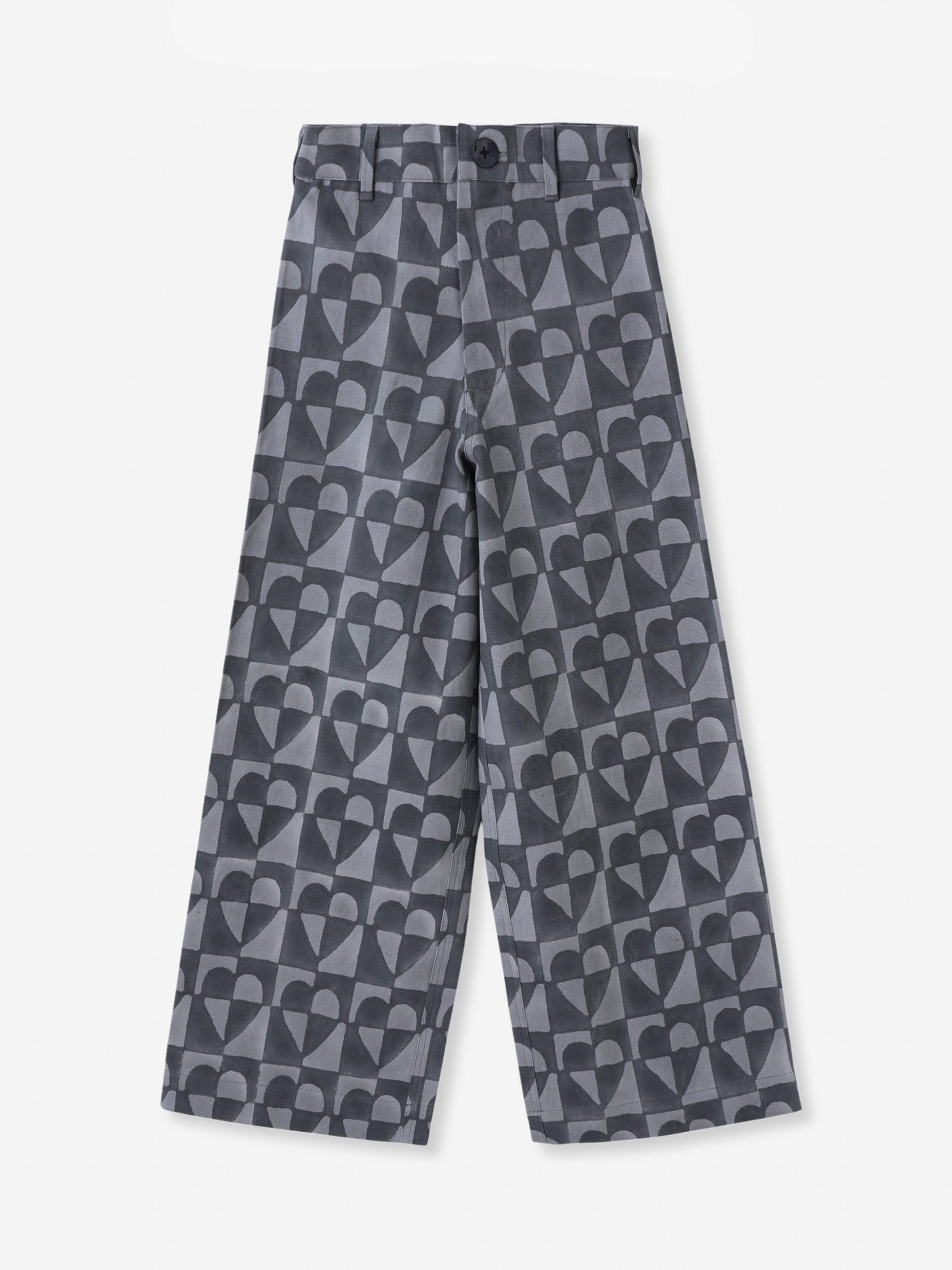 シックなブラックとグレーの配色にハート型クッキーのようなモチーフを忍ばせたディスコパンツは、ハイウエストのクロップド丈で立体的なワイドシルエットが特徴です。ハリのあるコットン素材を使用し、長いシーズンお楽しみいただけます。シンプルなトップスと合わせるだけでこなれ感を演出し、スタイリングの主役として活躍するアイテムです。
