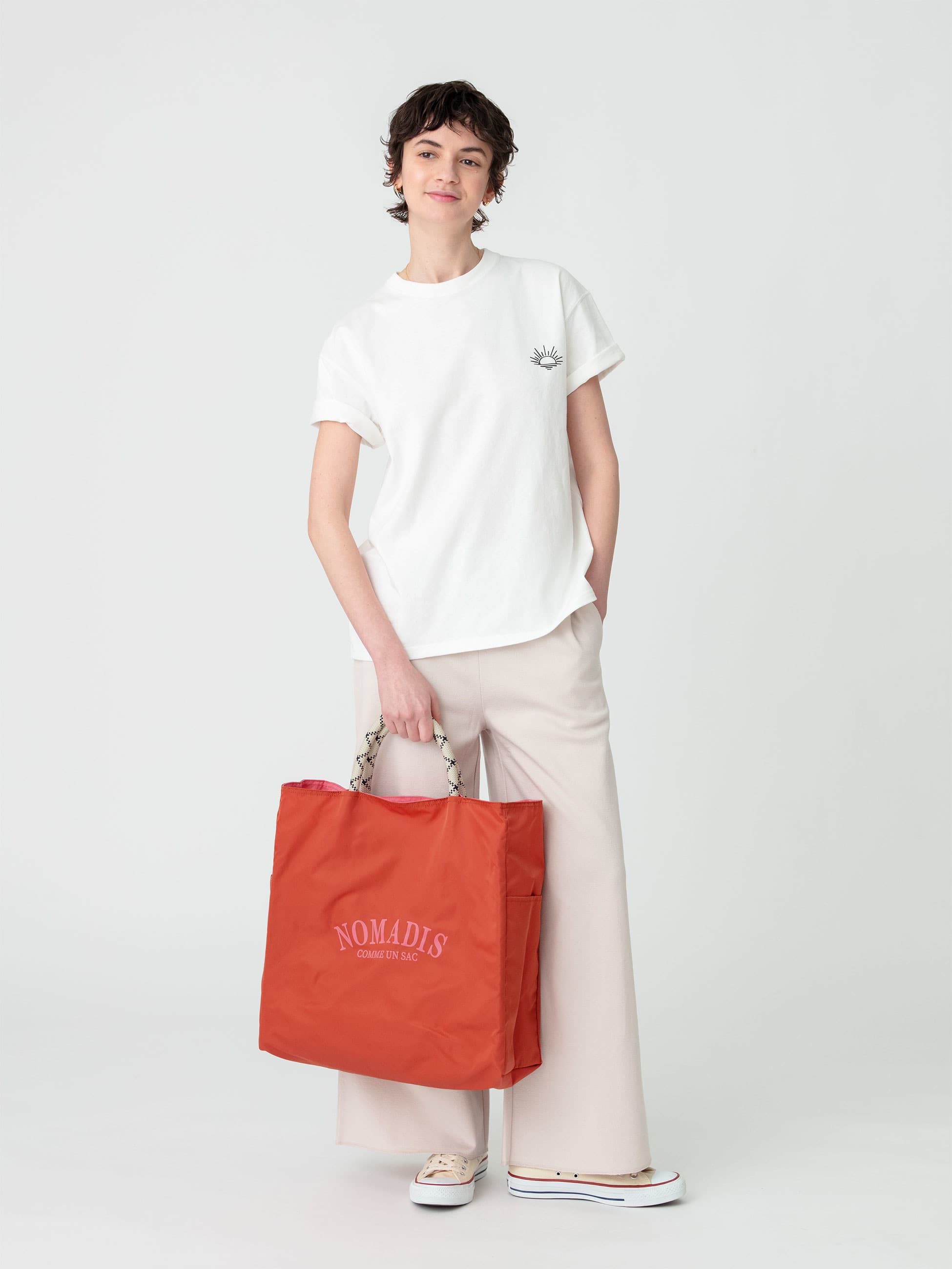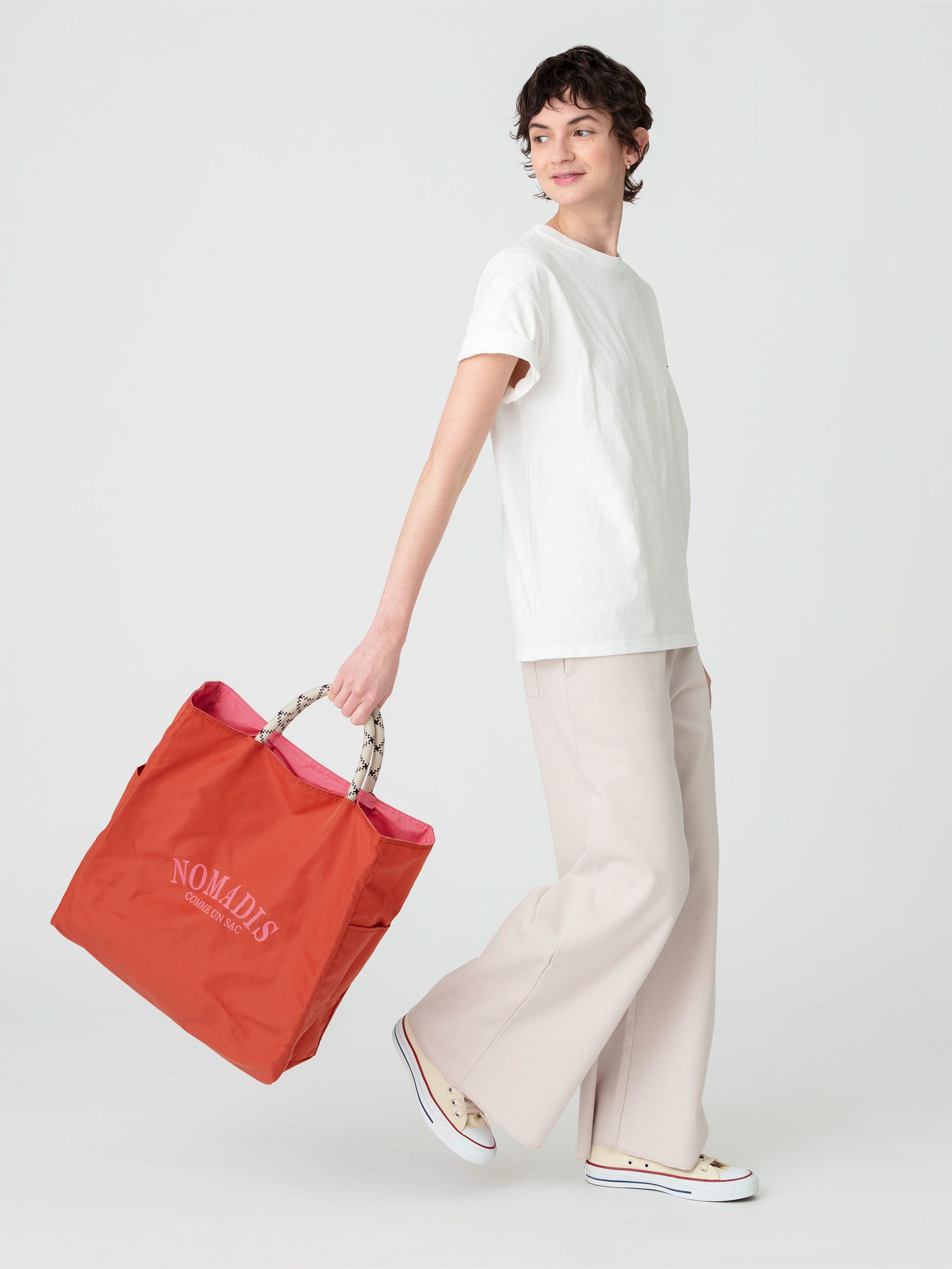 カレッジ風ロゴが映えるブランドのアイコン、NOMADIS SAC(ノマディス サック)。外面と内面でカラーが異なるリバーシブル仕様で、その日の気分やスタイルに合わせて表情を変えられるのが魅力です。肩掛け可能なロープハンドルは、重い荷物でも持ち運びやすい16mm幅。バッグの内外にはサイドポケットを配置。ワインボトルやタンブラー、小物の整理などに便利です。