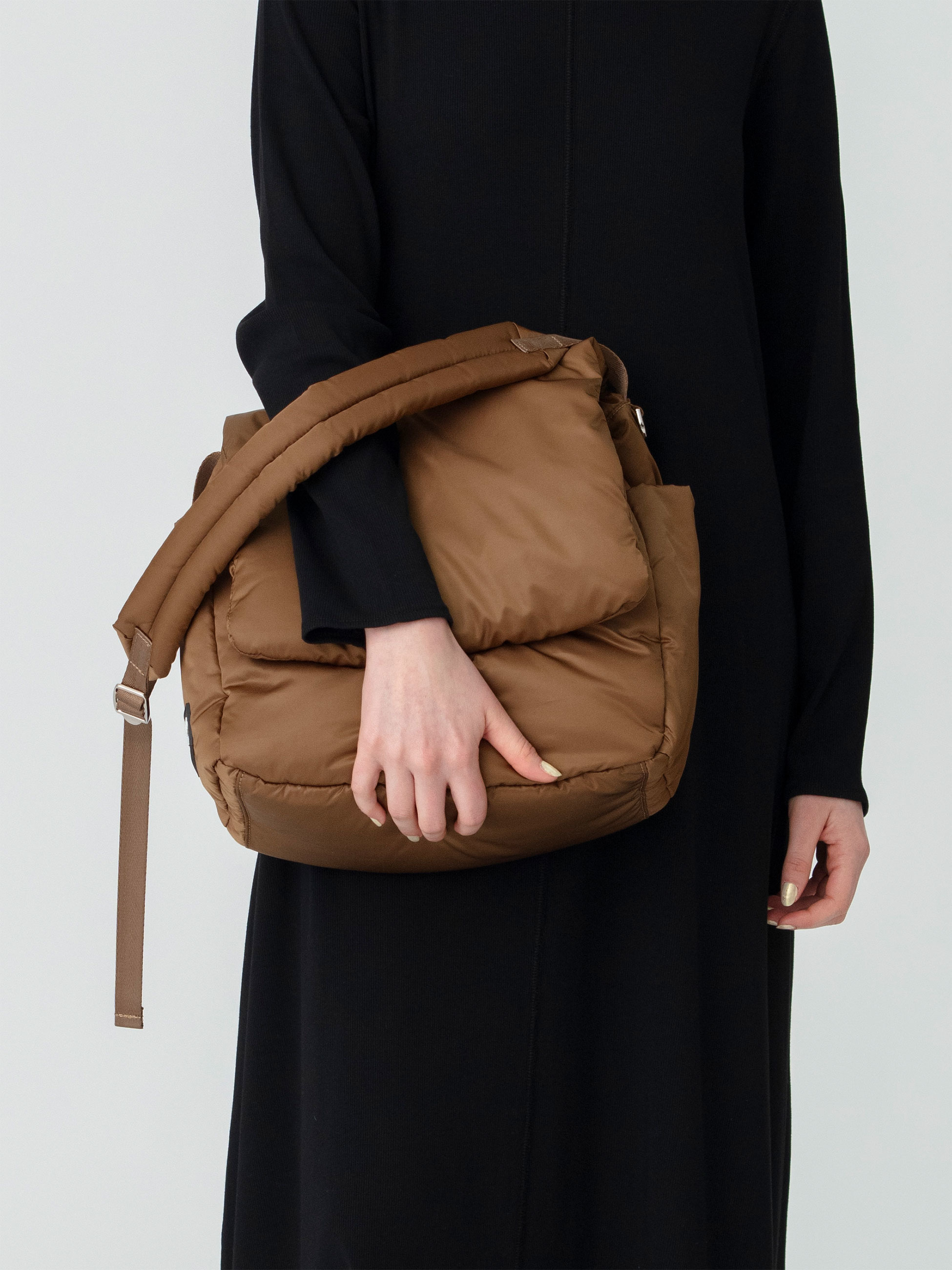 ミニマルなルックスと実⽤性を両⽴した「LUCK PACK(ラック パック)」は、バックパックの構造に着想を得たデザインに、中綿⼊りのパフィな質感が、柔らかく快適な使い心地です。フラップ内部の開⼝部はロープコードで絞ることができ、背⾯にはスナップボタン付きのビッグポケット、両サイドには深めのポケットを備えた⾼い収納⼒が、オンオフ問わずに活躍します。ストラップは⻑さ調整が可能で、ショルダー・クロスボディの2WAY仕様です。