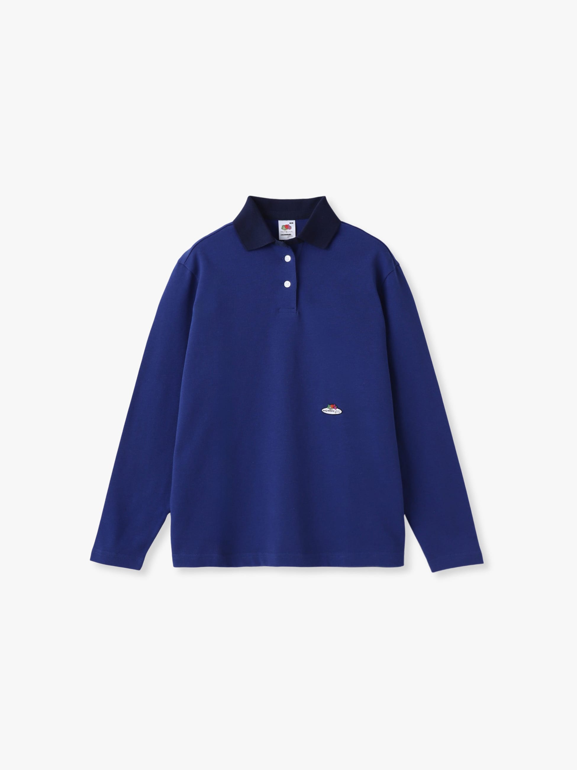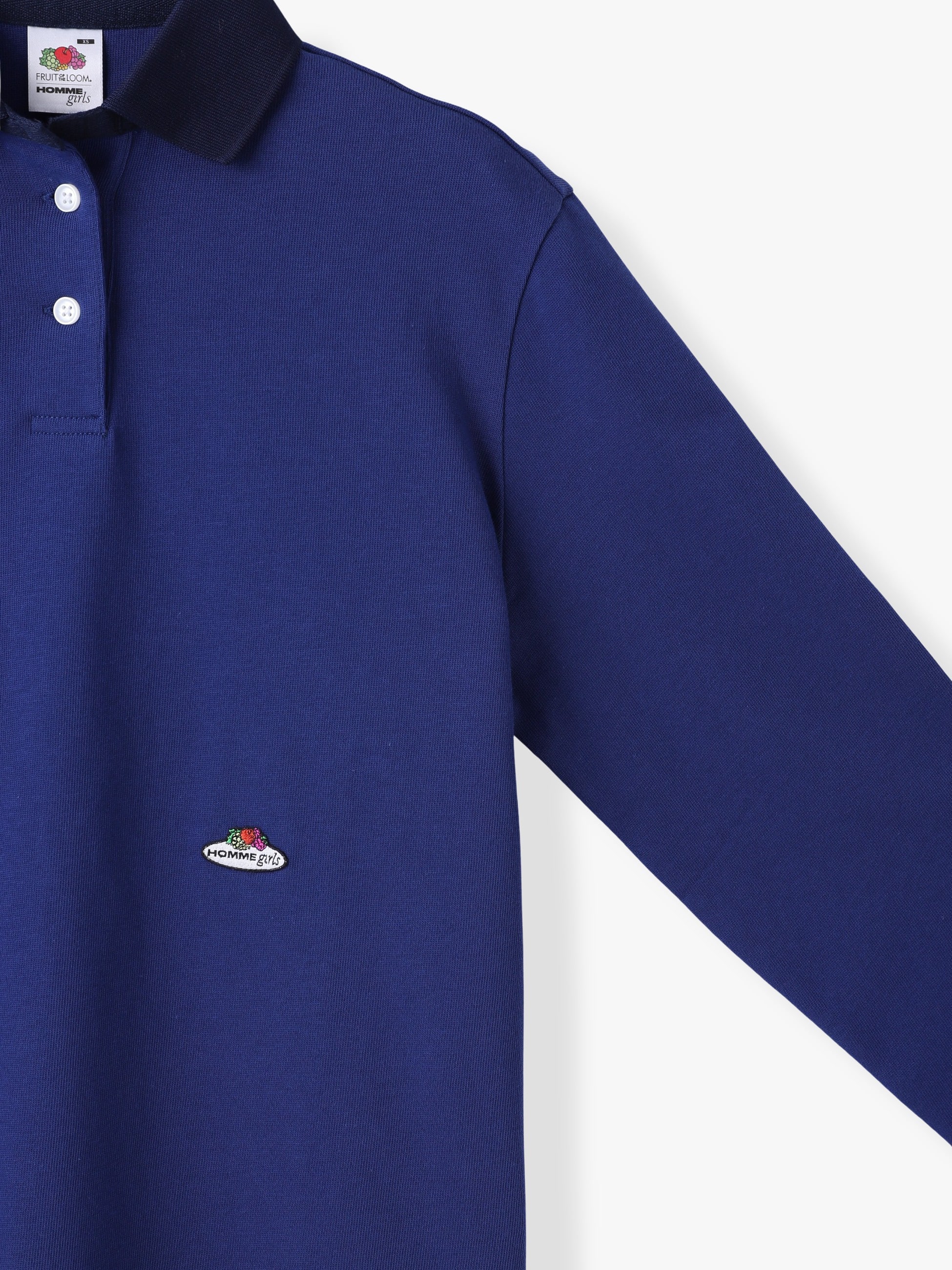 HOMME GirlsとFruit of the Loomの初めてとなるコラボレーションアイテムが登場です。鮮やかなネイビーが華やかなロングスリーブのポロトップスは、ネイビーのコントラストカラーがアクセントです。ゆったりとしたシルエットは、デイリーユースにもぴったりで、HOMME Girls x Fruit of the Loomの刺繍ロゴパッチがさりげないワンポイントです。同型のマルチストライプ柄はこちら