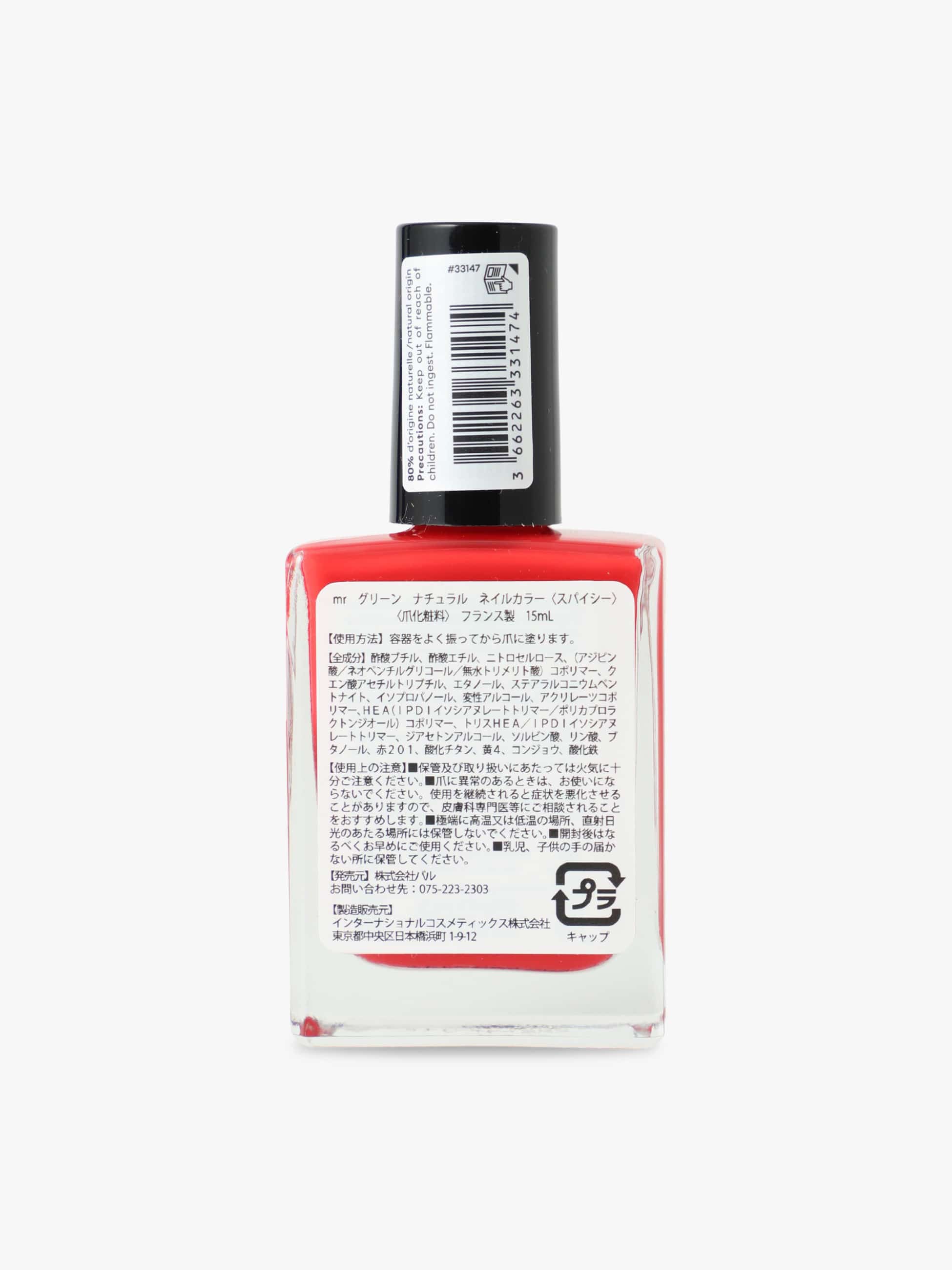 - 『グリーン』は、植物由来成分を使用したヴィーガン・クルエルティフリー処方で、爪にも環境にも優しいネイルポリッシュです。ピンクみを帯びたポップなレッドのスパイシーは、鮮やかで力強い発色が手元を一瞬で主役にし、気分を高めてくれます。クラシックとモダンを併せ持ち、スタイルを選ばずアクセサリー感覚で楽しめます。