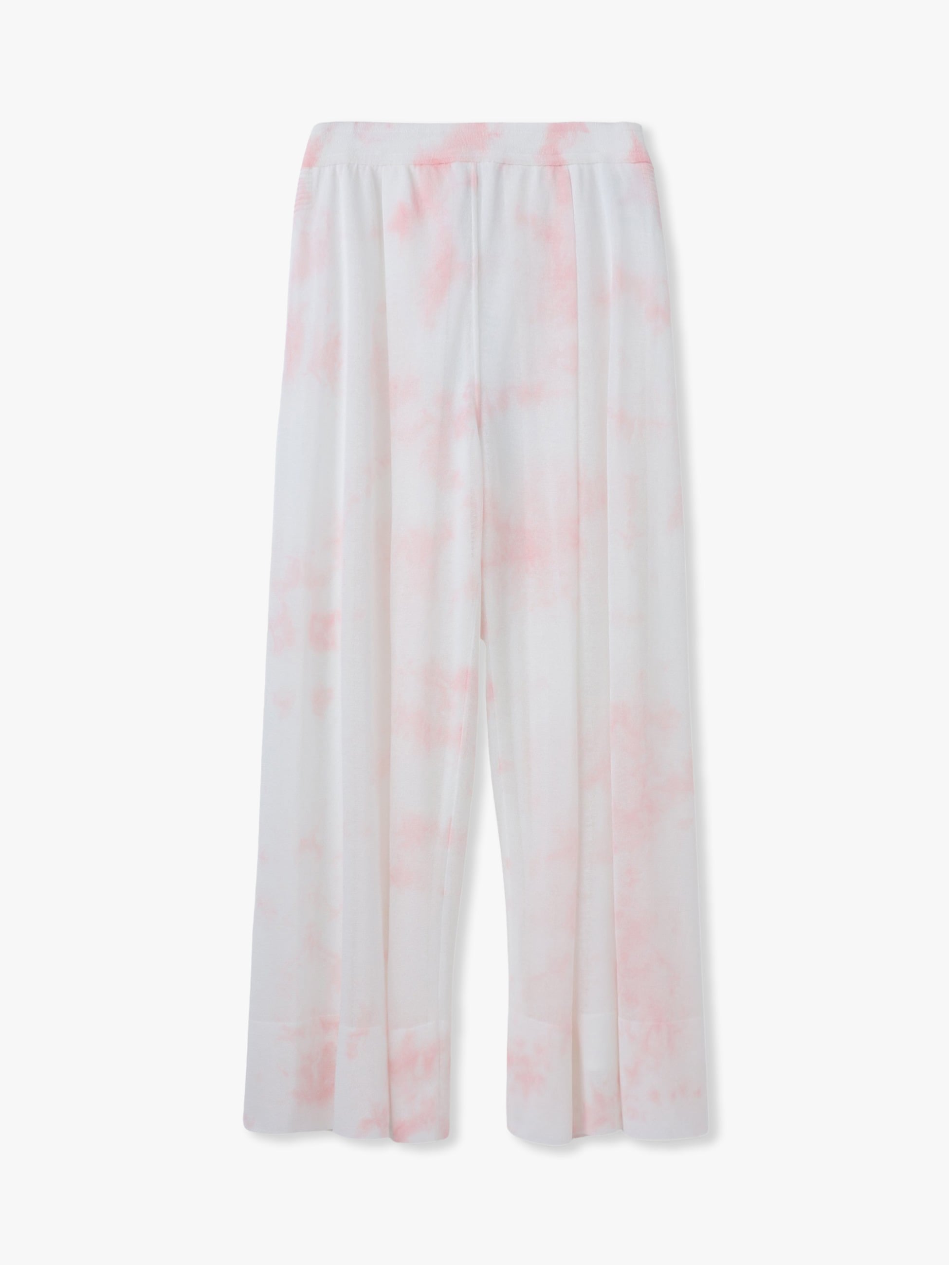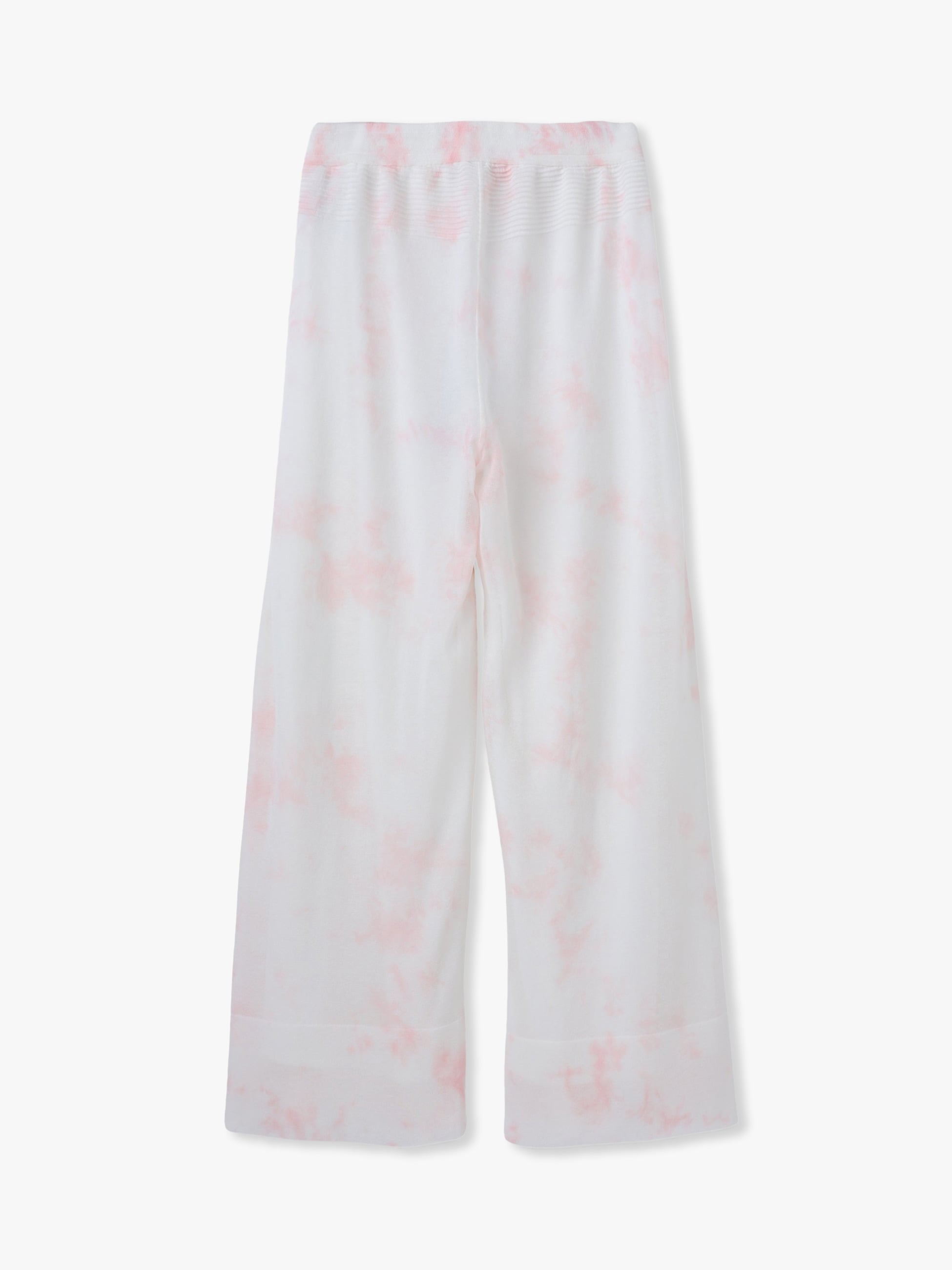 - 光を通す薄手のセミワイドパンツは、一点ずつ職人が手作業で染め、染色のプロセスそのものが模様で表現されています。裏地付きでウエストはストレッチ性に優れ、縫い代がなく快適な着心地です。