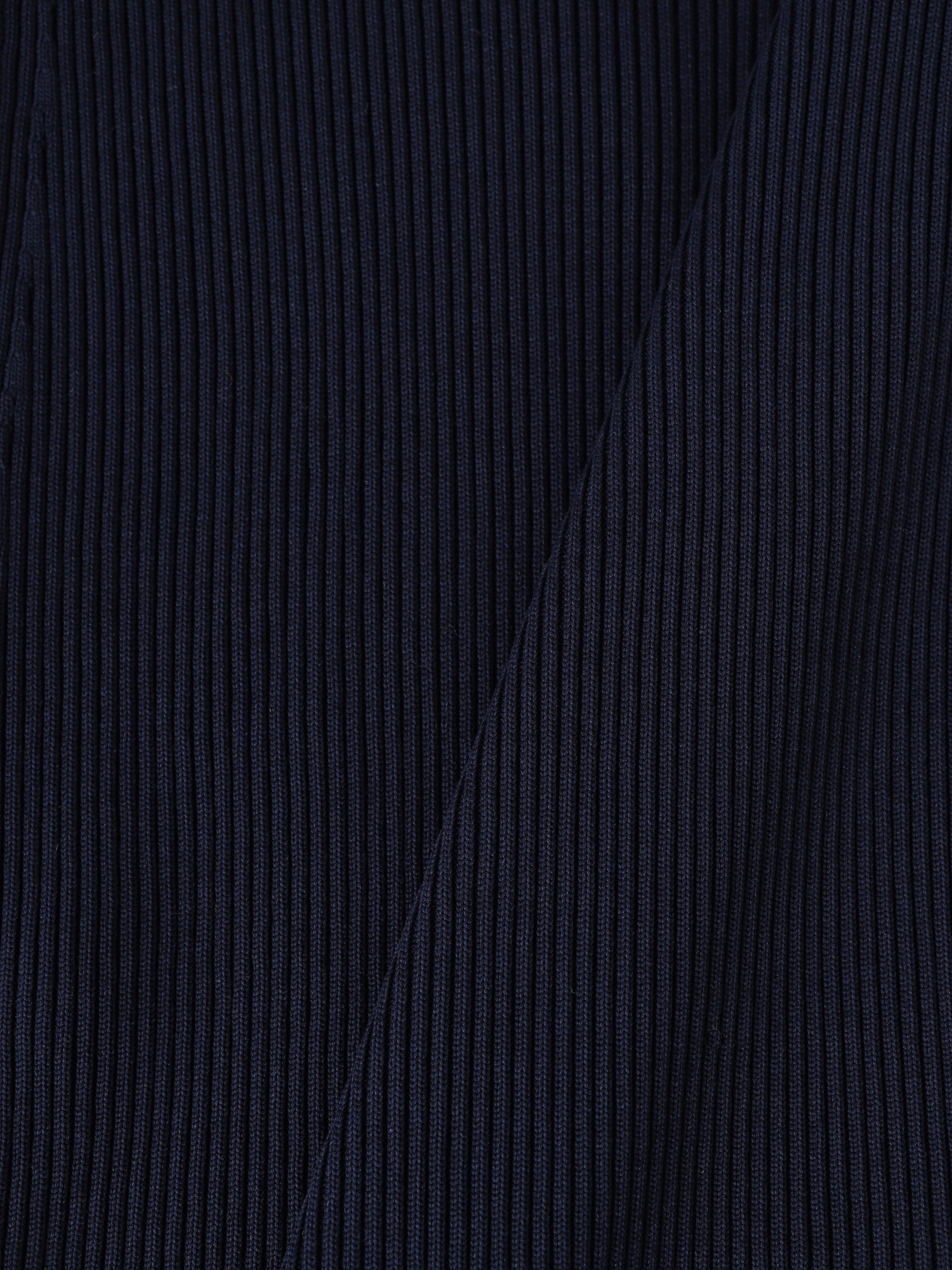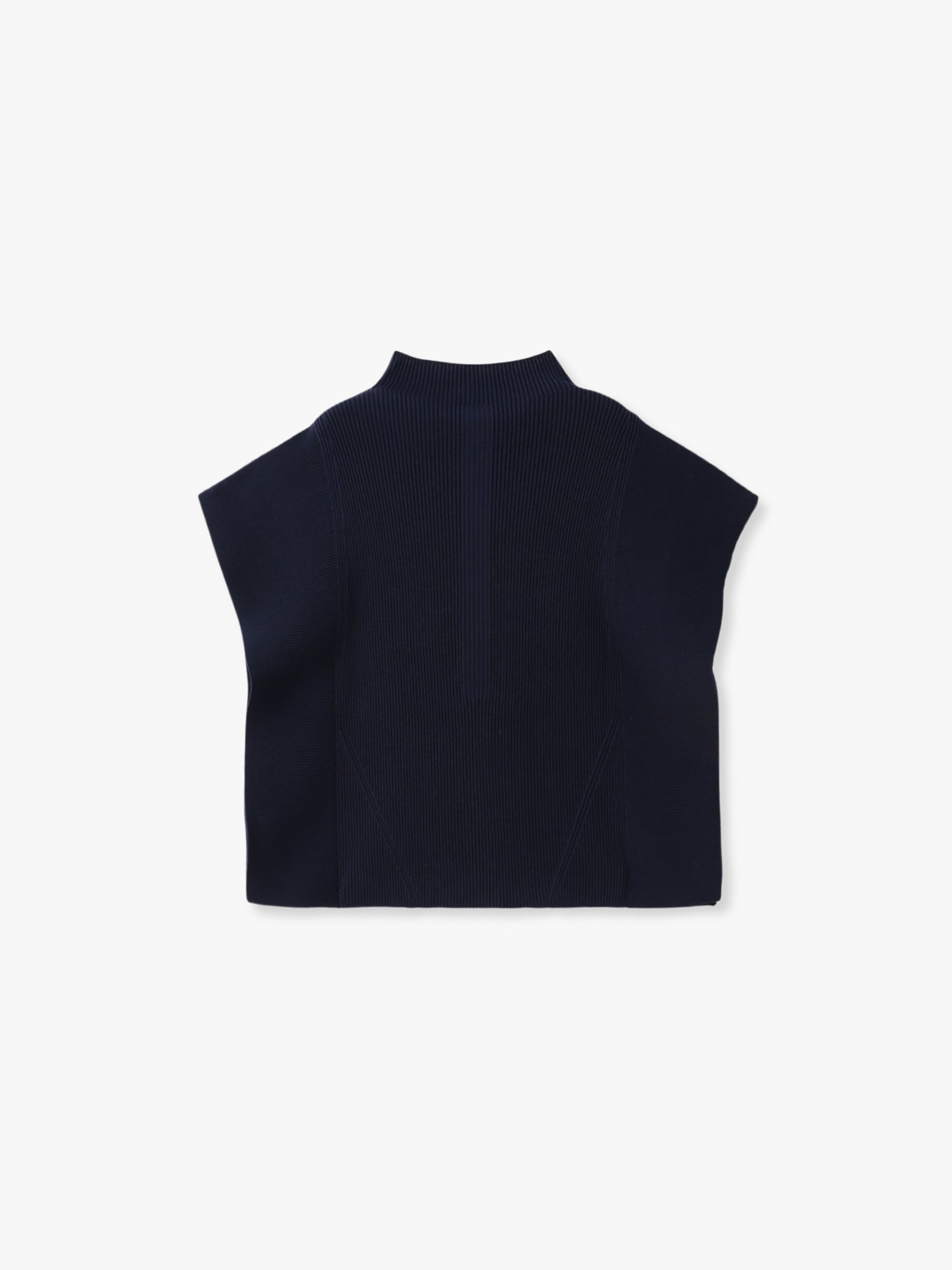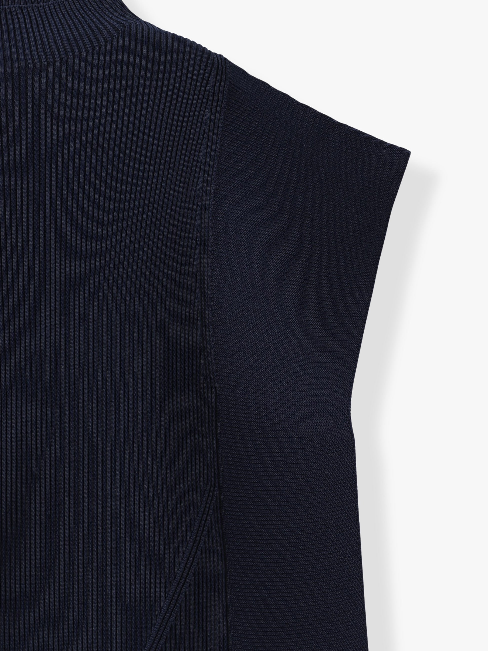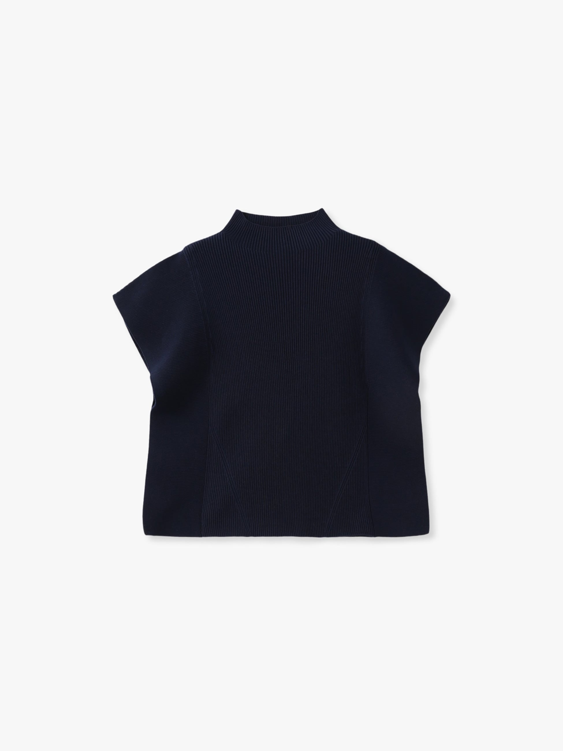 - フィット感のあるモックネックのスリーブレストップスは、左右のドレープが美しく、着用するとフレンチスリーブのようなシルエットです。コンピュータープログラミングによって設計されたリブラインがシャープな印象で、光沢のある糸を用いた編み地がほどよく上品さをプラスします。縫代がなく、ストレッチ性に優れているので快適な着心地です。