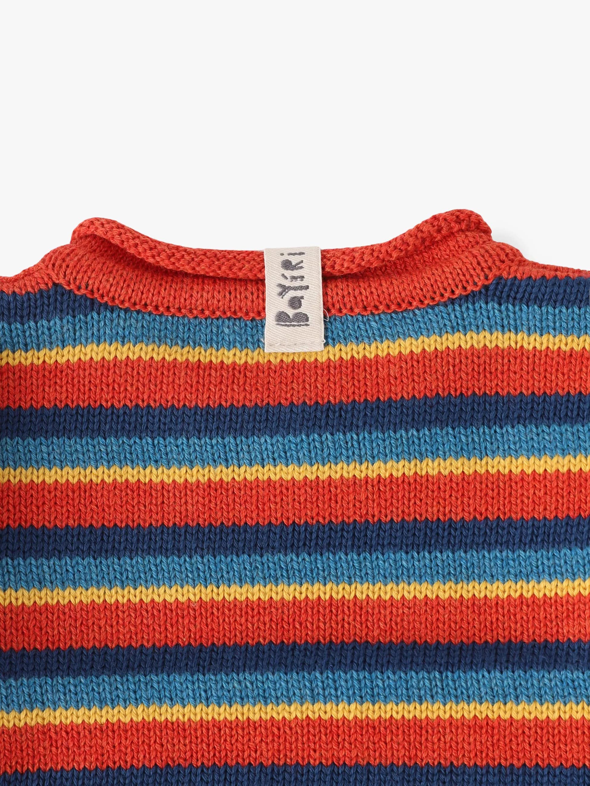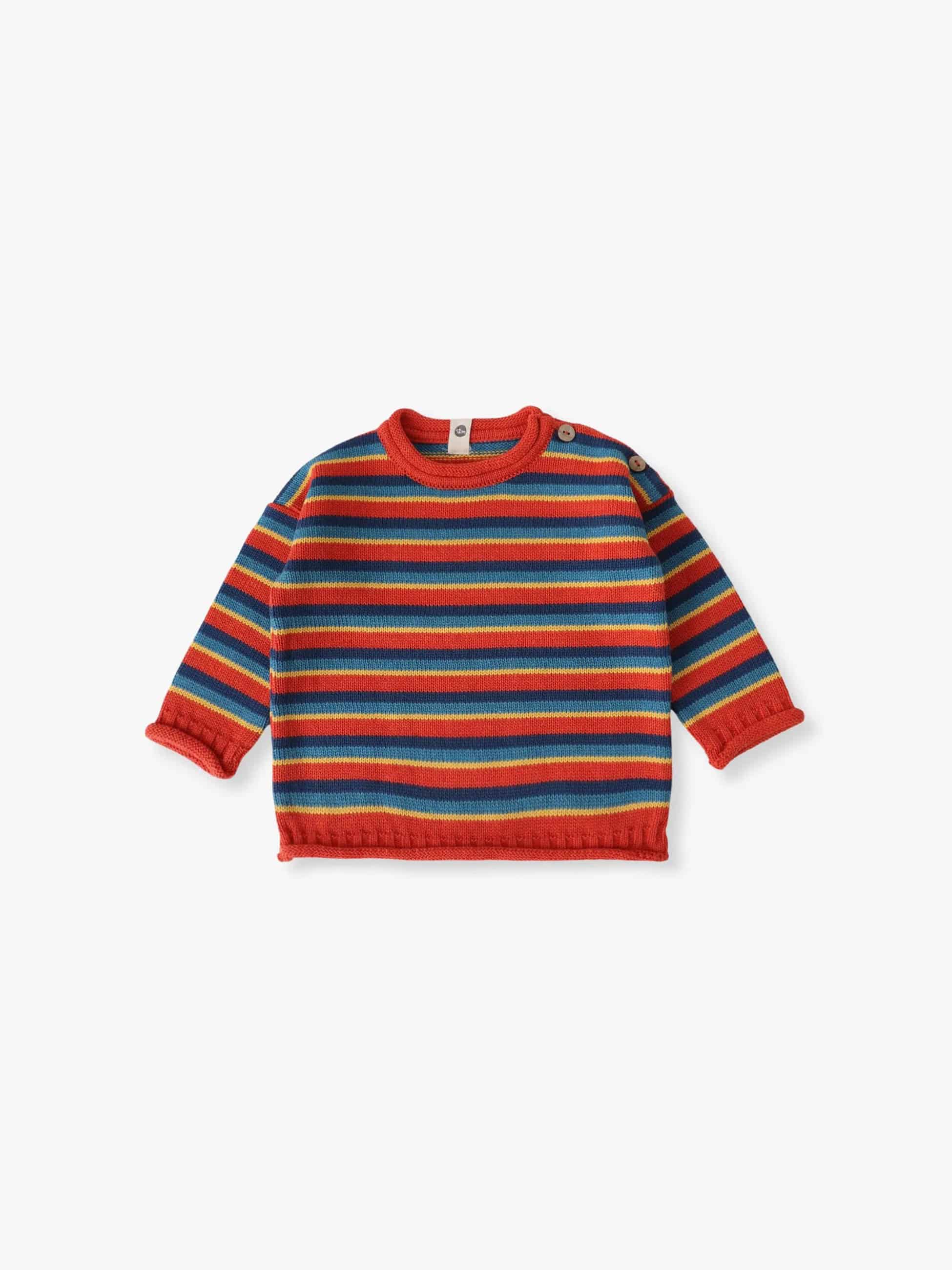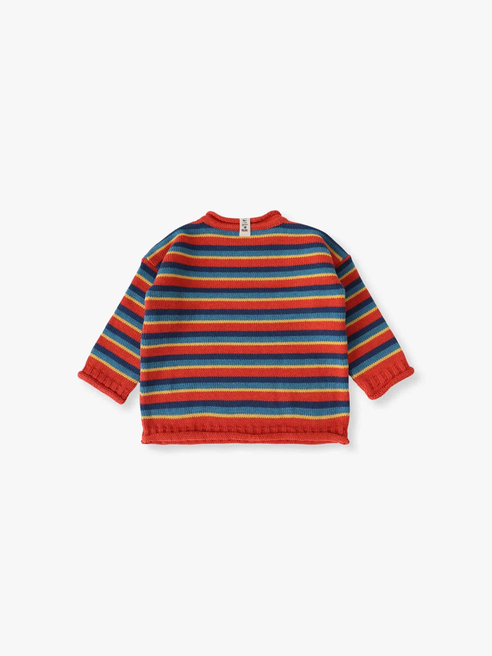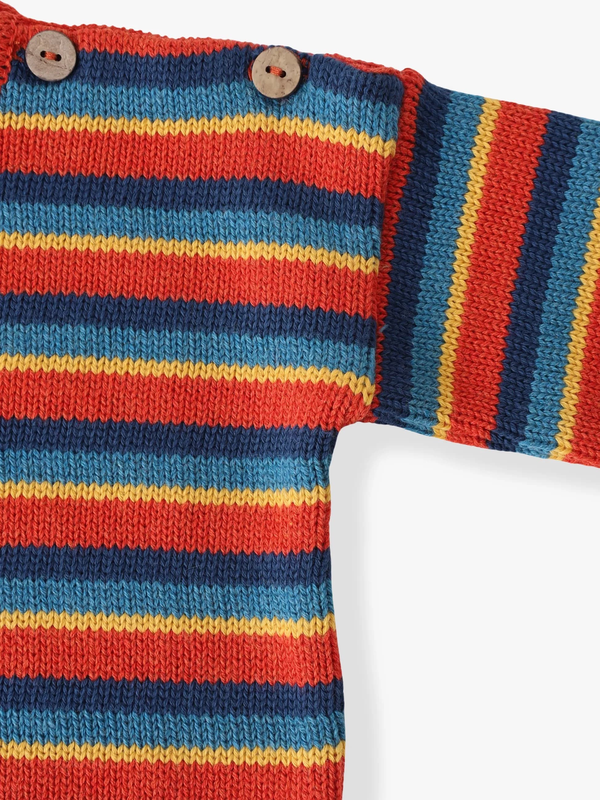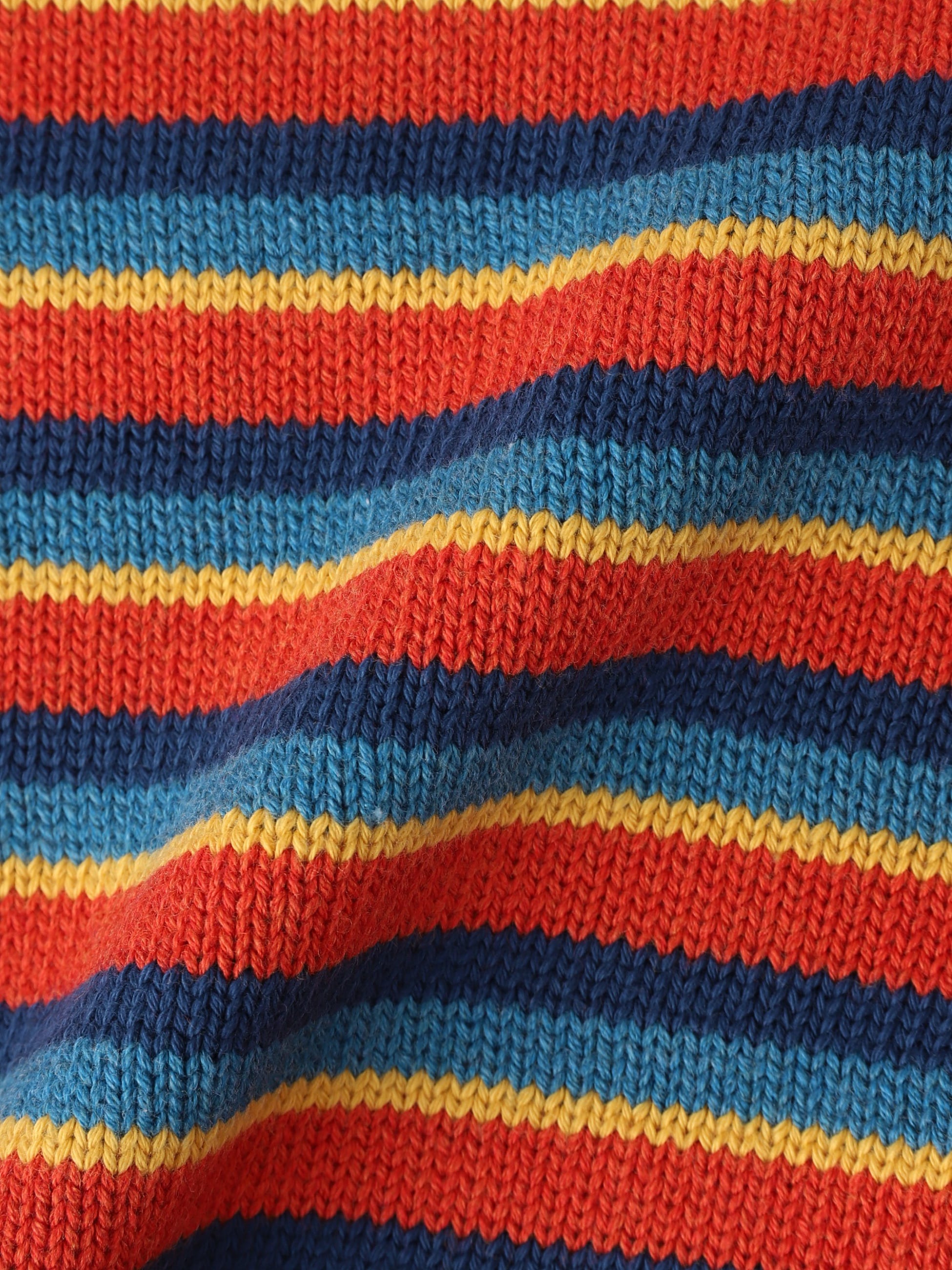 鮮やかなマルチカラーのストライプが目を惹くボックスシルエットのニットは、コーディネートを明るく彩ります。厚みのあるしっかりとした編み地が、寒い季節にも暖かく着ていただけます。 ショルダーにはココナッツボタンがついているため簡単に着脱でき、ナチュラルな雰囲気がデザインのさりげないポイントになっています。