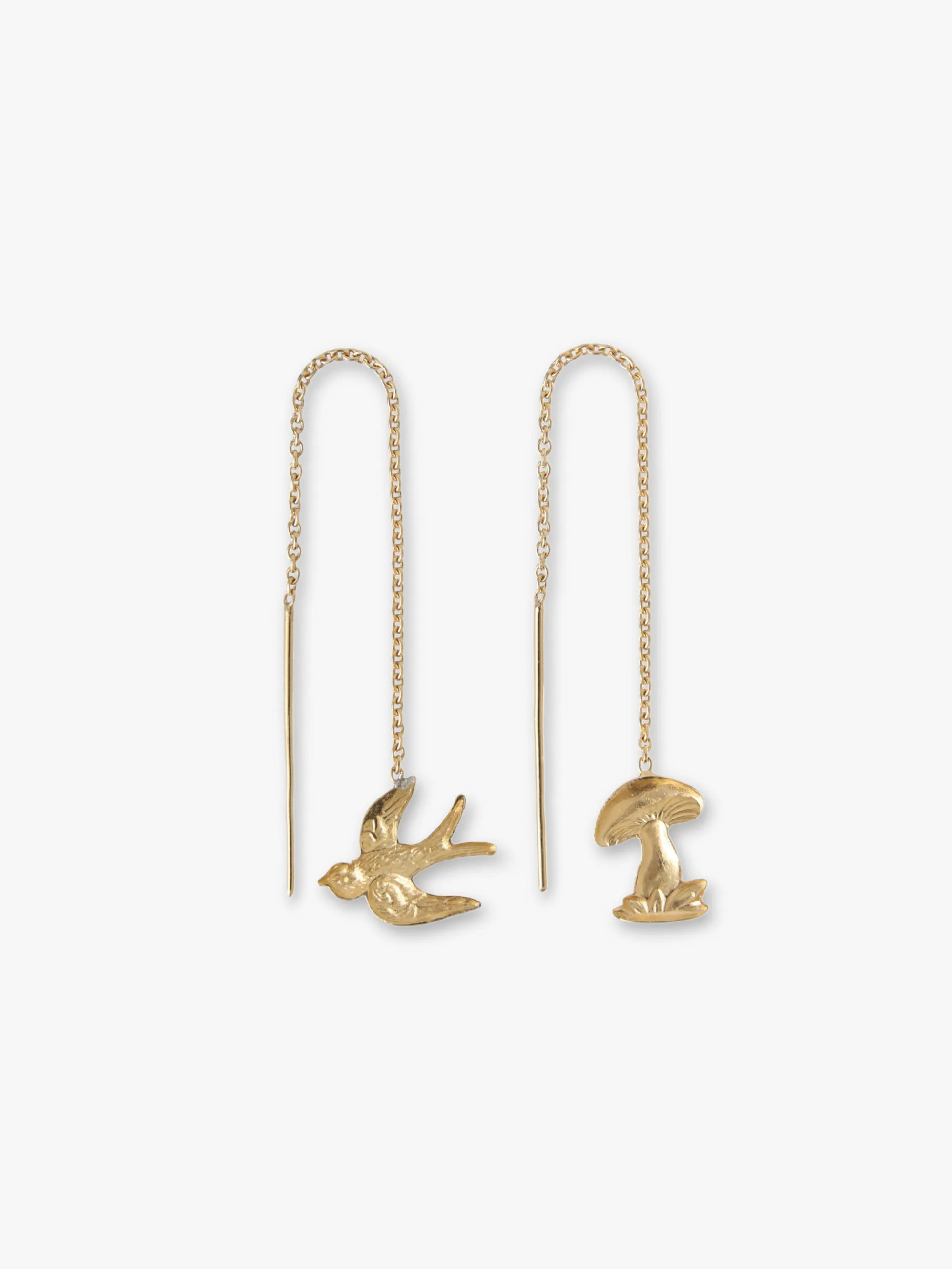 - ツバメとキノコをあしらったアシンメトリーなアメリカンピアスは、優美でありながらも愛らしいモチーフが揺れ動き、コーディネートに遊び心をプラスします。お手持ちのピアスとレイヤードしていただくのもおすすめです。