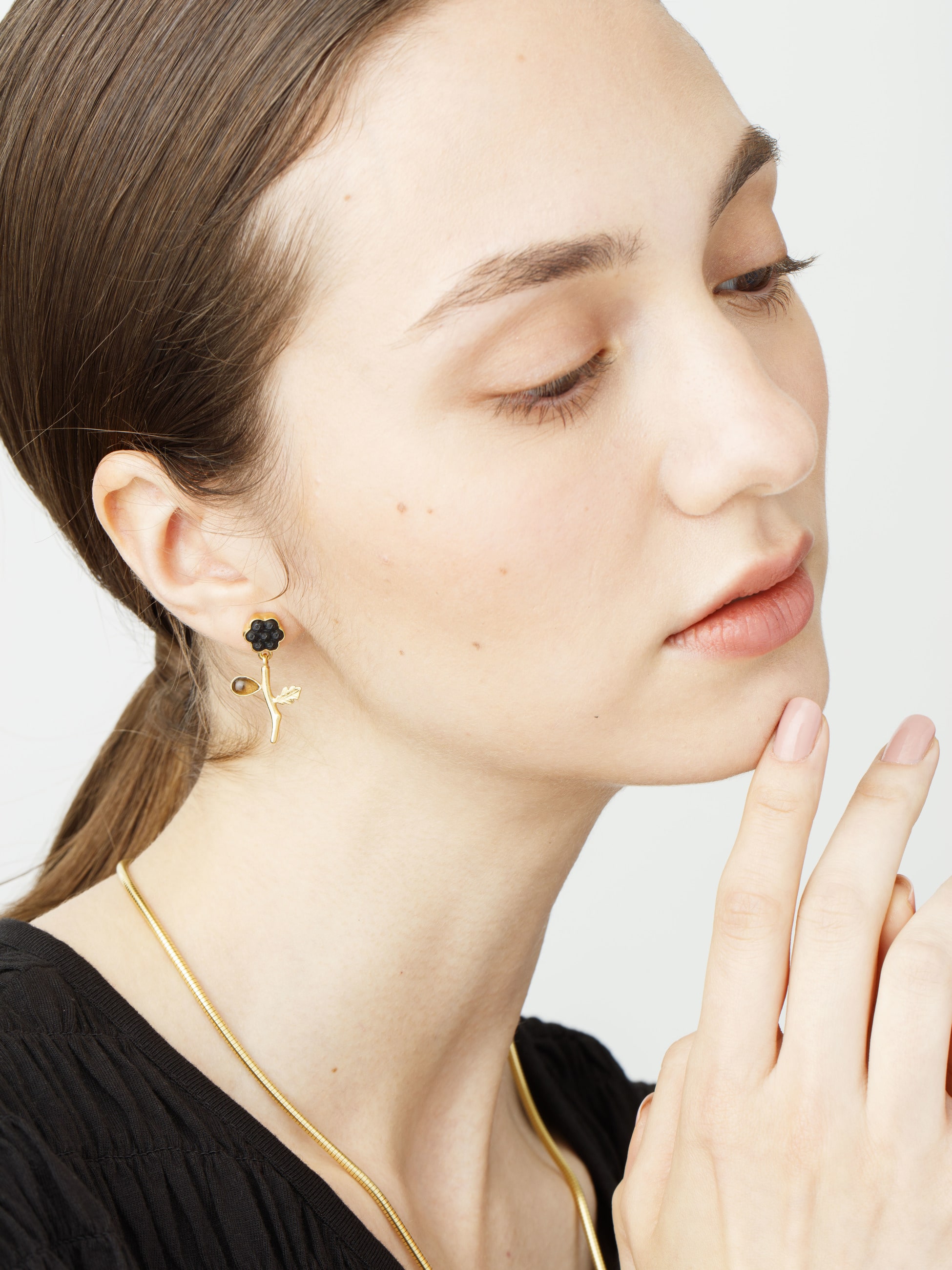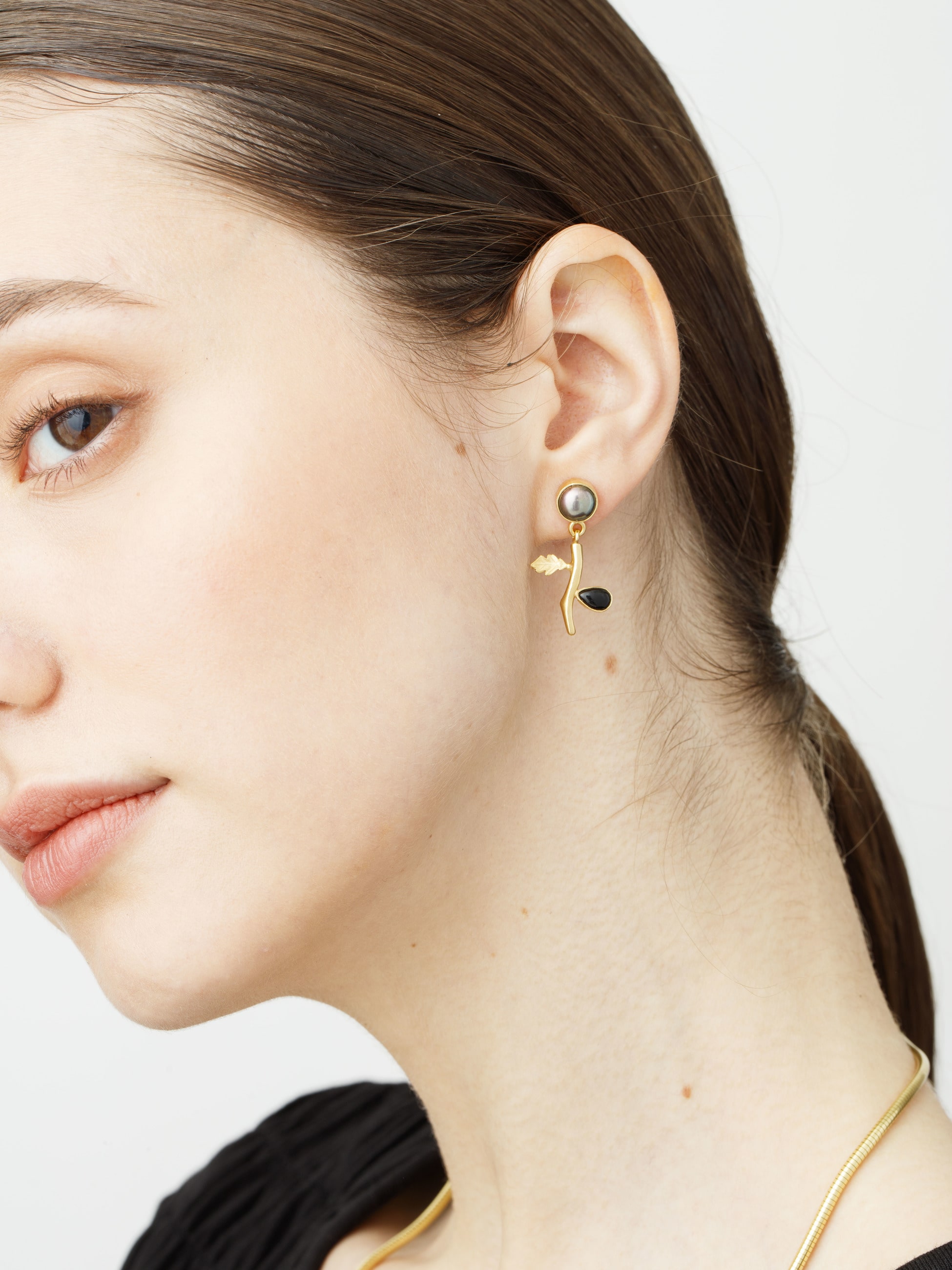 - 愛らしいフォルムが目を惹くボタニカルモチーフのピアスは、シックなブラックトーンとアシンメトリーデザインが新鮮で、大人のカジュアルスタイルにも合わせやすく、程よいボリューム感と存在感をお楽しみいただけます。