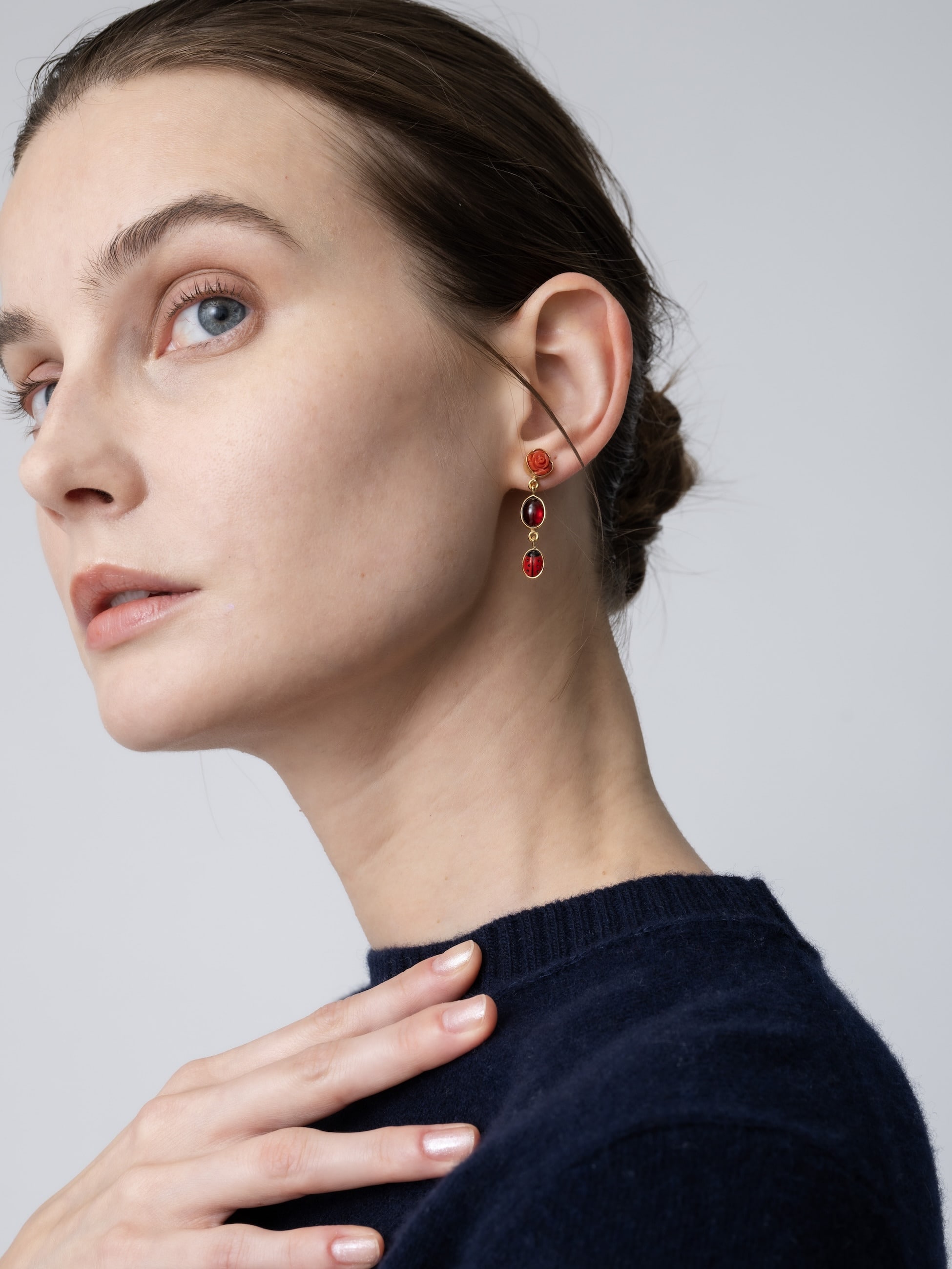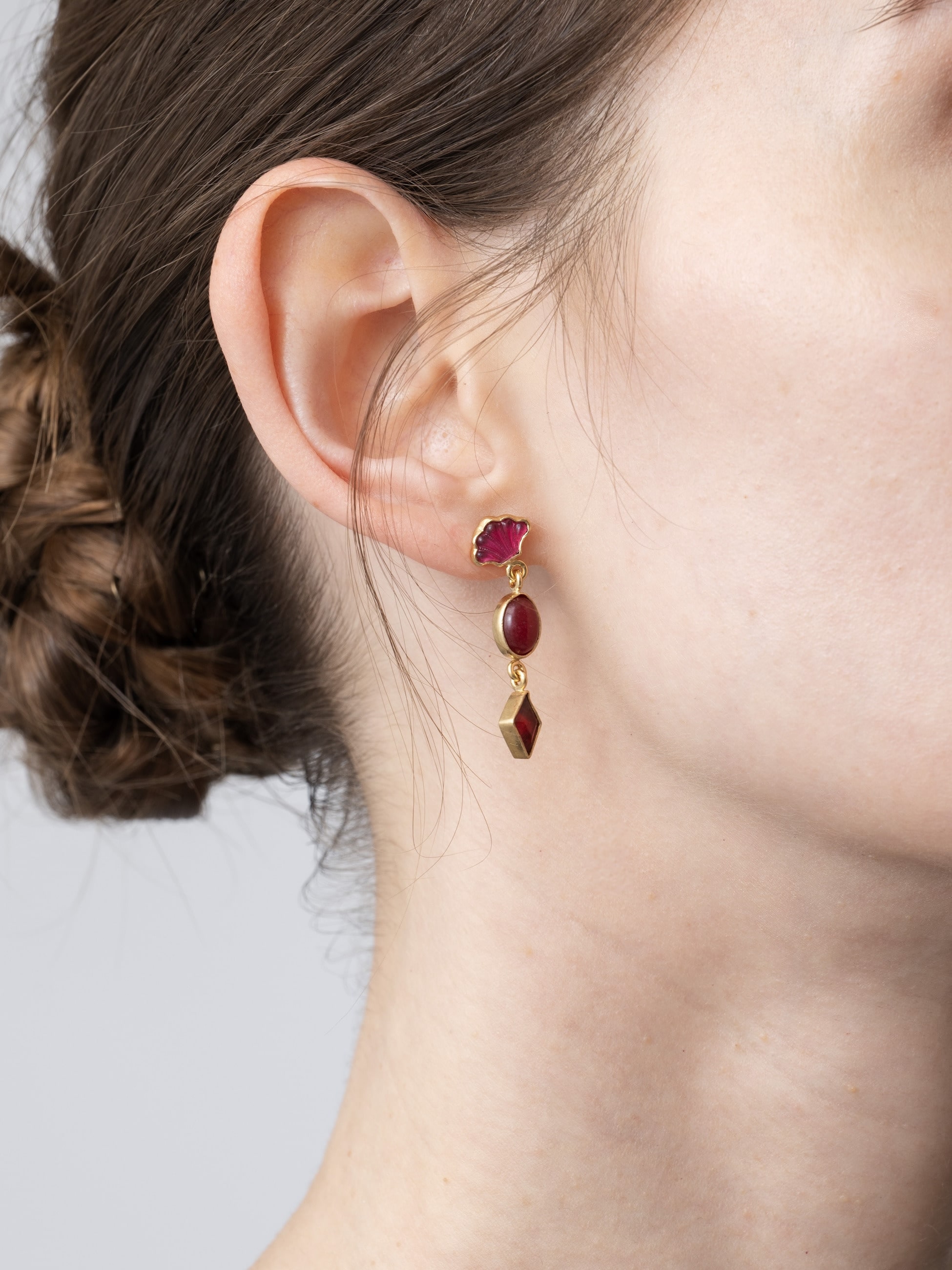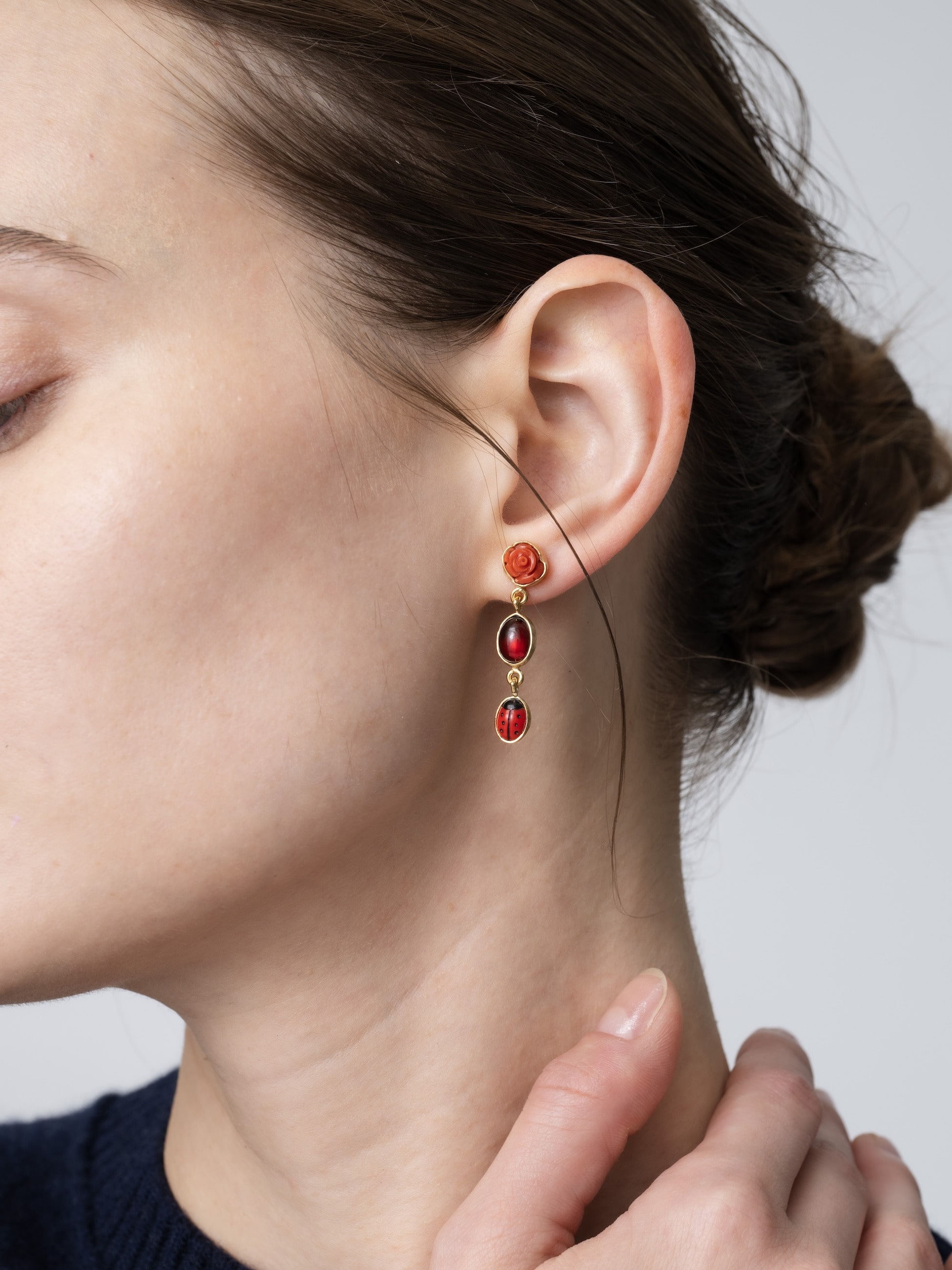 - 様々な愛らしいモチーフが並んだアシンメトリーのピアスは、程よいボリューム感で華やかさをプラスし、揺れ動くたび可憐な雰囲気を醸し出します。印象的なカラーリングで、コーディネートのアクセントとしても活躍します。