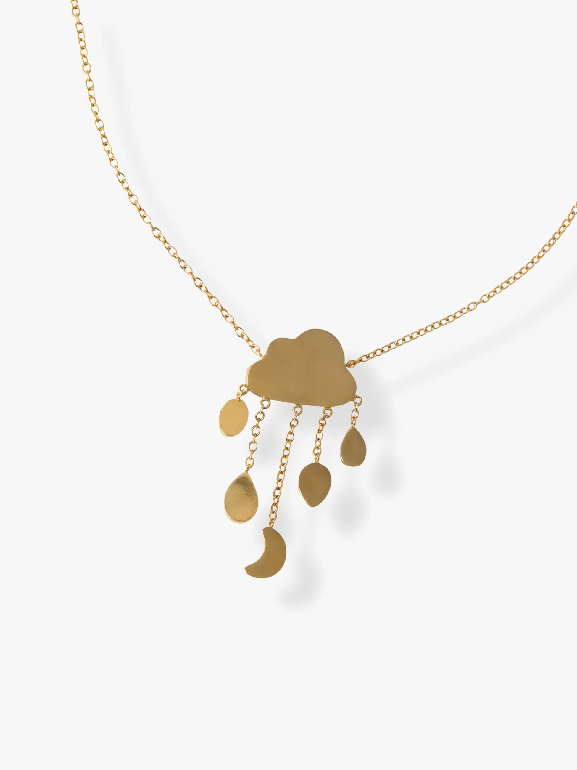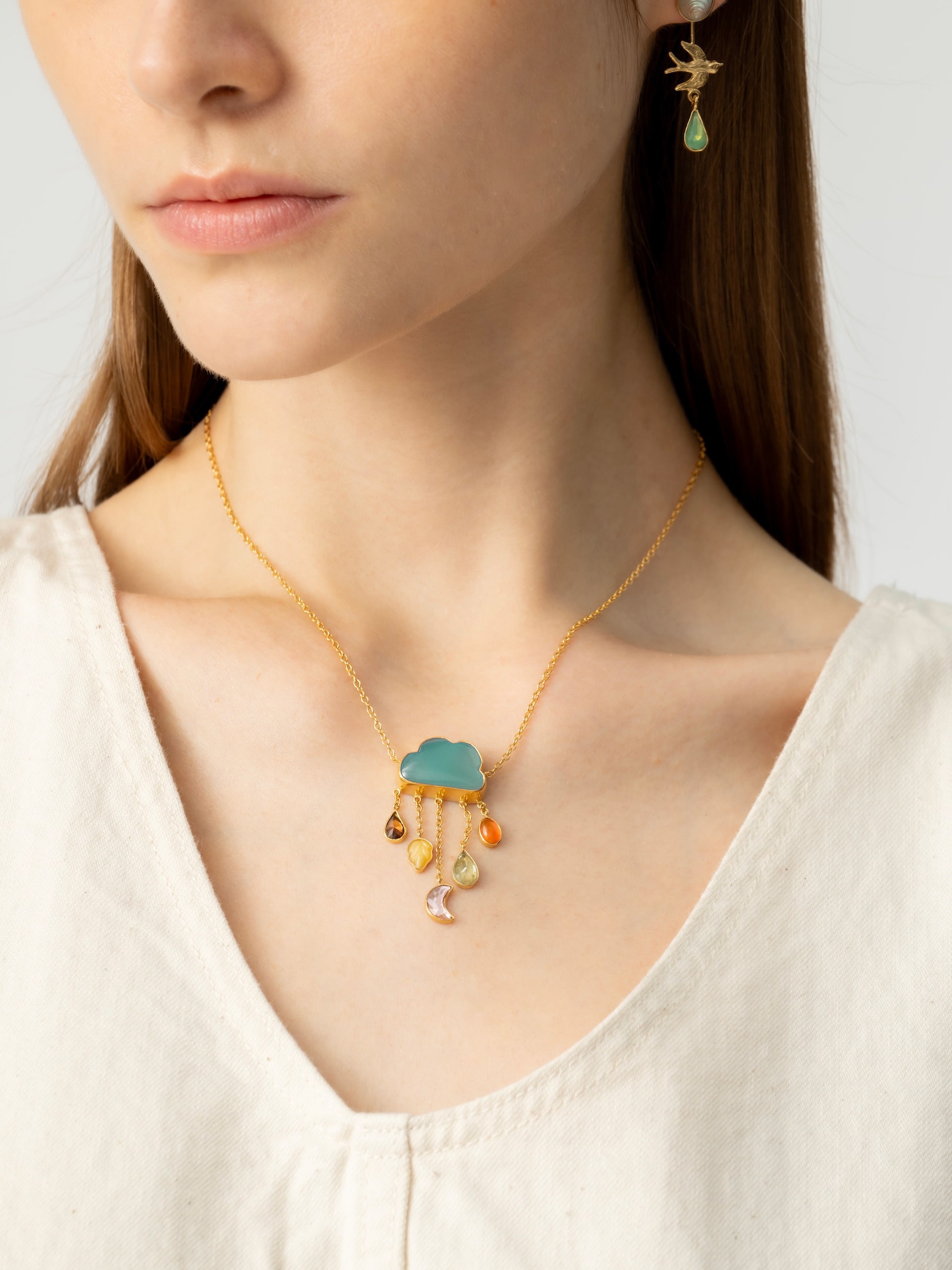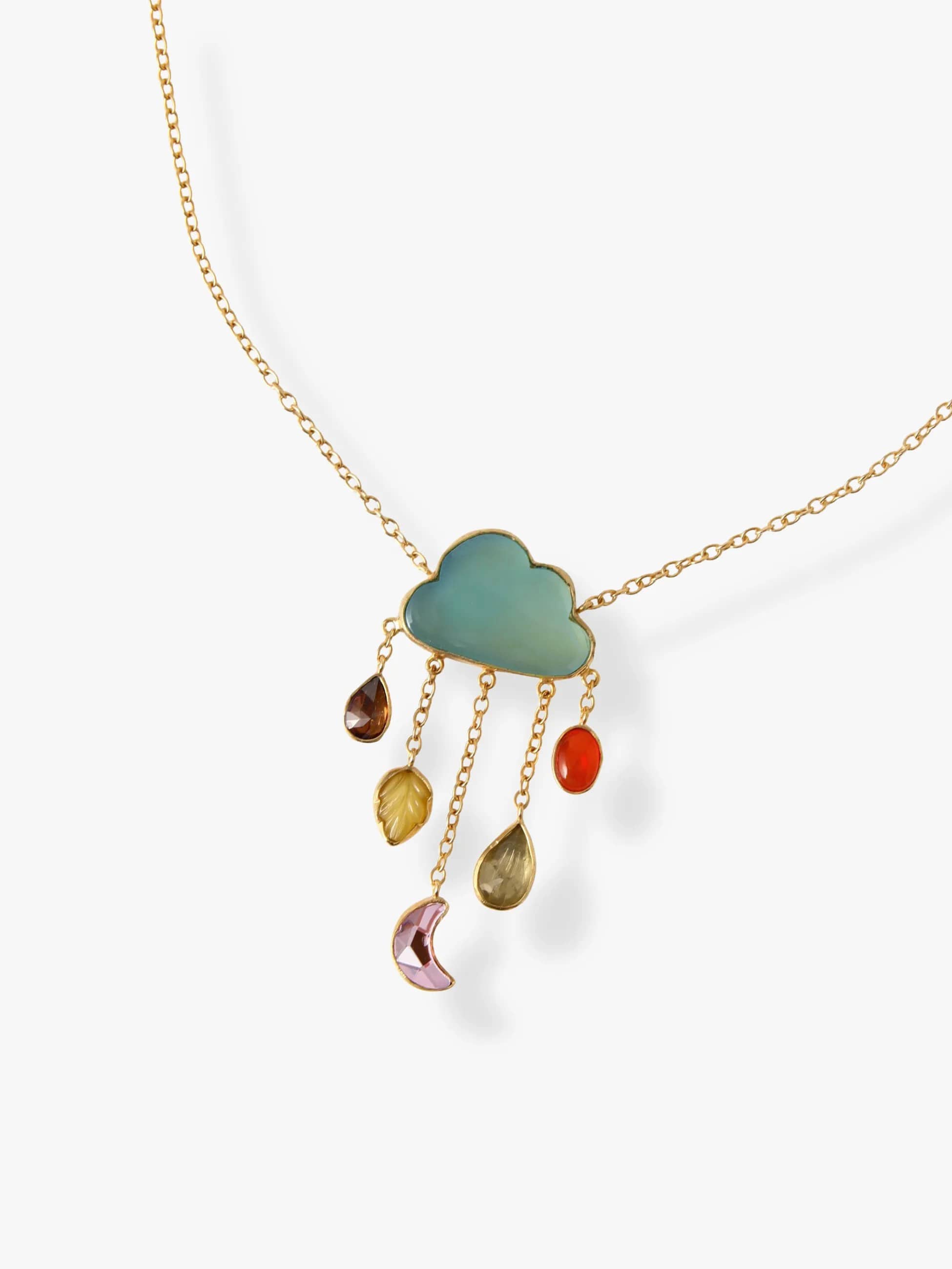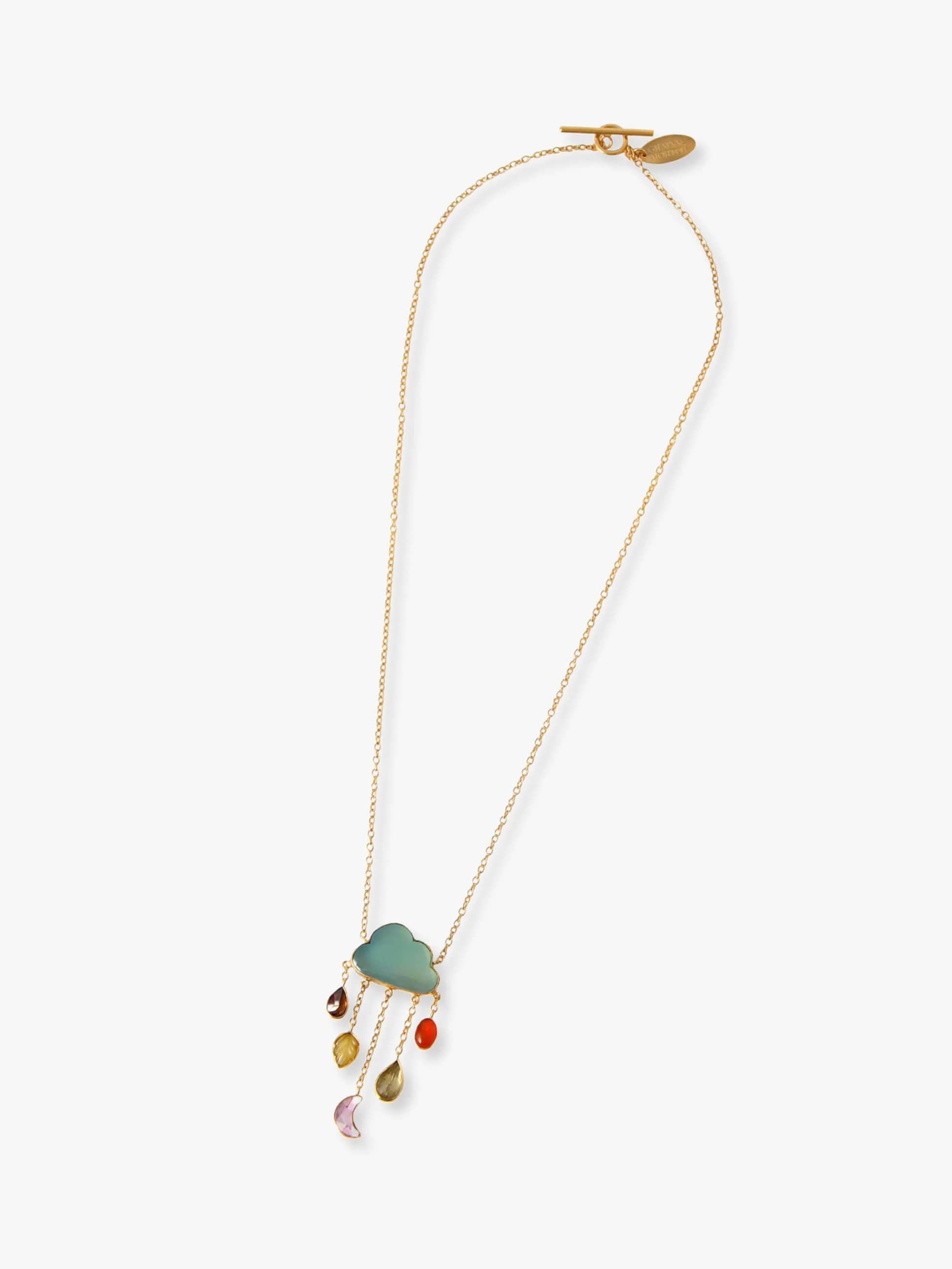 - ブルーカルセドニーの穏やかな色味が魅力的なネックレスは、カラフルでドリーミーな雲のモチーフに、レインドロップが軽やかに揺れるアイコニックなデザインが何とも愛らしい仕上がりに。スウェットなどのカジュアルスタイルからドレスアップまでカバーし、装いに華やかさと遊び心を添えます。
