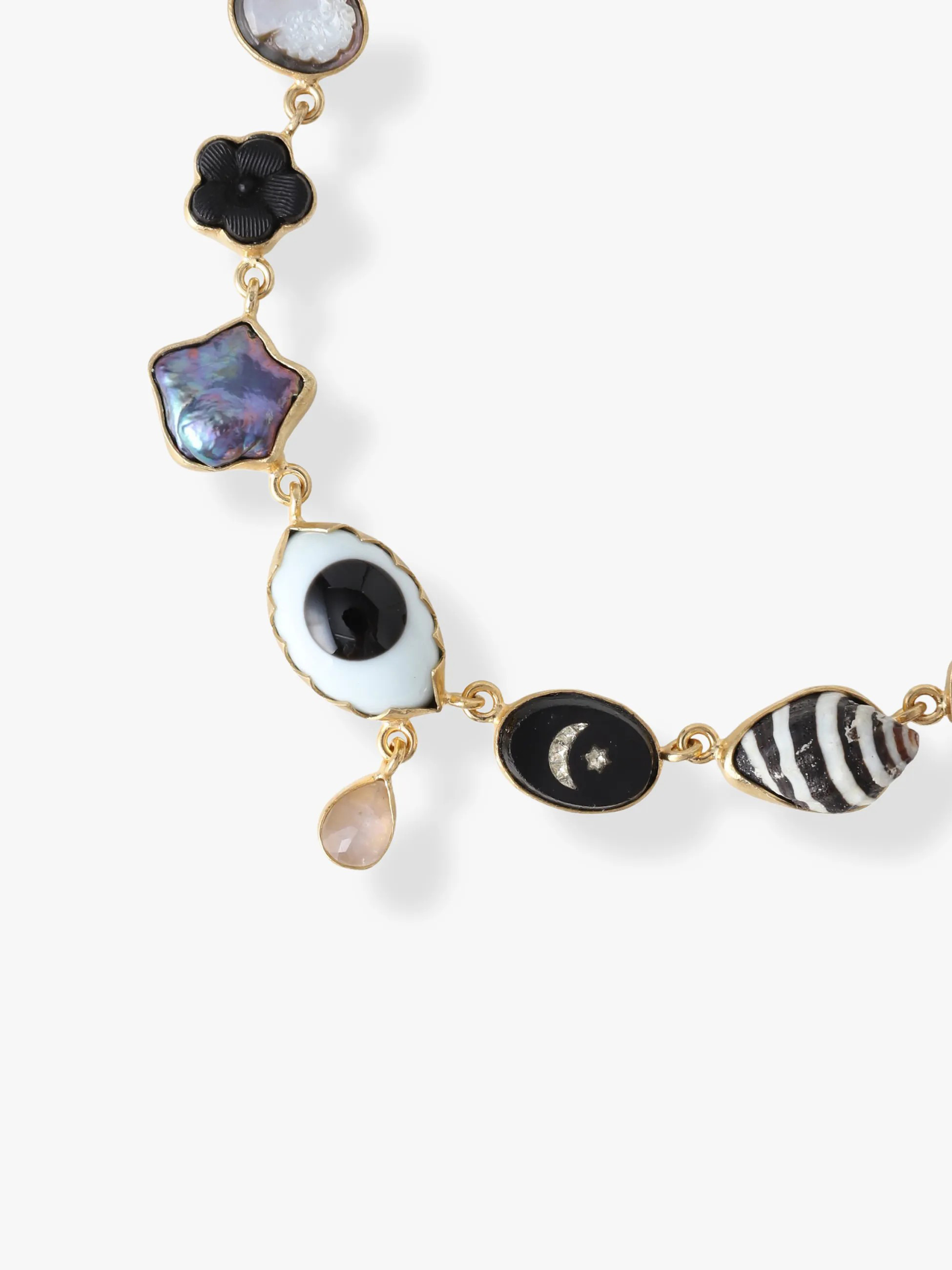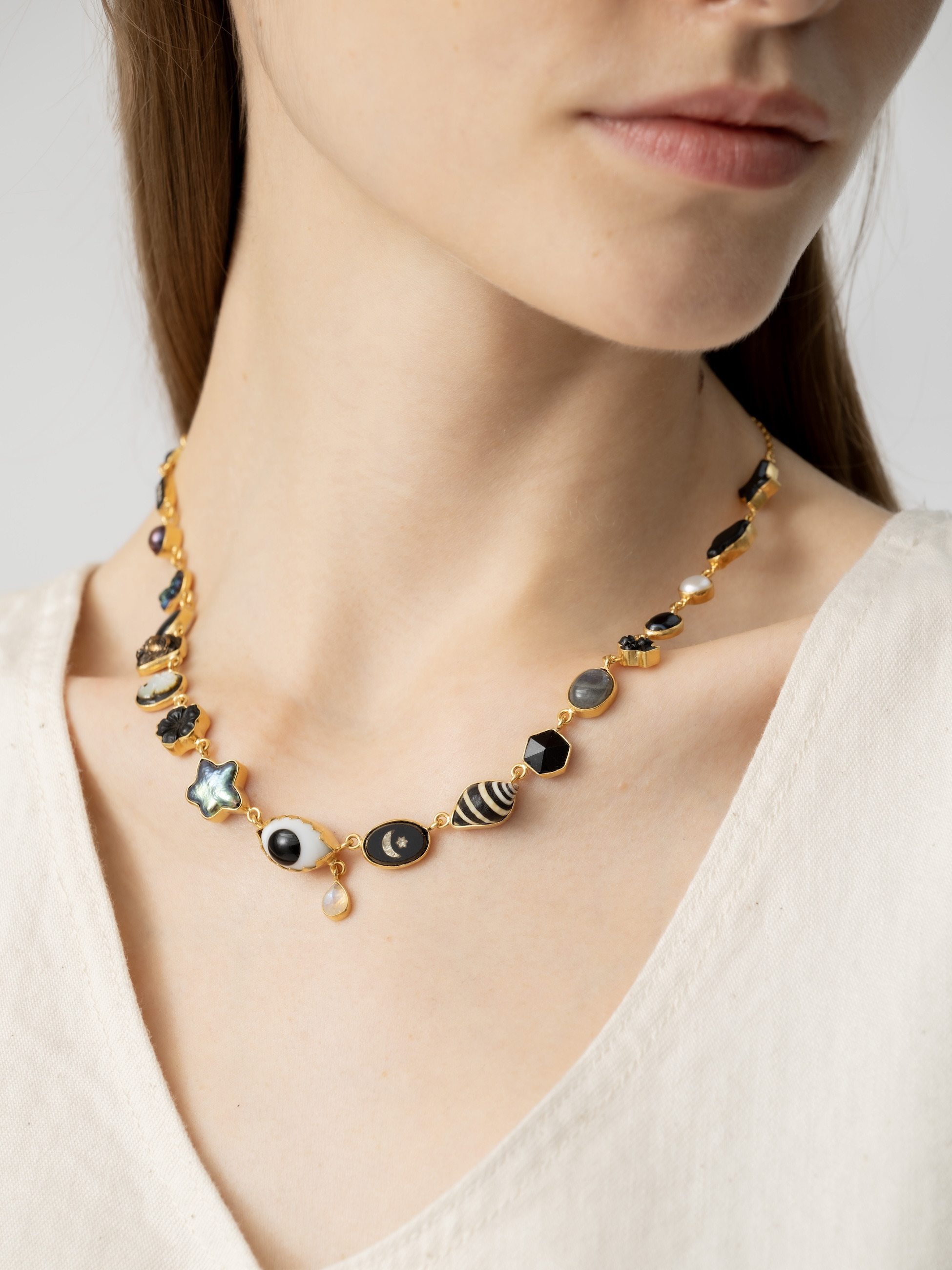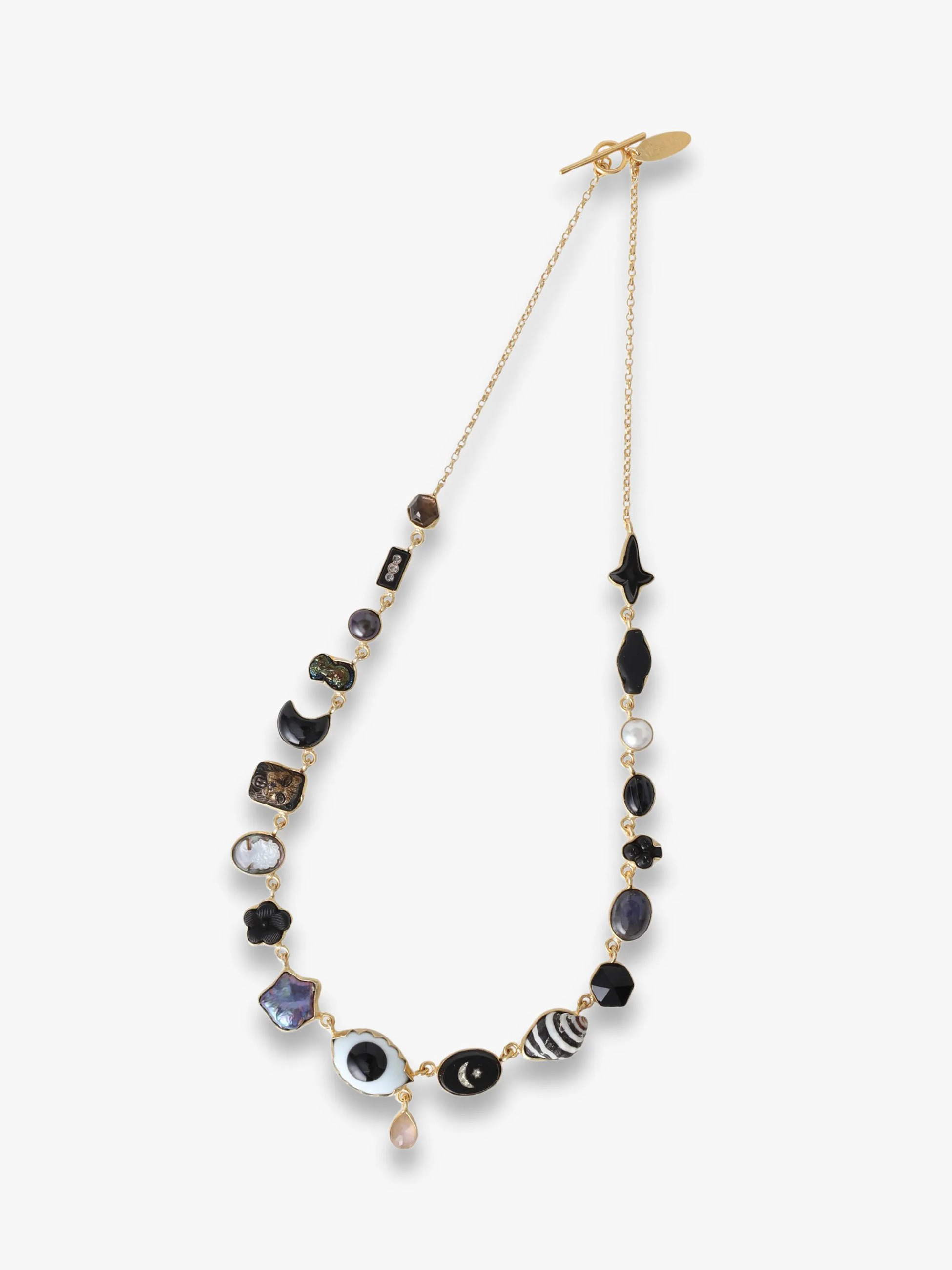- ブラックトーンの様々なモチーフがあしらわれたネックレスは、GRAINNE MORTONらしい大胆で遊び心溢れるデザイン性をお楽しみいただけます。知性と真実を表す「すべてを見通す目」をセンターに、ラブラドライトがもたらすとされる強さや忍耐力を表現。シンプルなコーディネートの外し役としてもおすすめです。