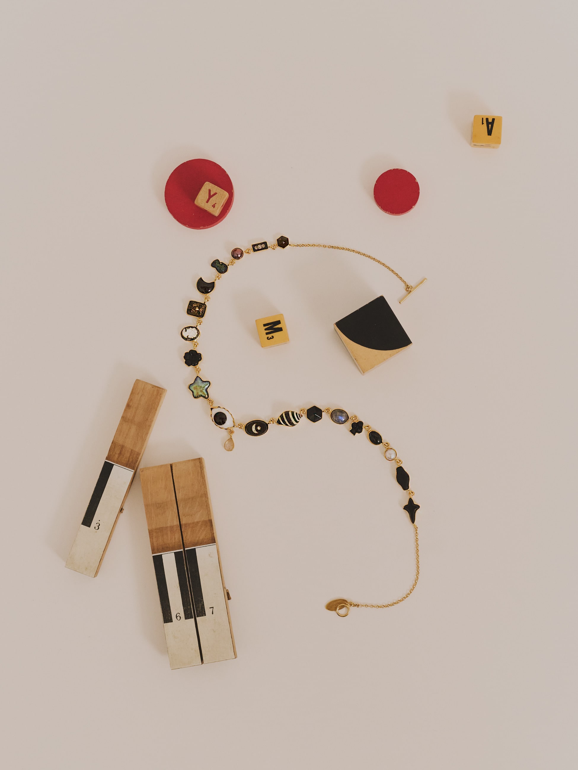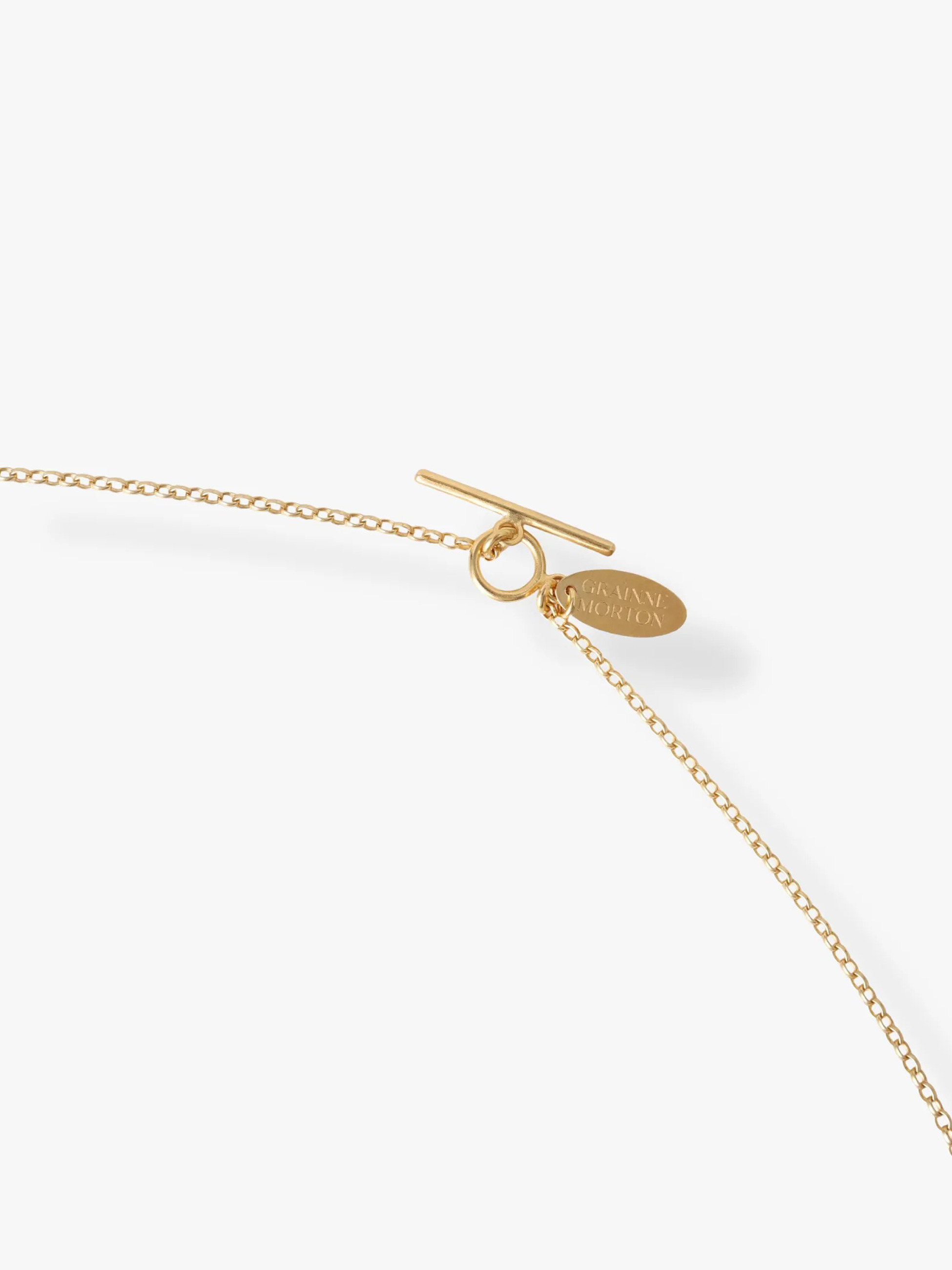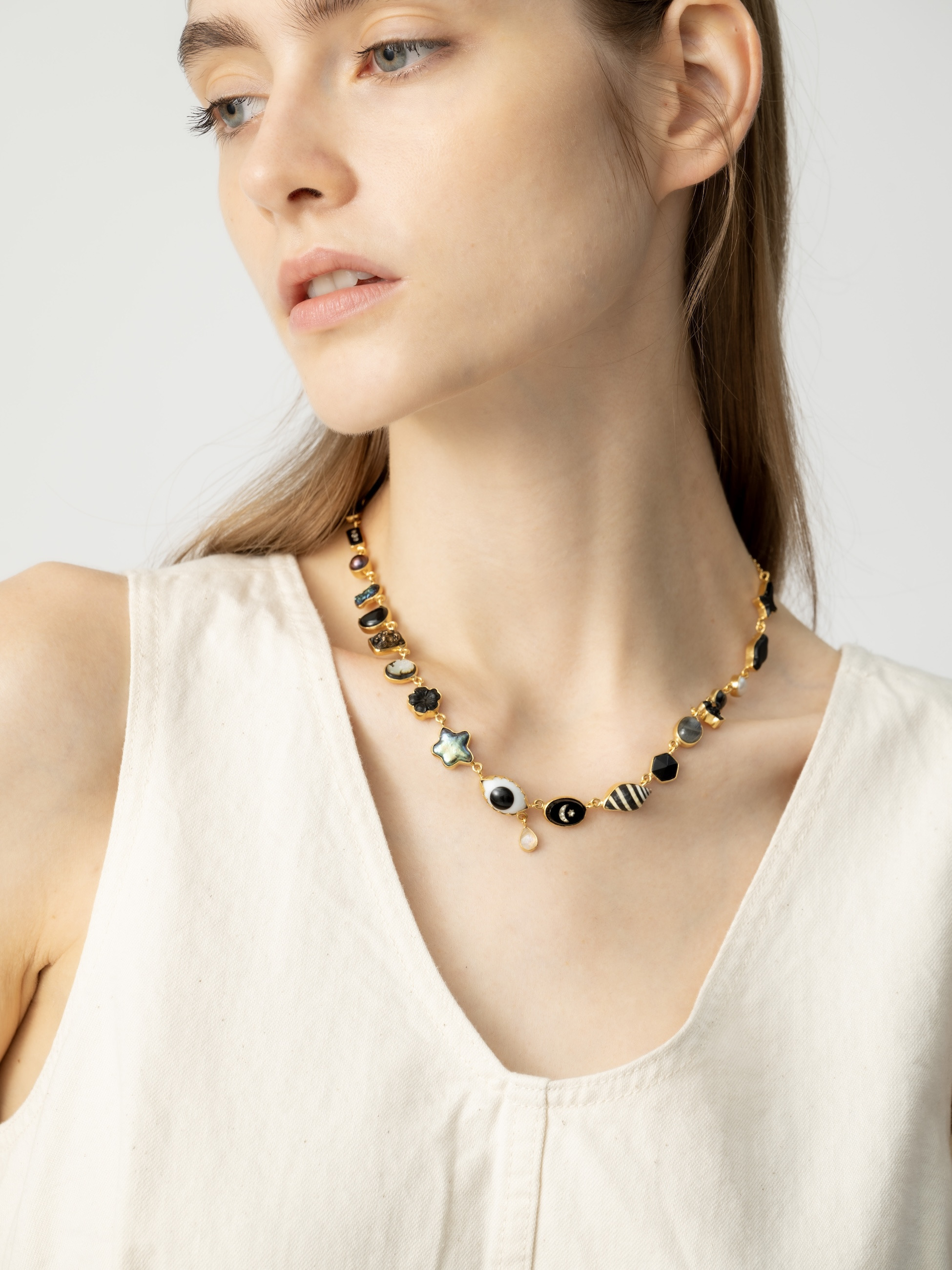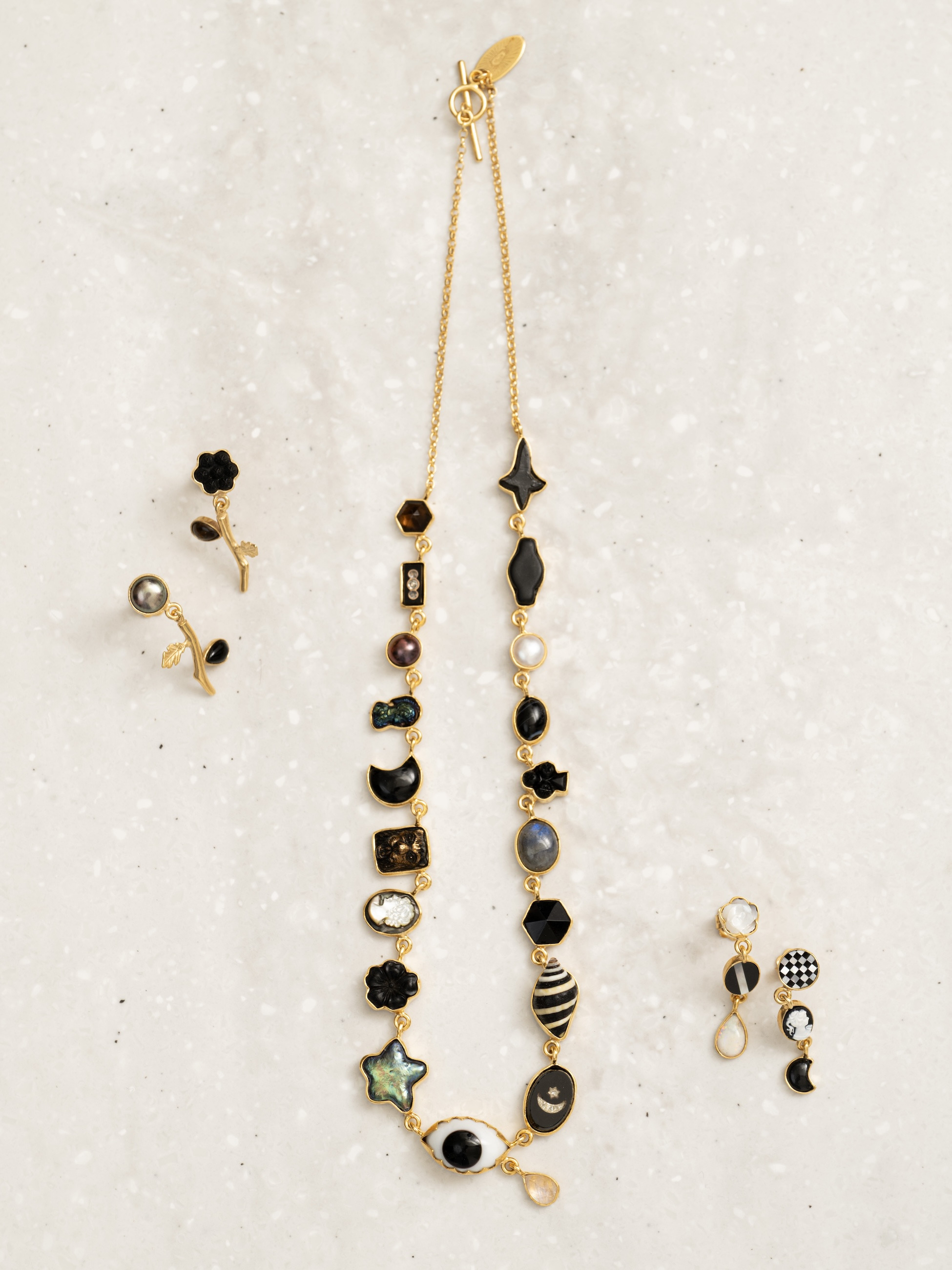 - ブラックトーンの様々なモチーフがあしらわれたネックレスは、GRAINNE MORTONらしい大胆で遊び心溢れるデザイン性をお楽しみいただけます。知性と真実を表す「すべてを見通す目」をセンターに、ラブラドライトがもたらすとされる強さや忍耐力を表現。シンプルなコーディネートの外し役としてもおすすめです。