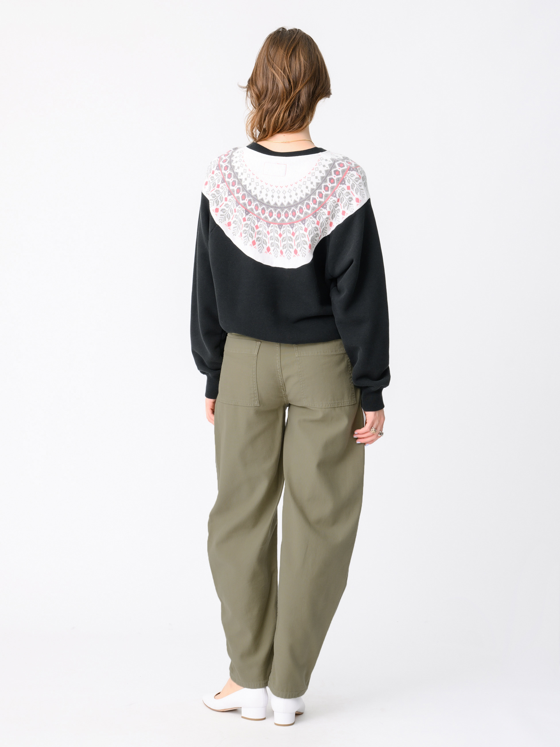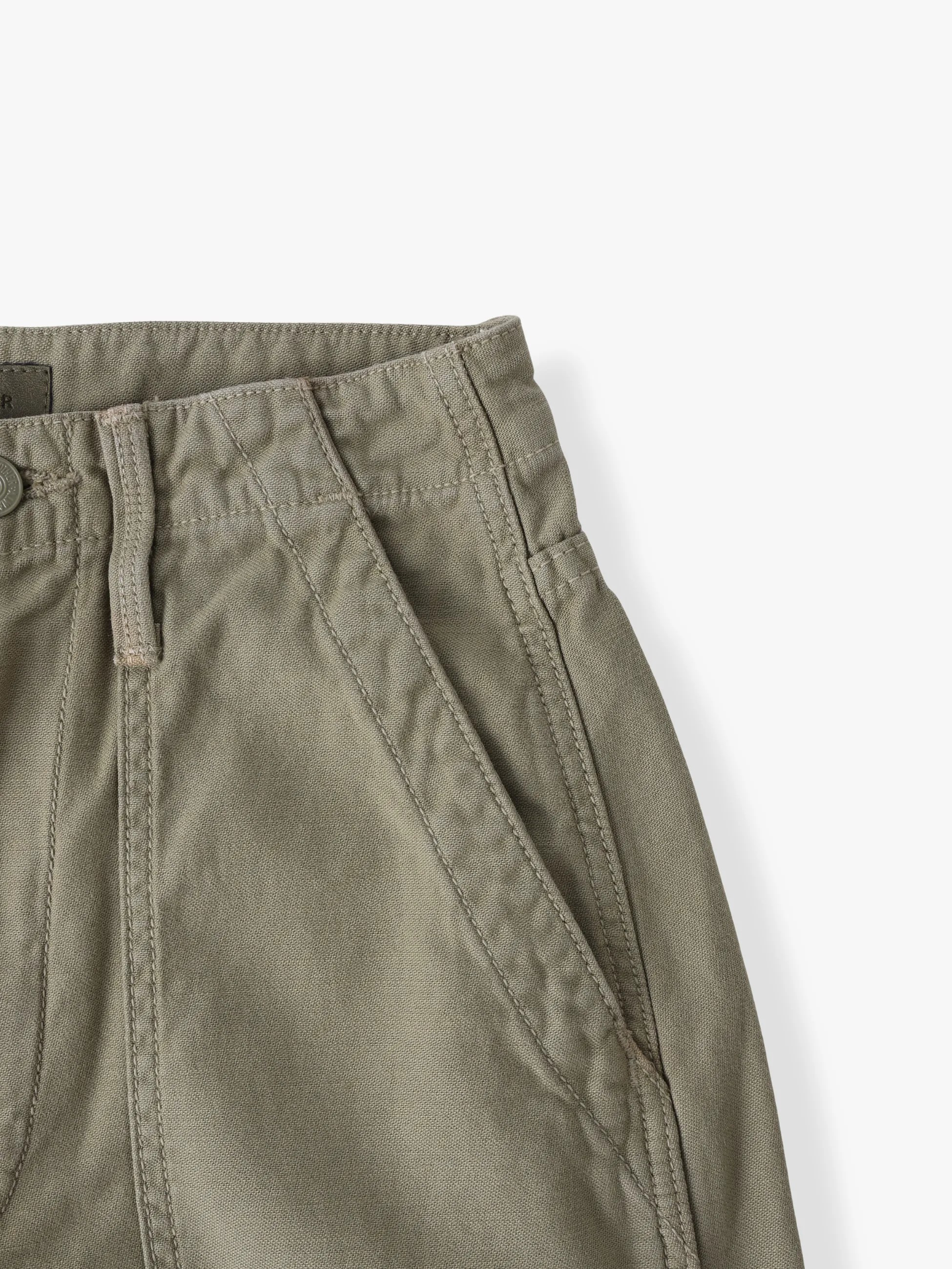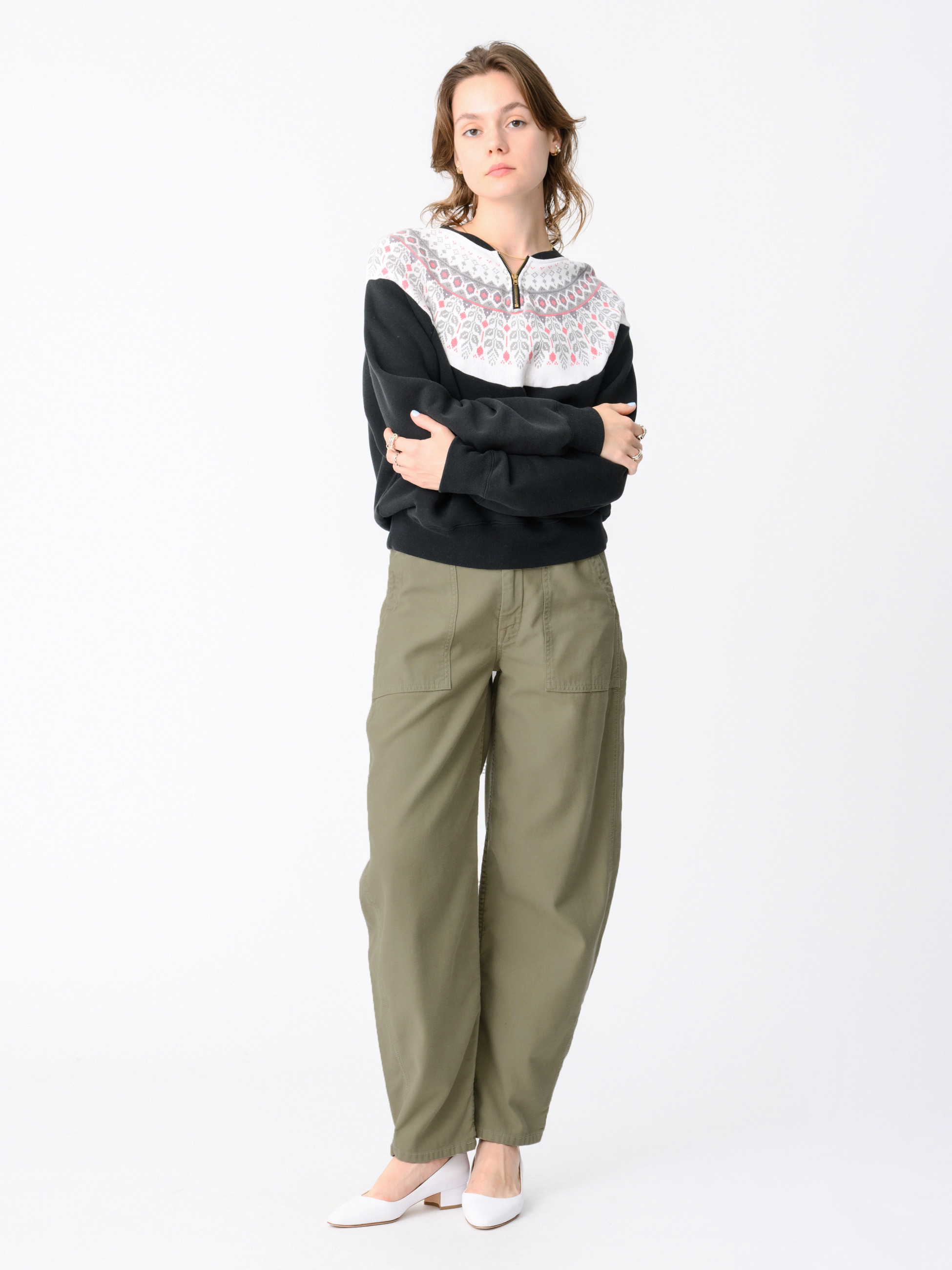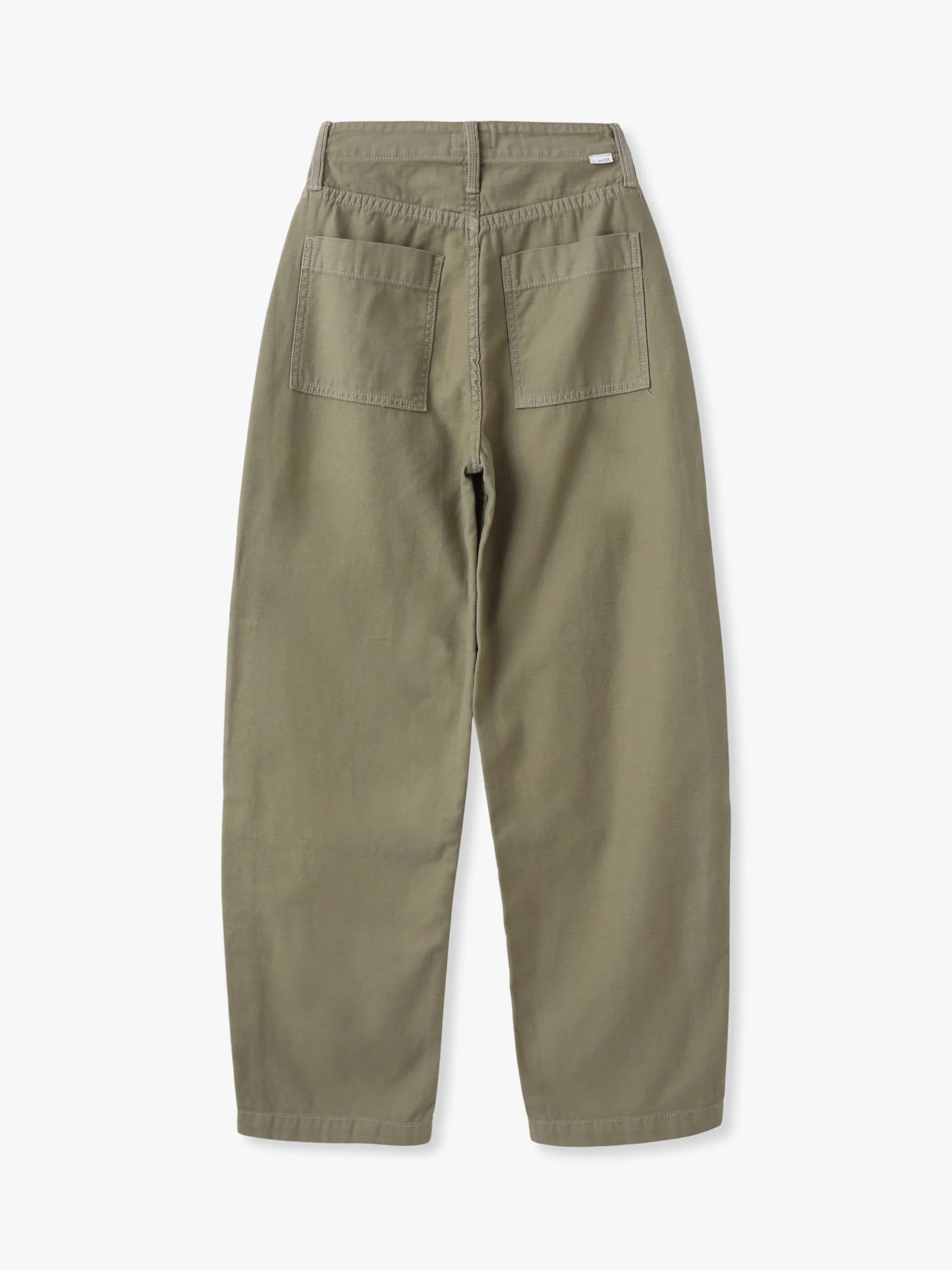 - ワイドなバレルレッグのハイウエストパンツは、大きめサイズのパッチポケットに、ラフな穿き心地が特徴です。コットンを100%使用したしっかりと厚みのある生地感で、カジュアルなトップスを合わせ、ミリタリーパンツのようにメンズライクにも決まる1本です。