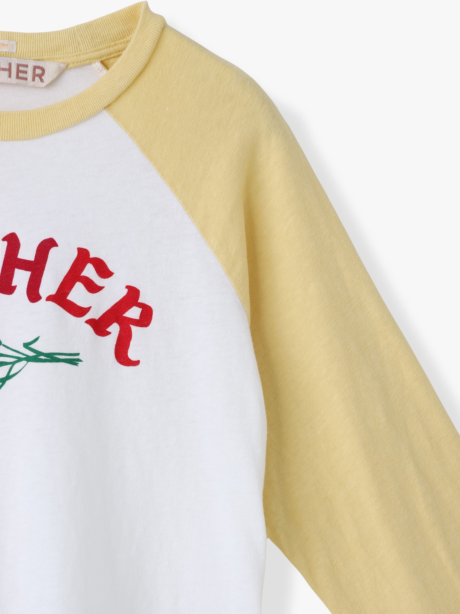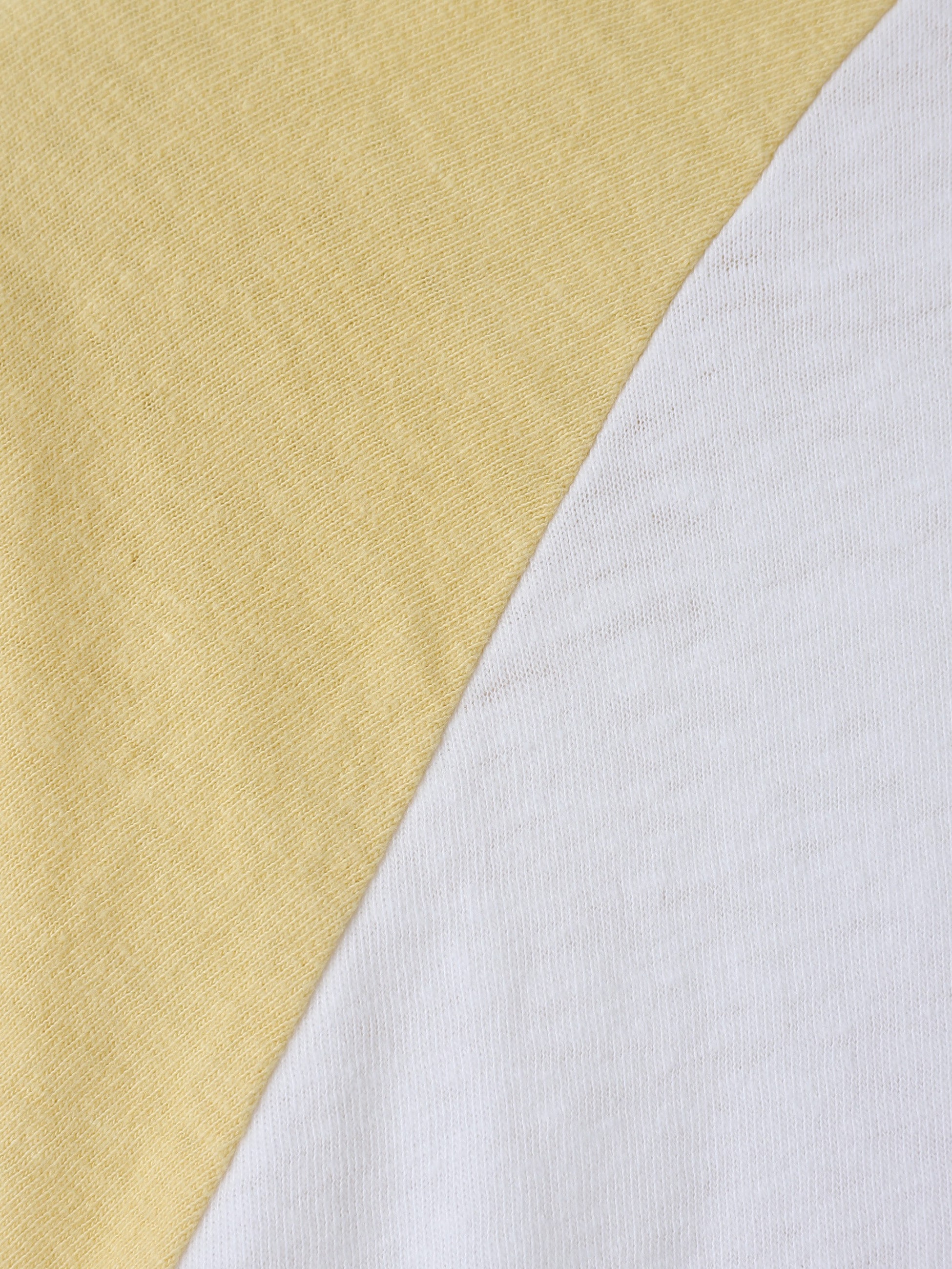 ヴィンテージ感のあるTシャツは、ゆったりとしたサイズ感でリラックスして着用できます。袖にあしらわれたパステルイエローと、フロントのレッドのロゴプリントがコントラストを生み、シンプルながらも存在感のあるデザインに仕上げています。
