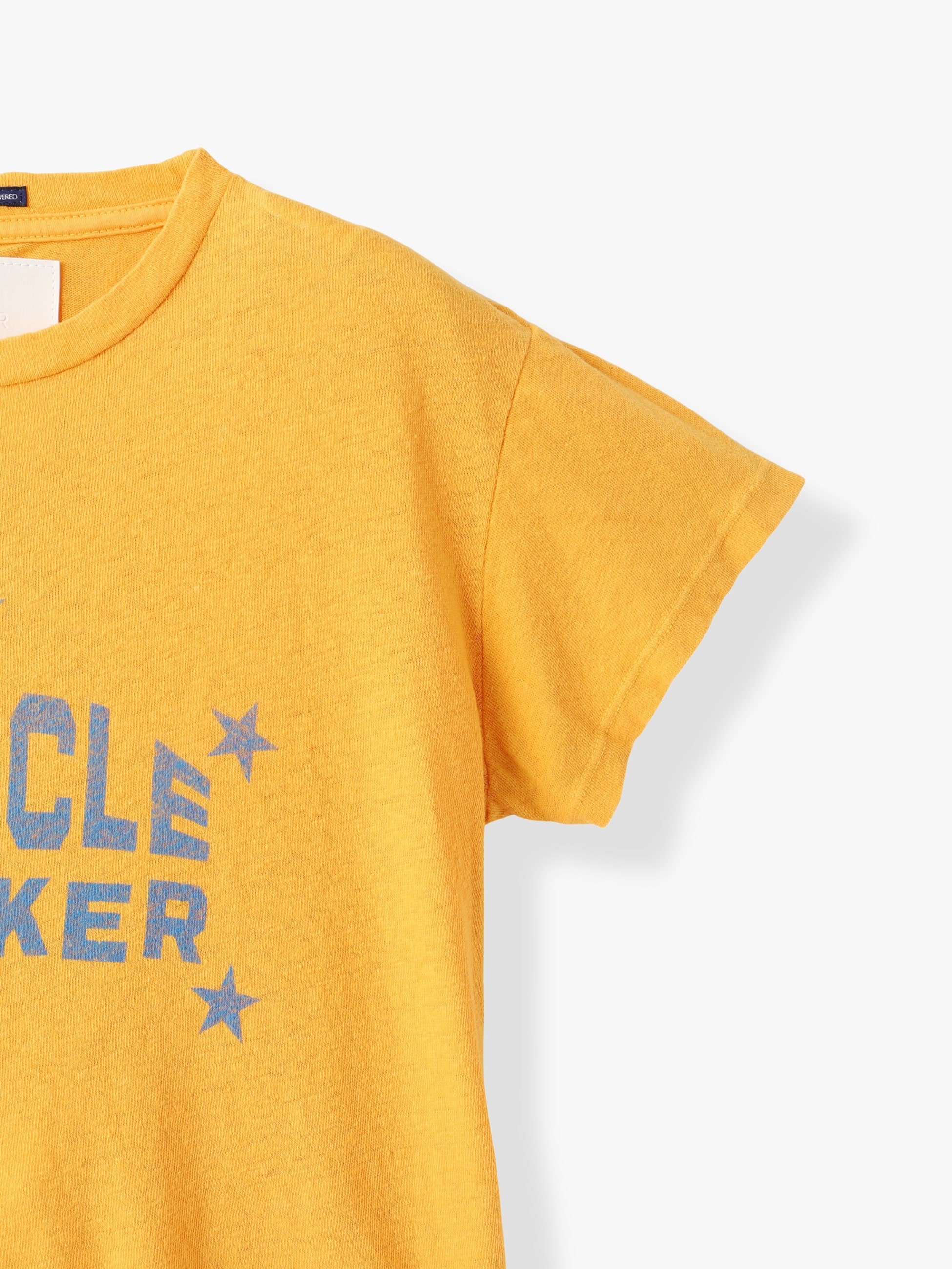 - 上質なコットンとリネンの混紡素材を使用したTシャツは、薄手の生地感と程よくスリムなシルエットが、ヴィンテージ感のあるルックスと風合いを醸します。ゴールデンイエローのボディにフェードブルーのテキストグラフィックが映え、リラクシーな春夏シーズンのスタイリングを演出します。