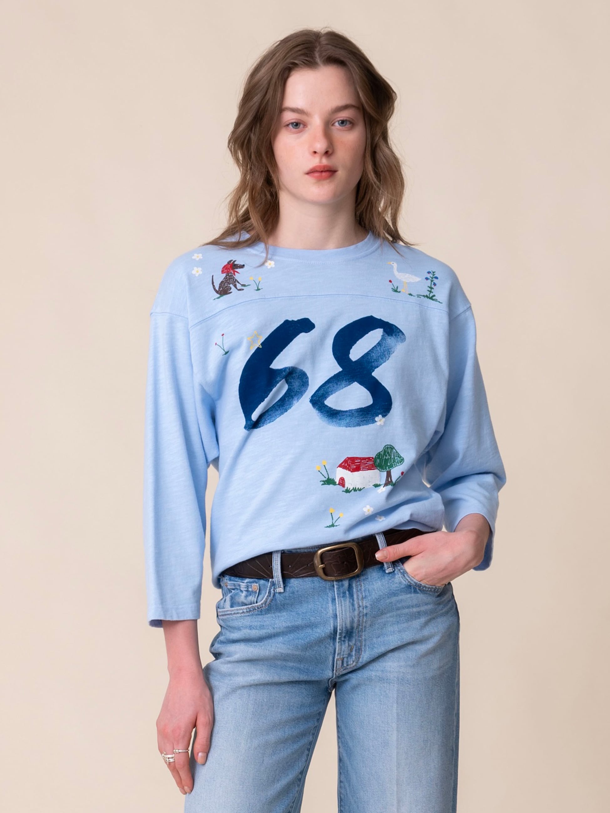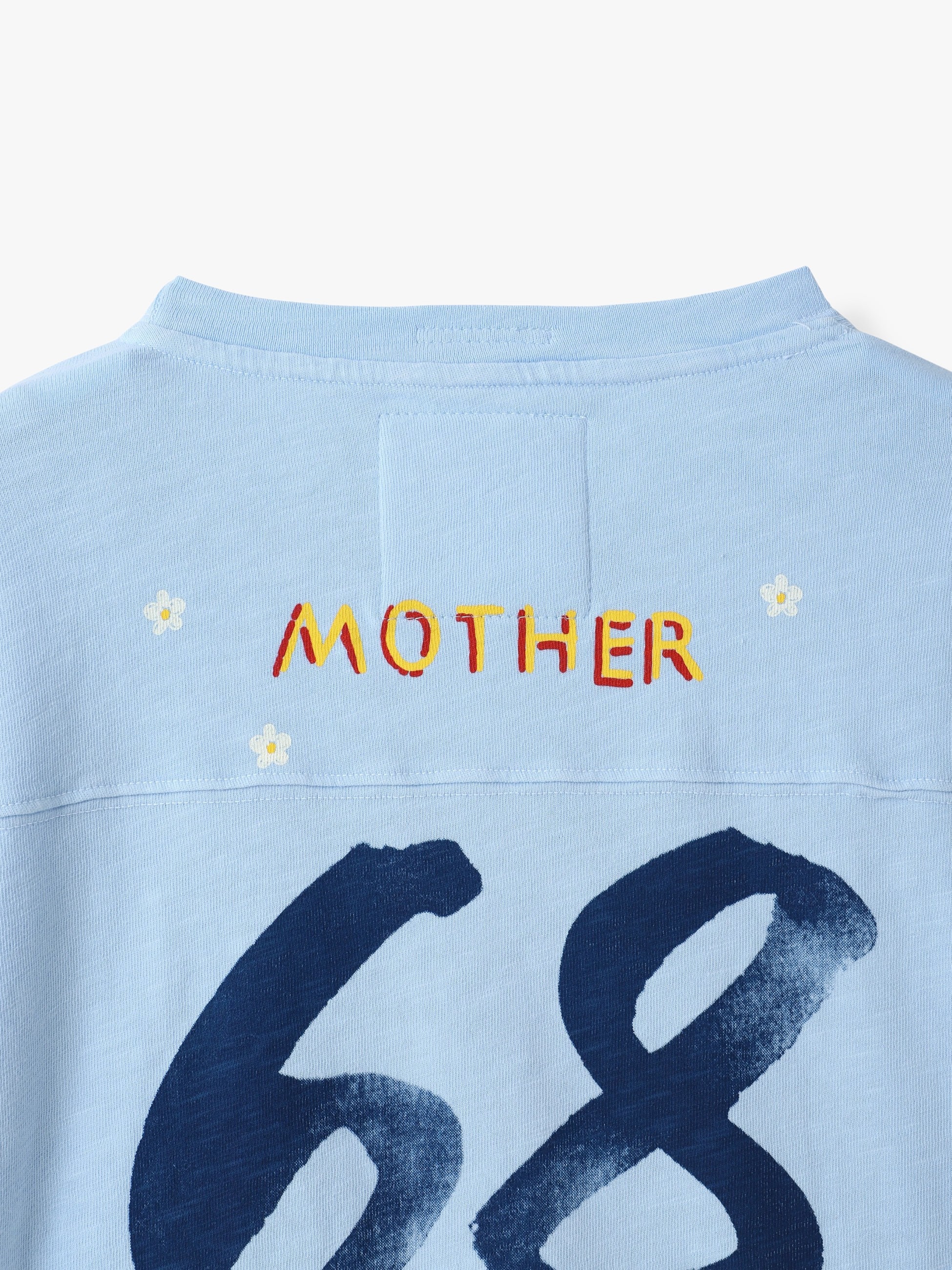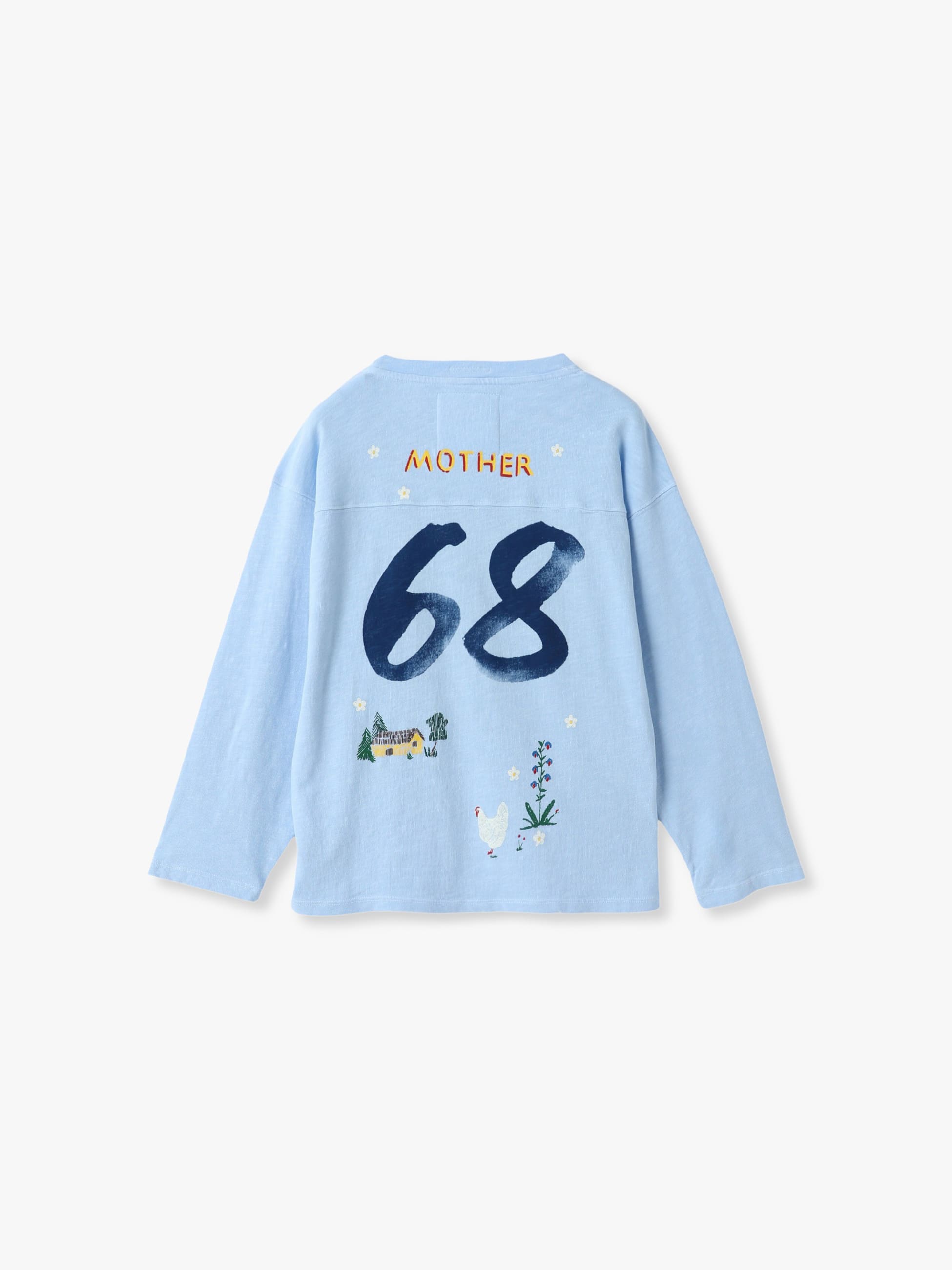 オーバーサイズのクルーネックTシャツは、フットボールのジャージにインスパイアされたドロップショルダー、七分袖、ボックスフィットが特徴です。上質なスカイブルーのコットン素材を使用し、前面と背面には"68"の数字とカラフルな手描きプリントがあしらわれています。