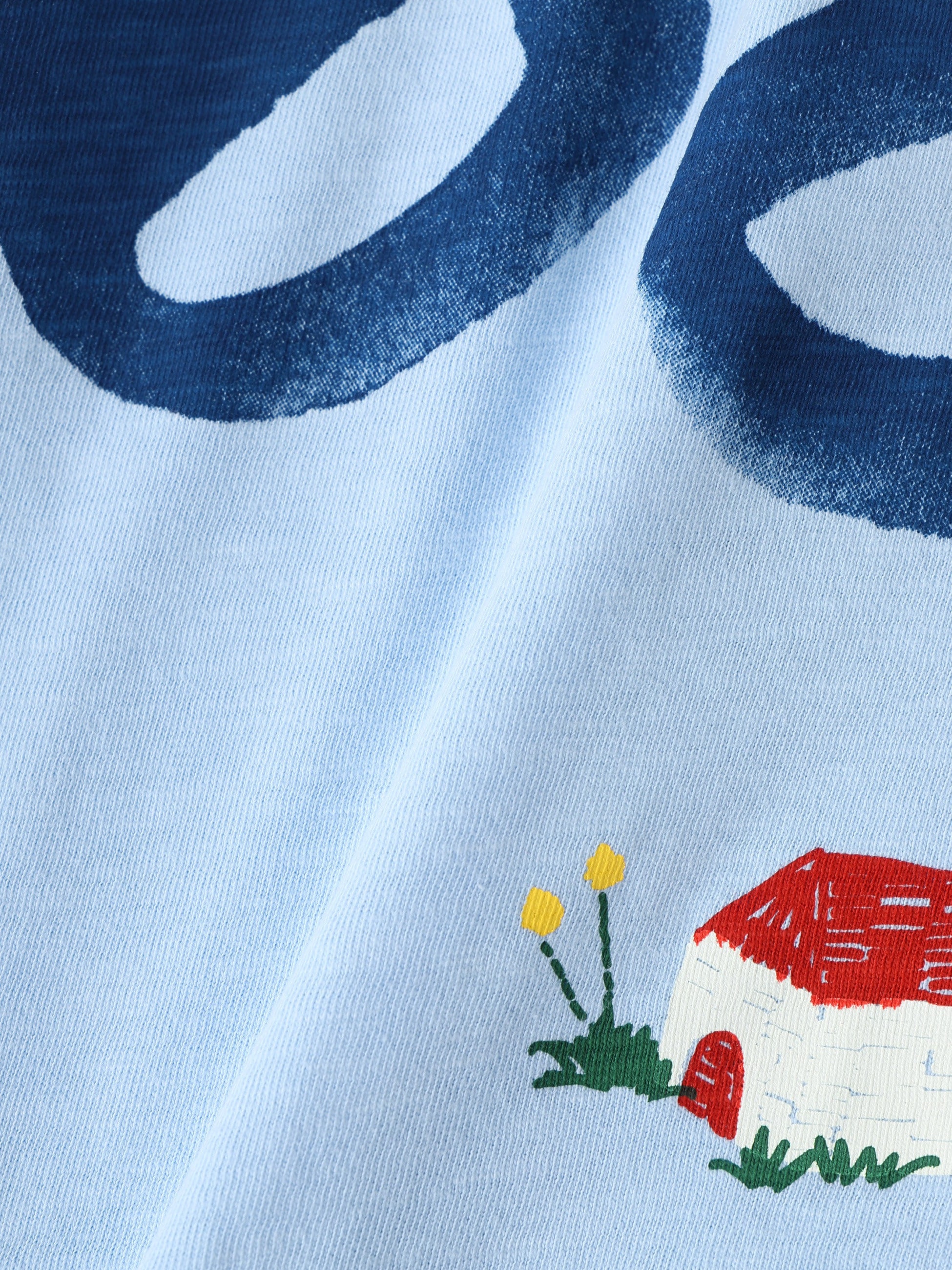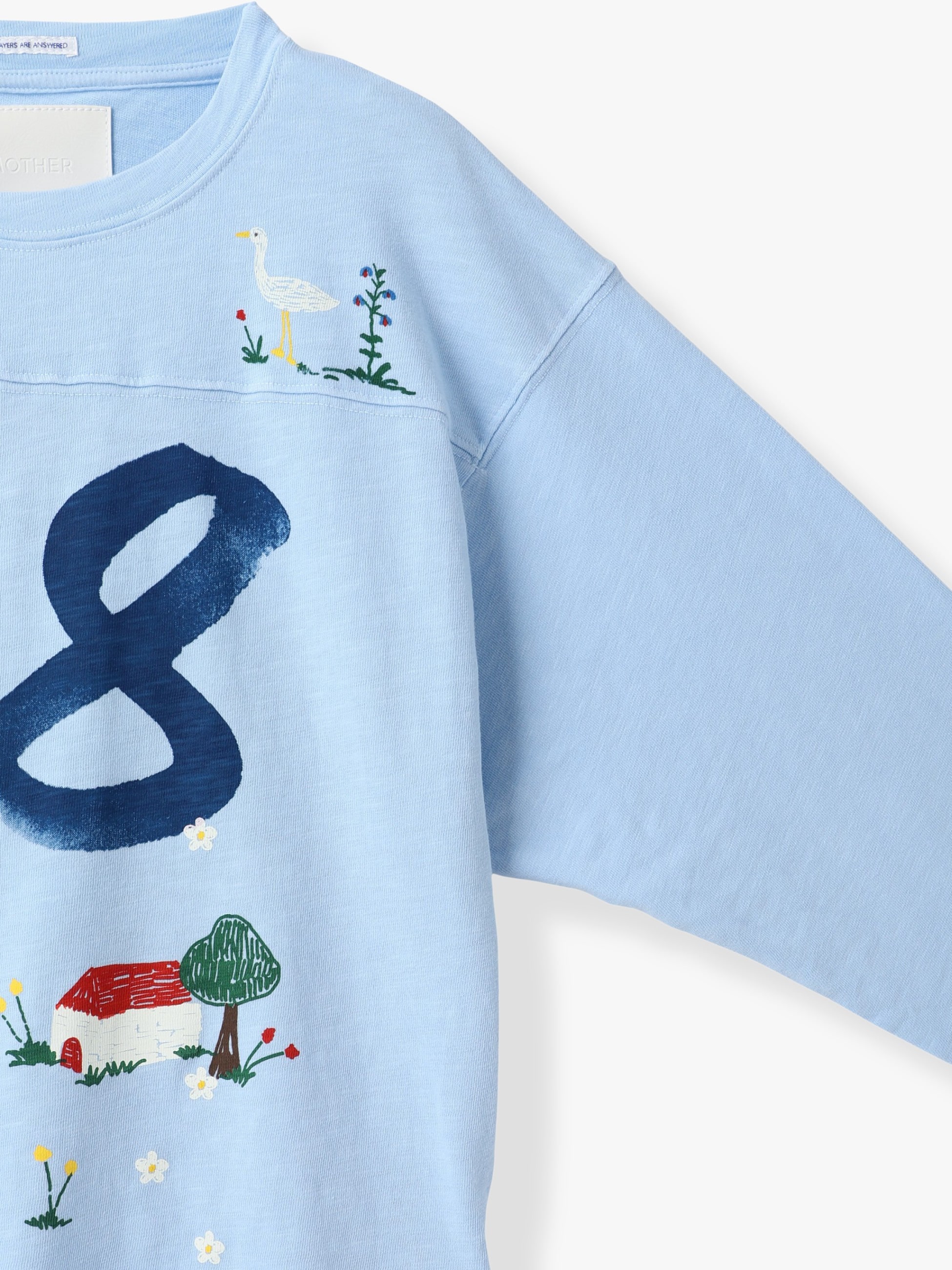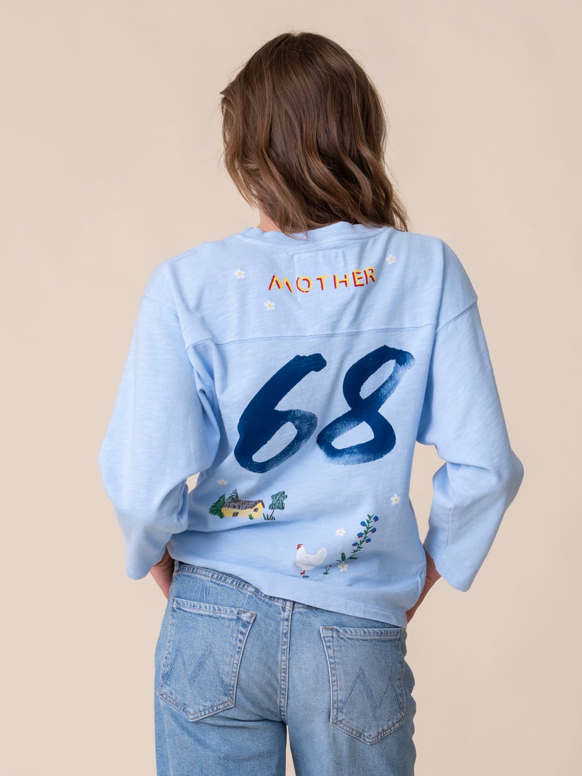 オーバーサイズのクルーネックTシャツは、フットボールのジャージにインスパイアされたドロップショルダー、七分袖、ボックスフィットが特徴です。上質なスカイブルーのコットン素材を使用し、前面と背面には"68"の数字とカラフルな手描きプリントがあしらわれています。