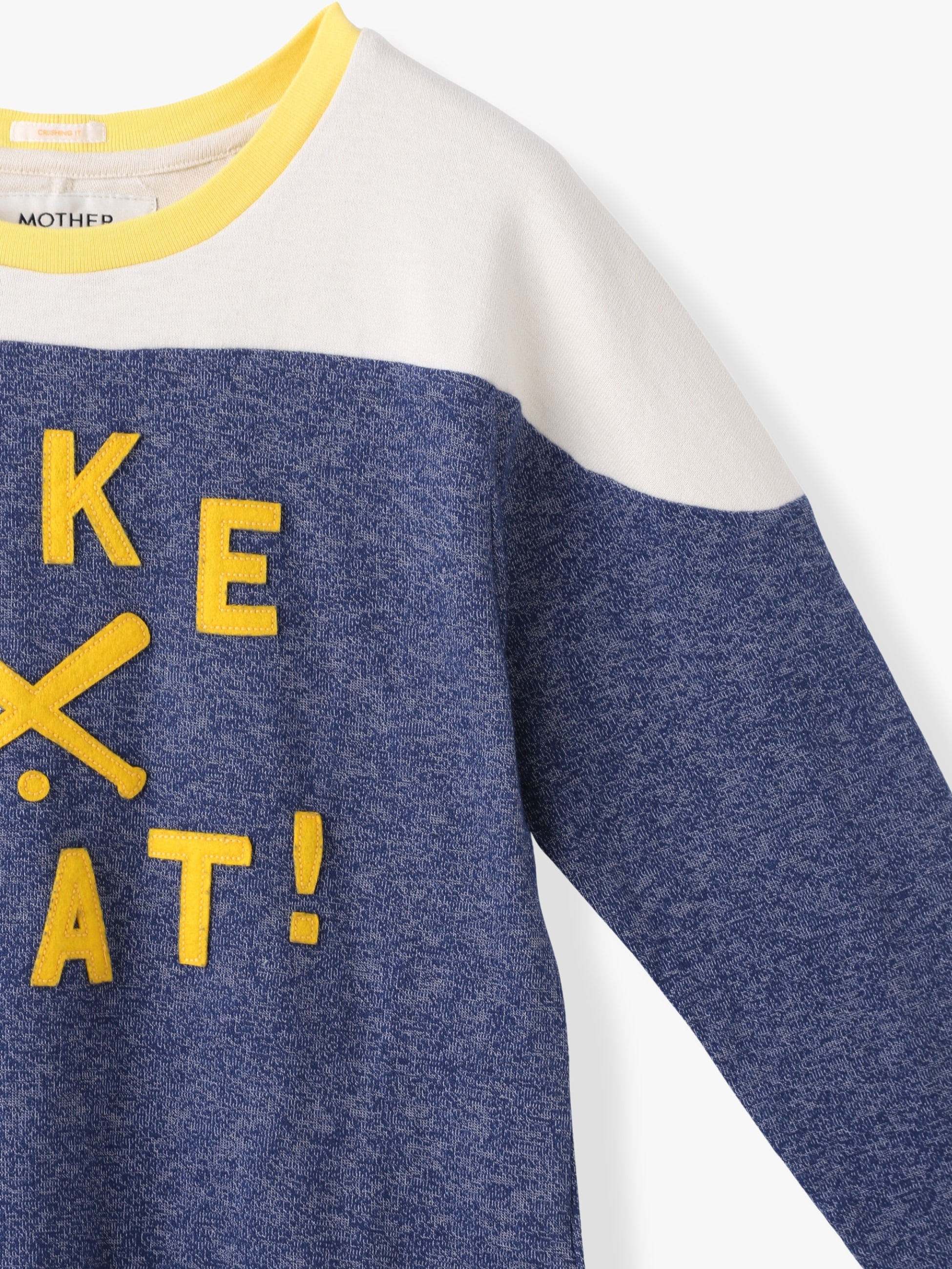 - ボックスフィットのクルーネックTシャツは、コットン混紡素材を使用したマーブルネイビーのカラーリングにオフホワイトのパネルとイエローのトリムが映え、フロントとバックにはイエローカラーのフェルトパッチが施されています。カジュアルな遊び心を感じられる、MOTHERらしいアイテムです。