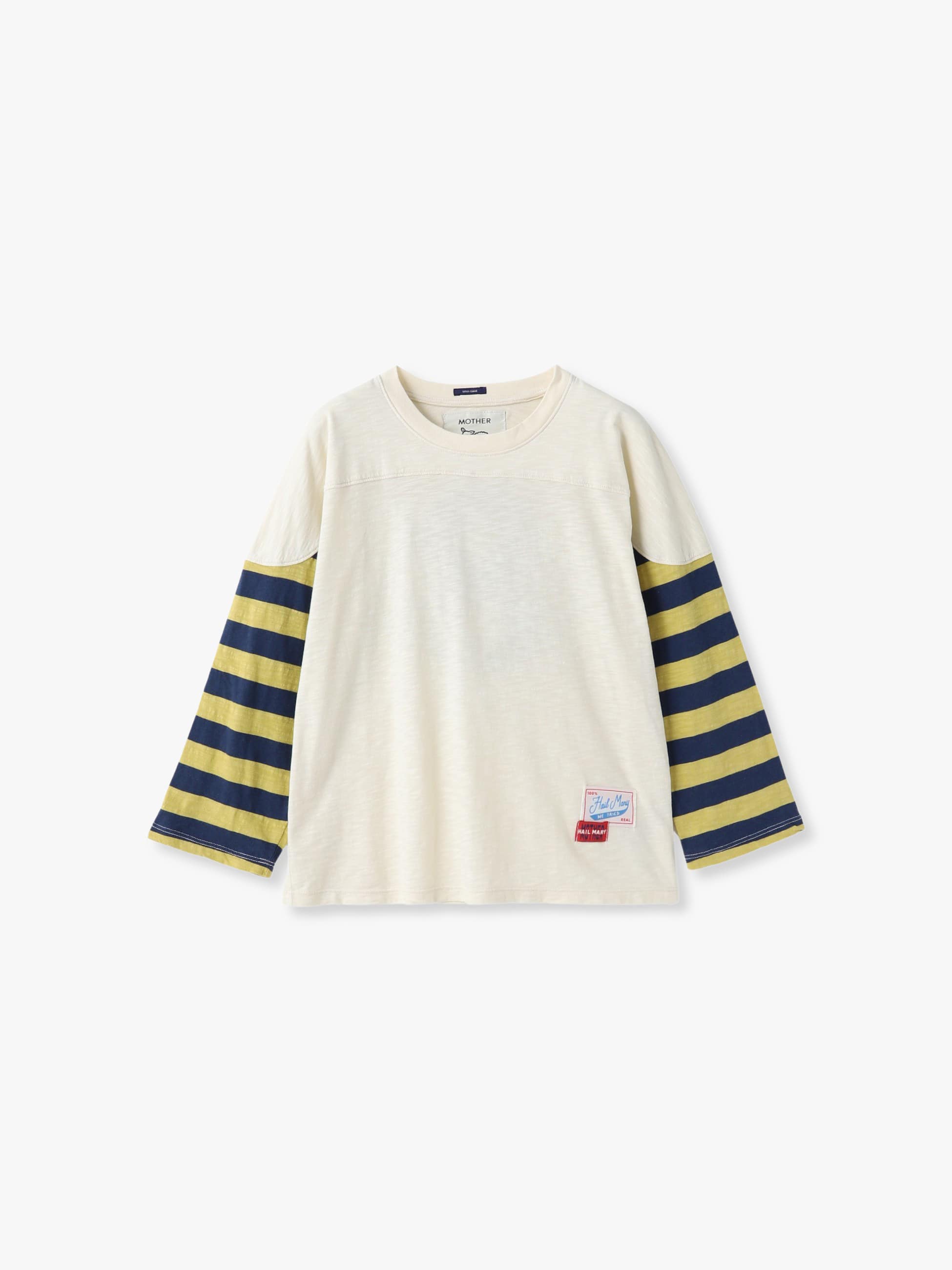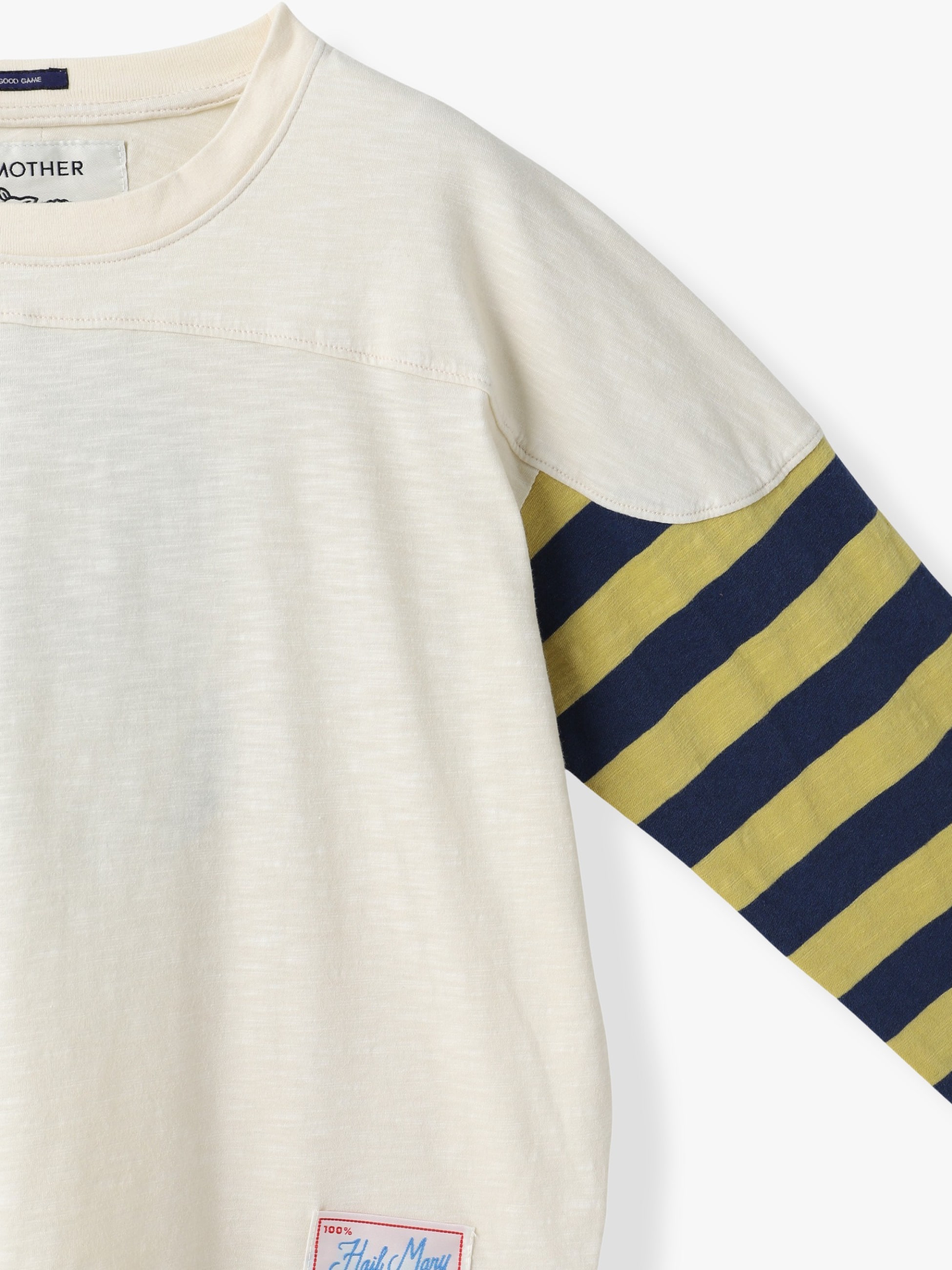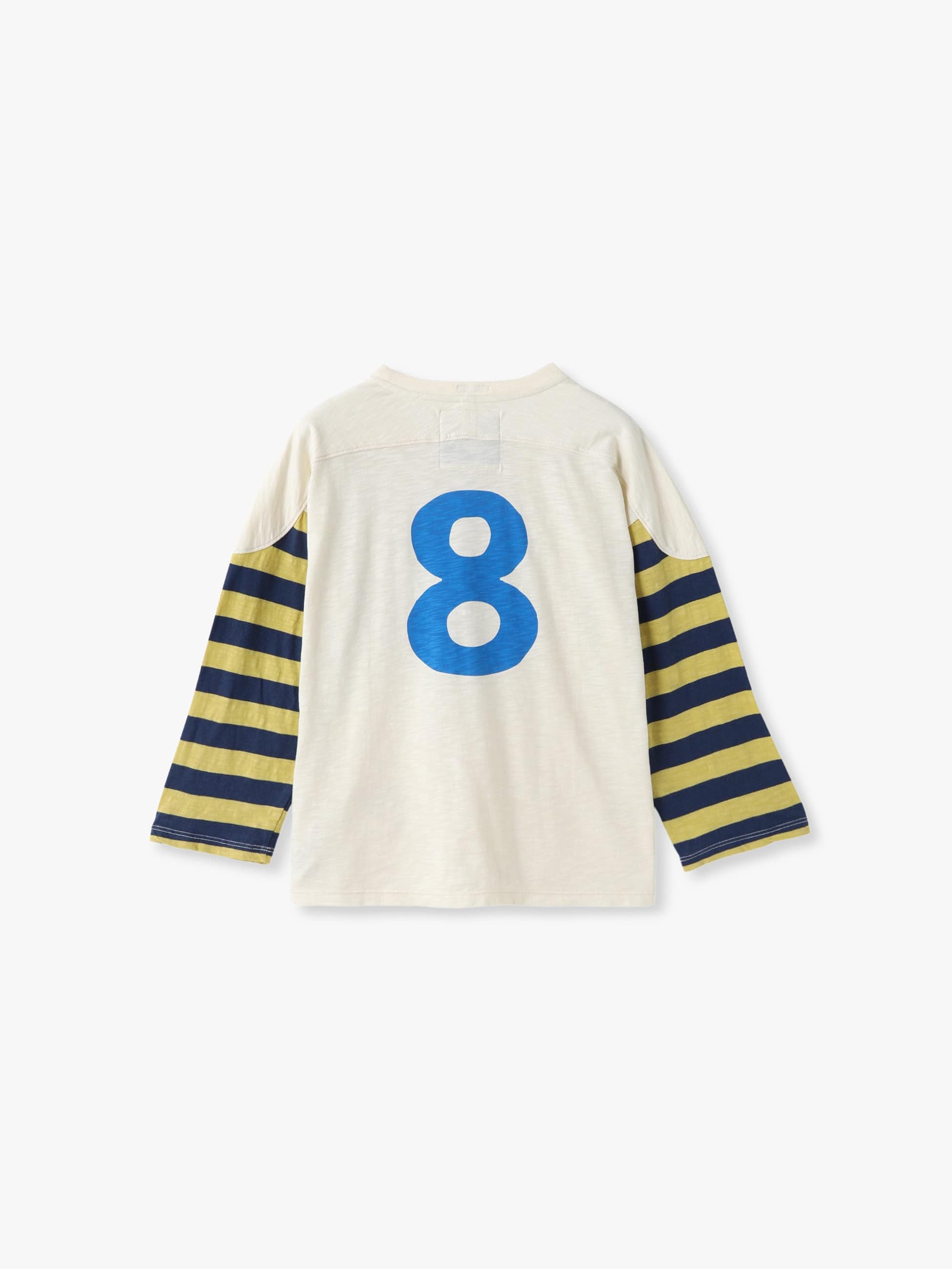 スーピマコットンを100%使用したTシャツは、オフホワイトのボディにネイビーとイエローのストライプ柄の袖がユニークで、裾のパッチもさりげないポイントに。バックには"8"のプリントが施され、やや短めの袖丈とキャップショルダーのディテール、ボックスフィットが特徴です。